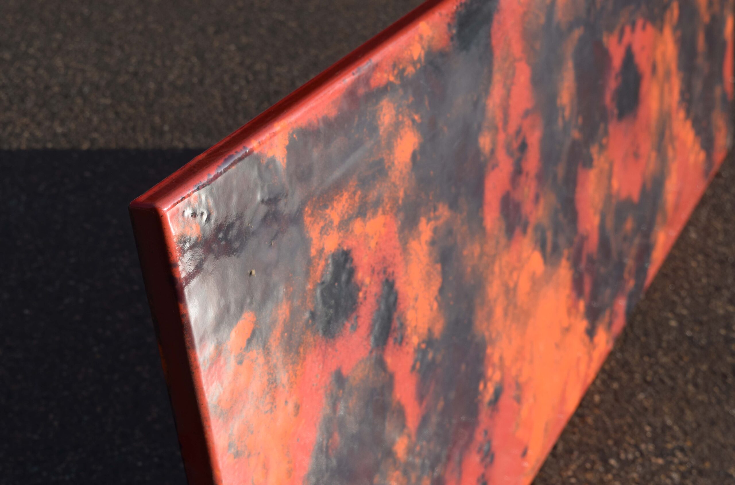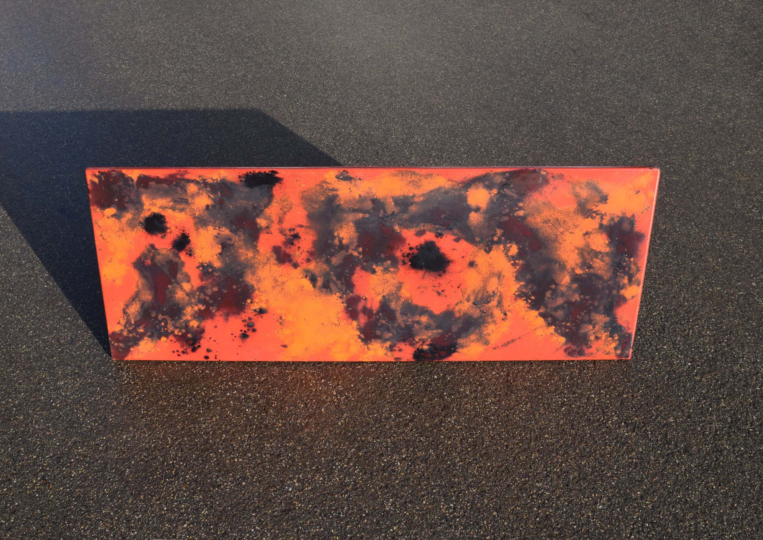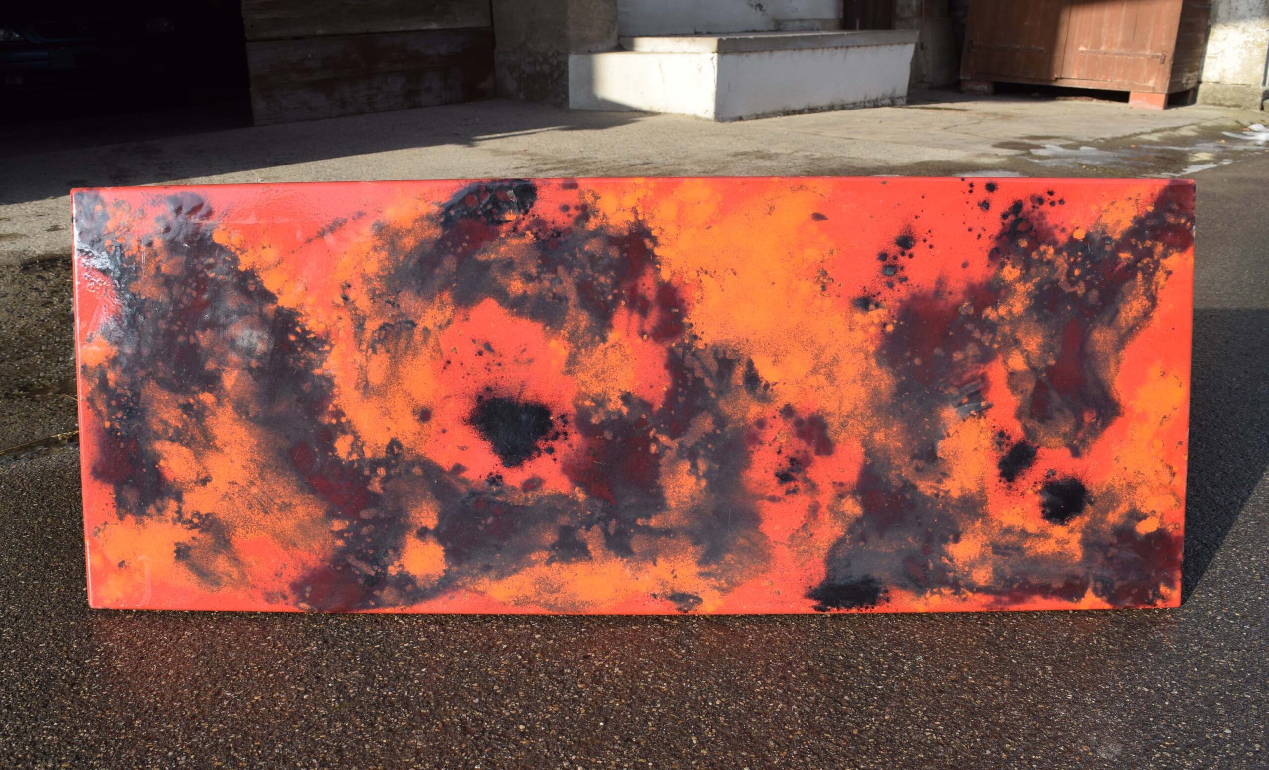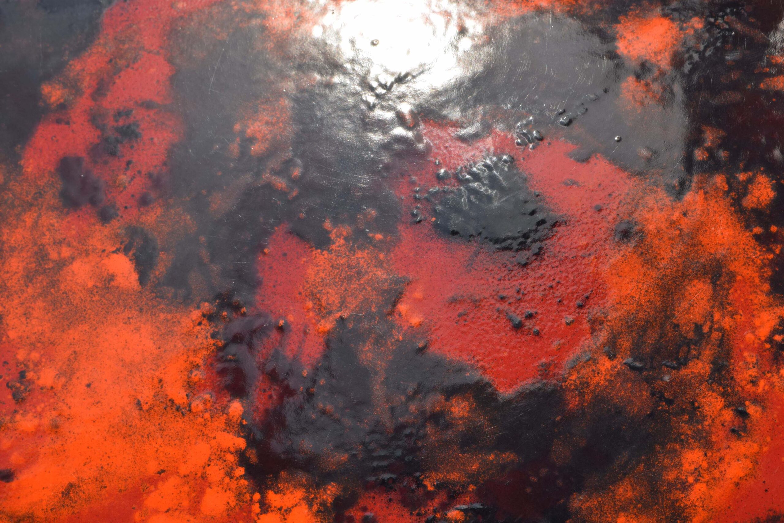 Tôle émaillée art abstrait. Curieux panneau émaillé, avec un décor dégradé de motifs formé de tâches, et de moucheté. Avec un dégradé de orange et de noir.