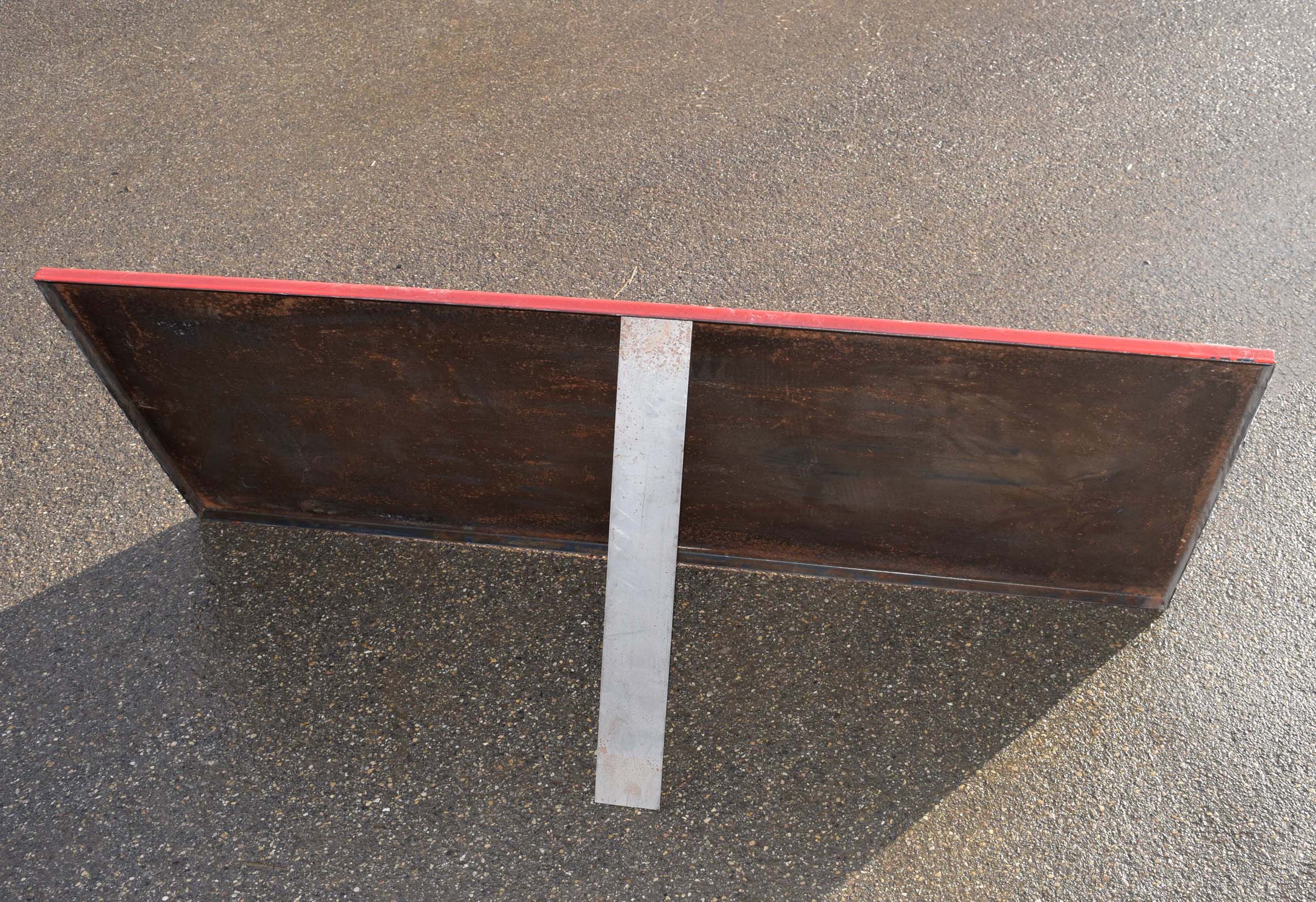 En tôle pilée, peut-être 2,5mm, (au vu du poids). Forme rectangulaire “plaque à gâteau” 130x50cm, pli épaisseur 2,5cm. Et poids 12,1kg.