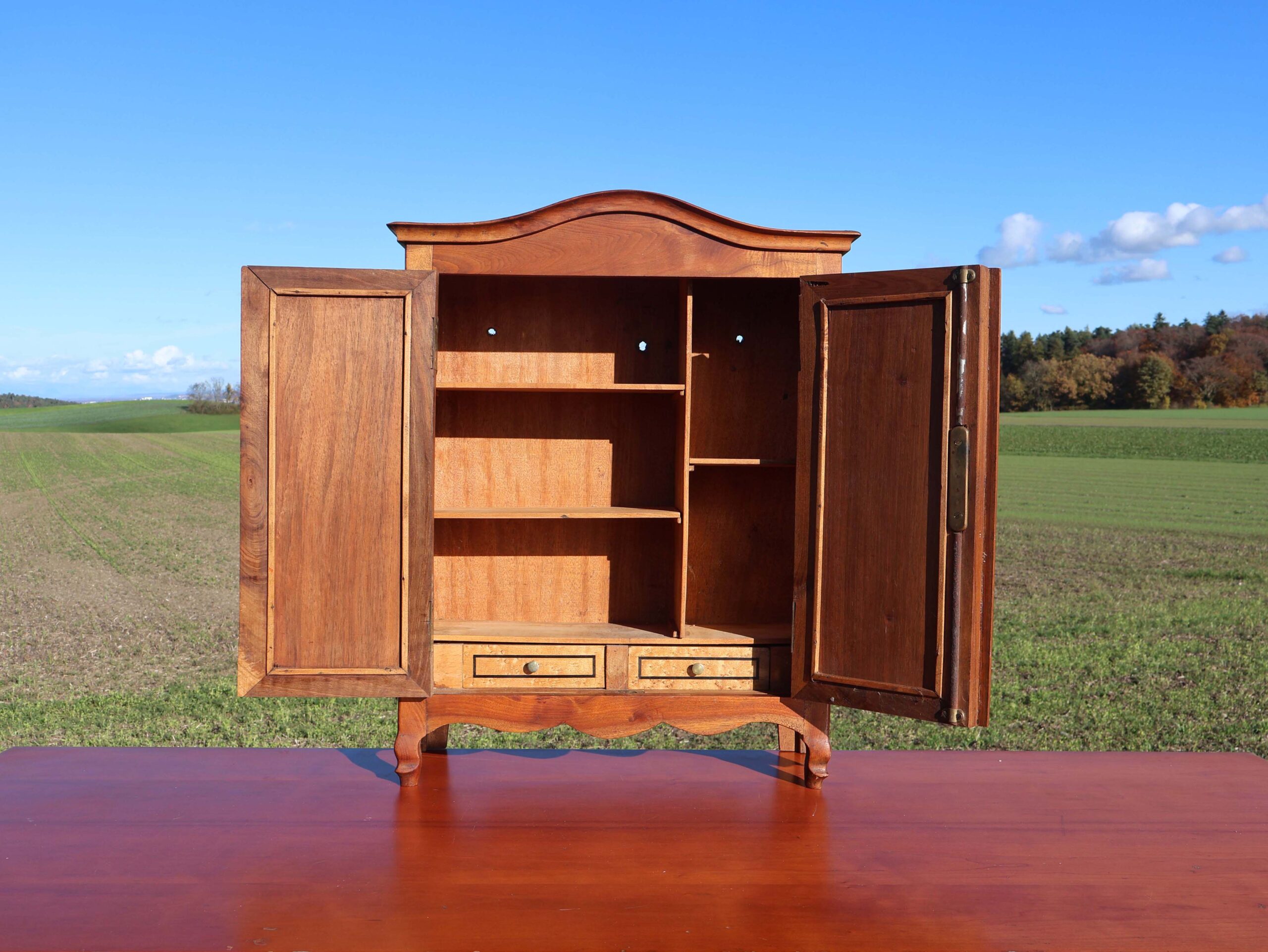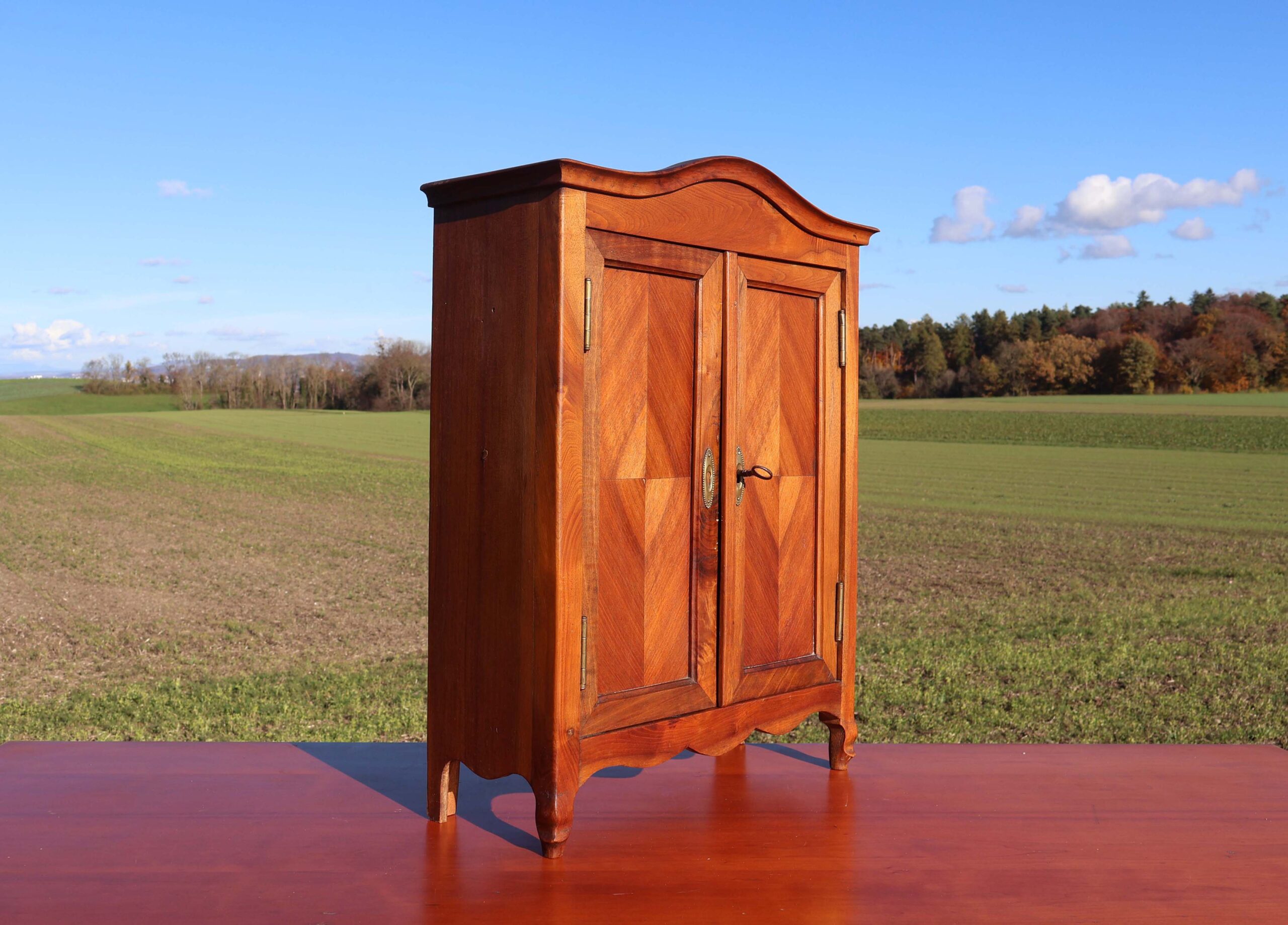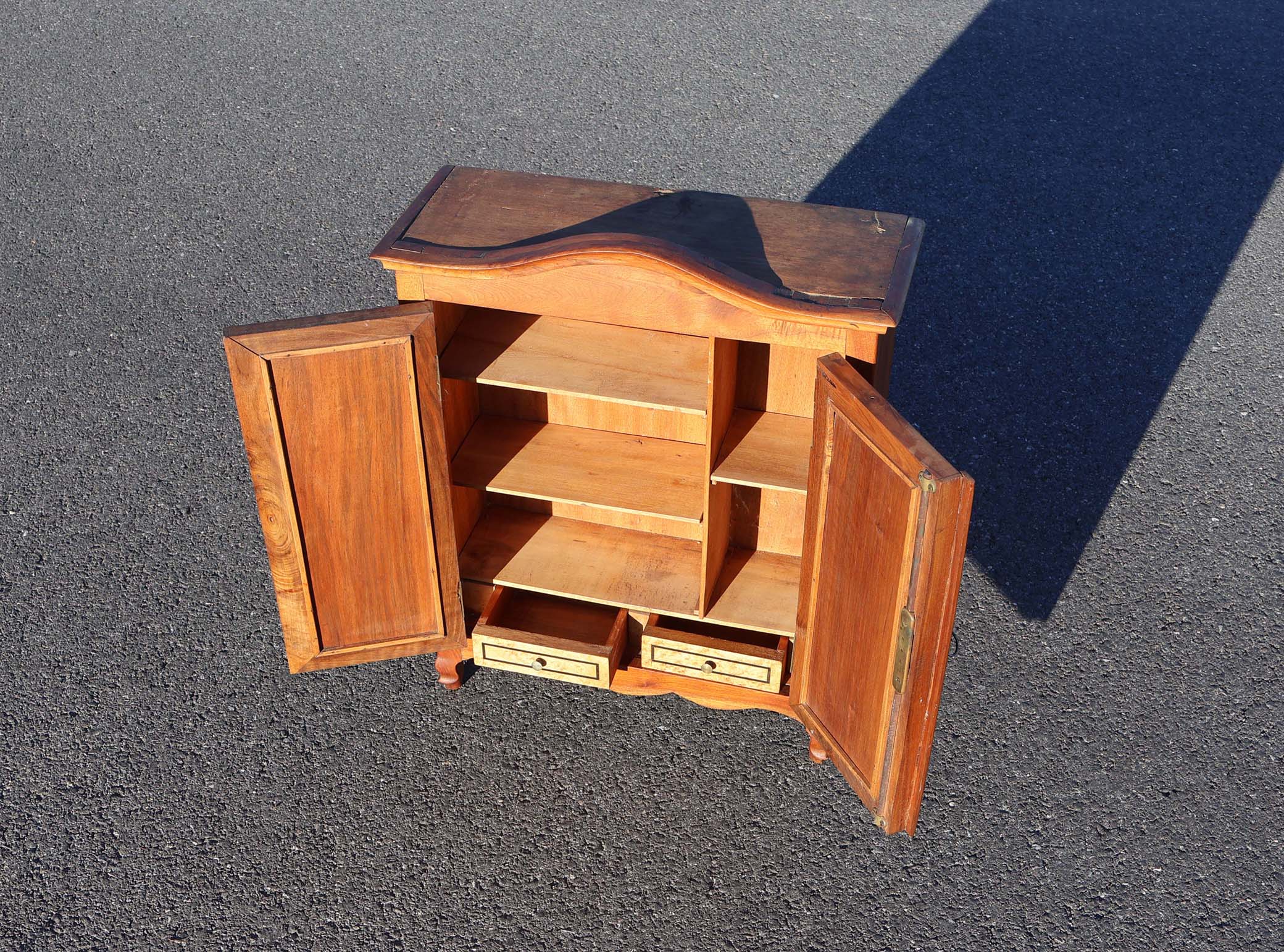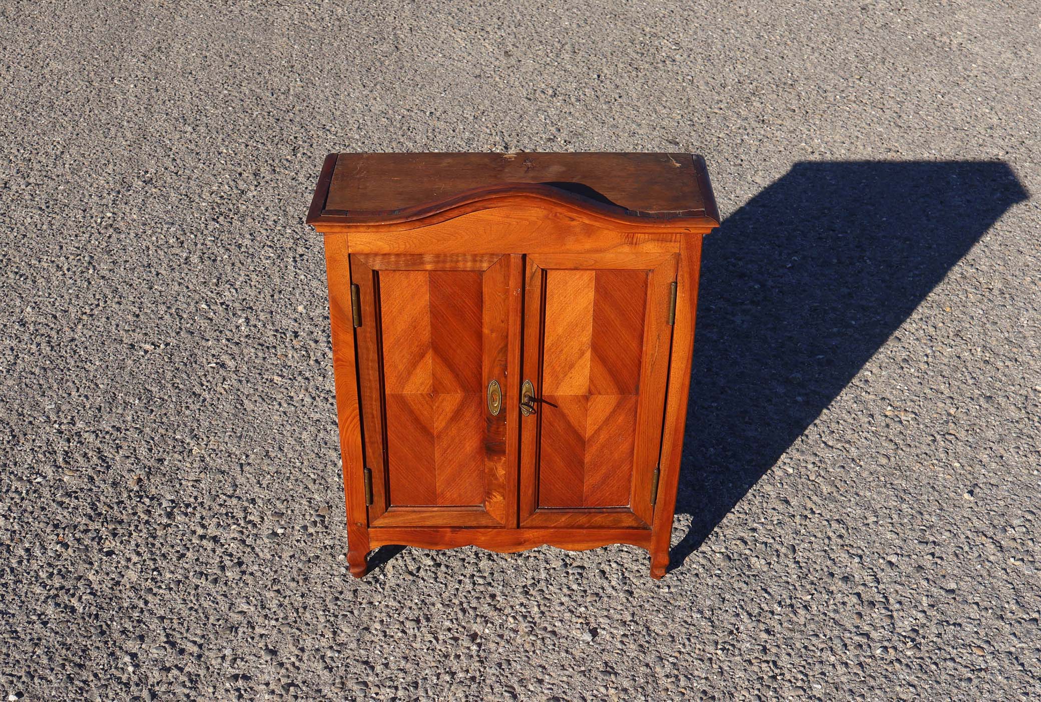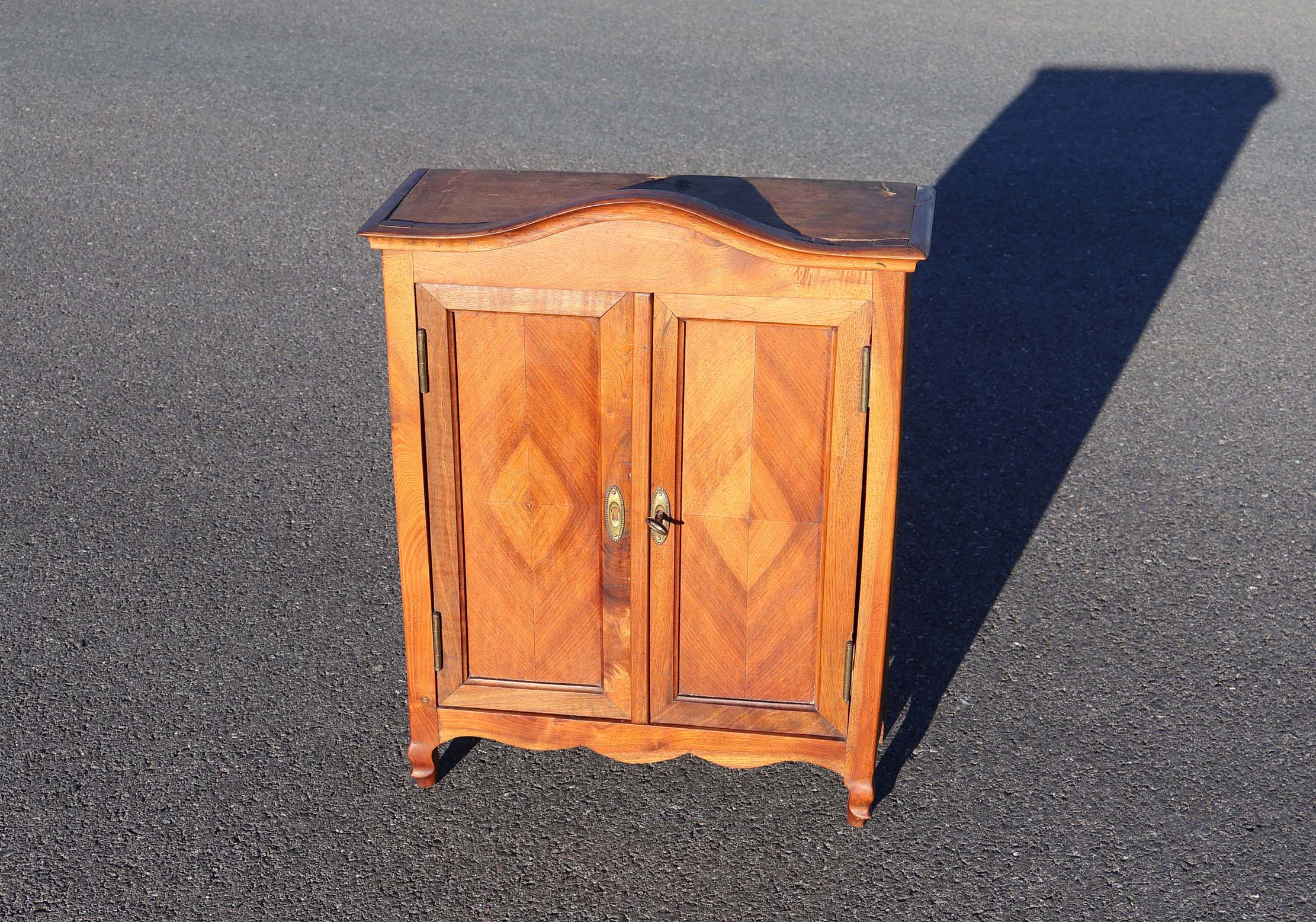 Avec des détails finement exécutés : Comme les panneaux de porte avec un décor en losange, réalisé avec le sens des veines du bois, (en plaquage). Les pieds sculptés, et 2 tiroirs intérieurs.