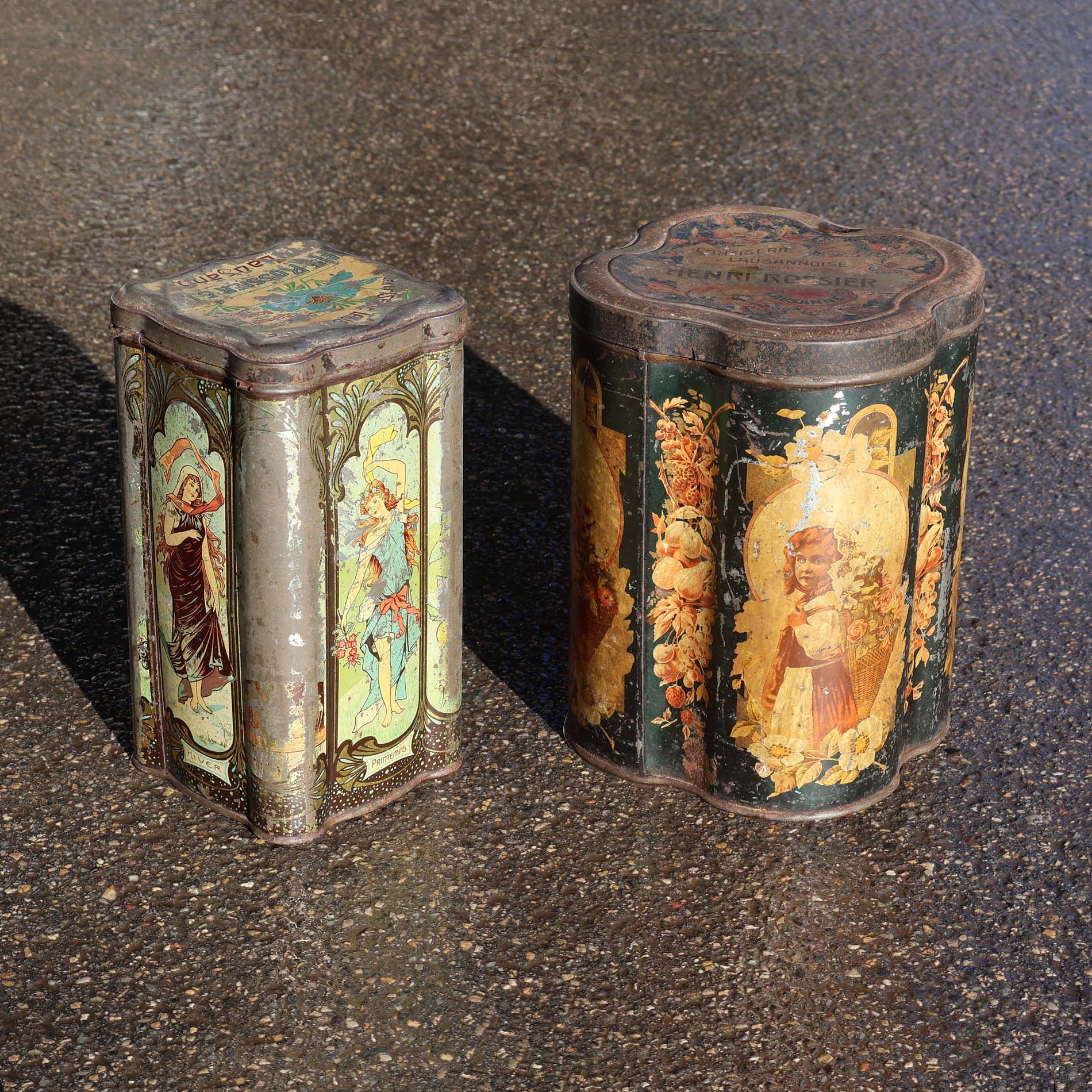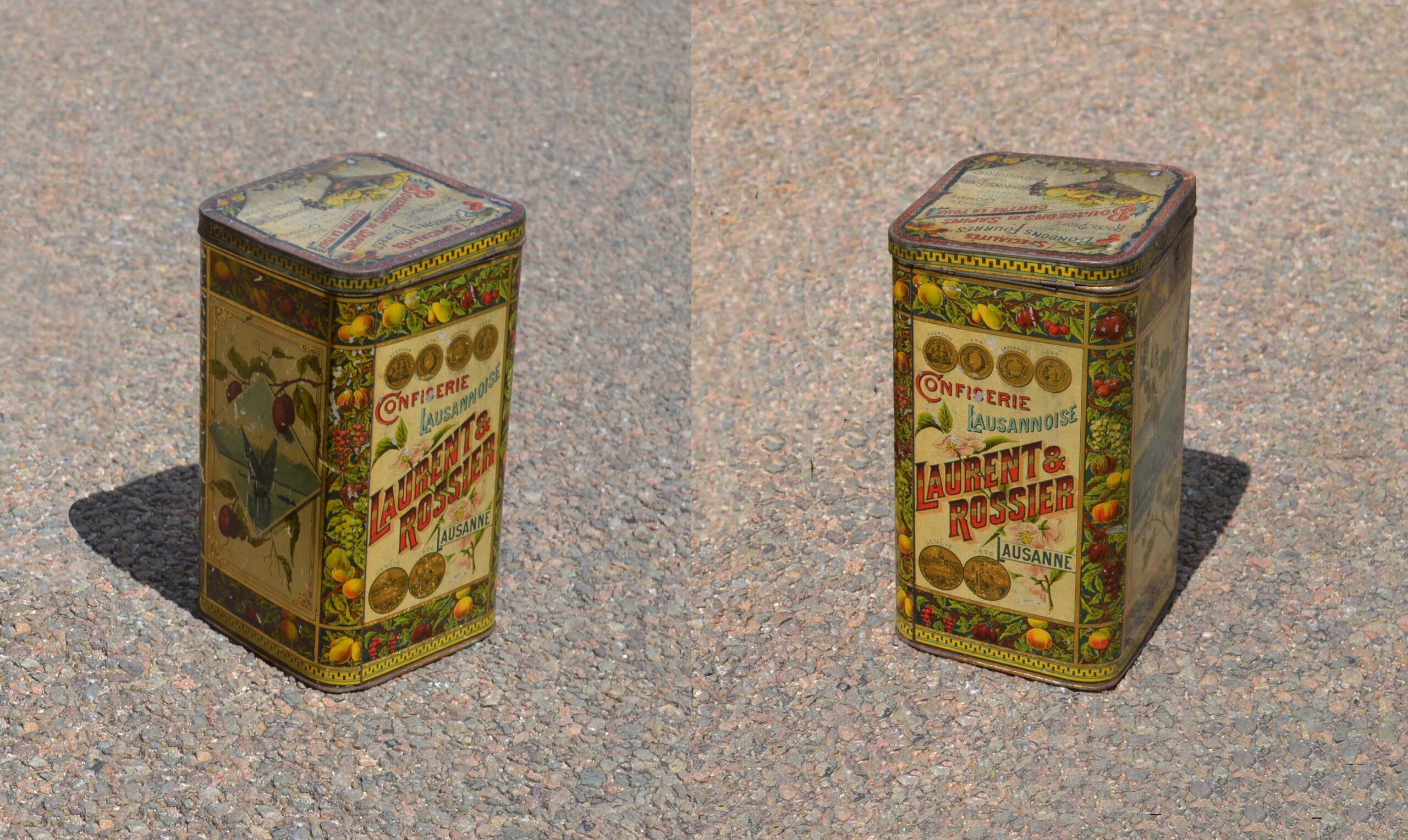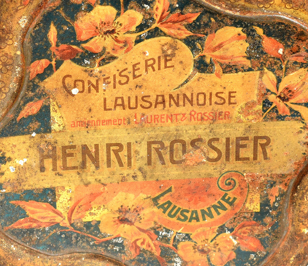 Boites Henri Rossier Lausanne. Ce sont d’anciennes boites publicitaires en tôle lithographiée. Éditées par la confiserie Lausannoise Henri Rossier. Anciennement Laurent et Rossier.