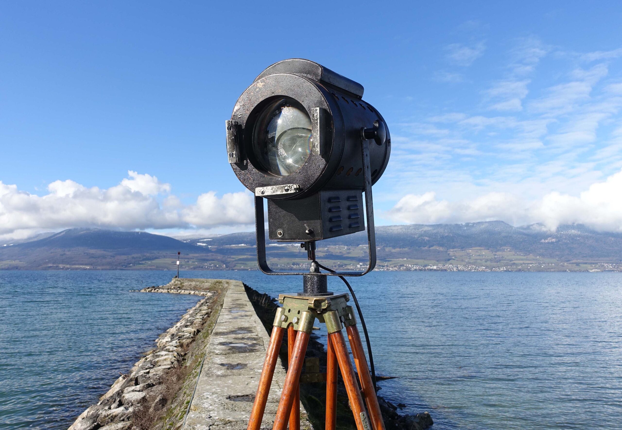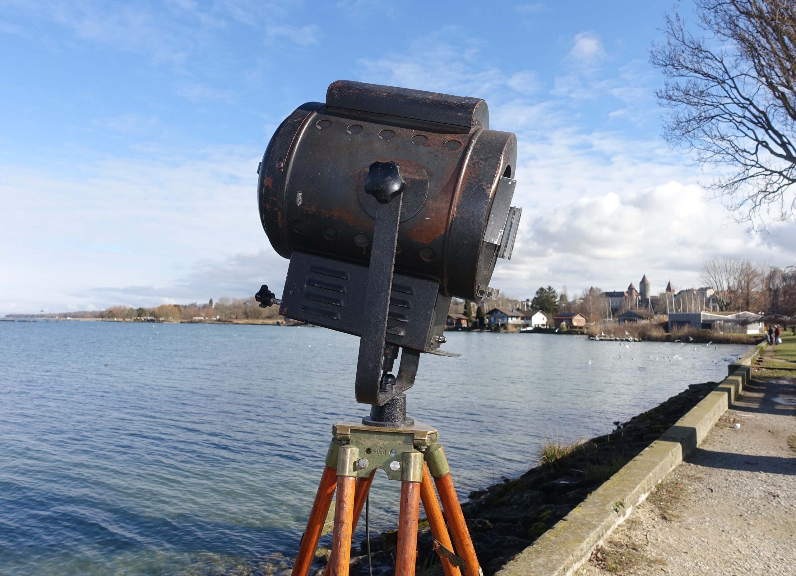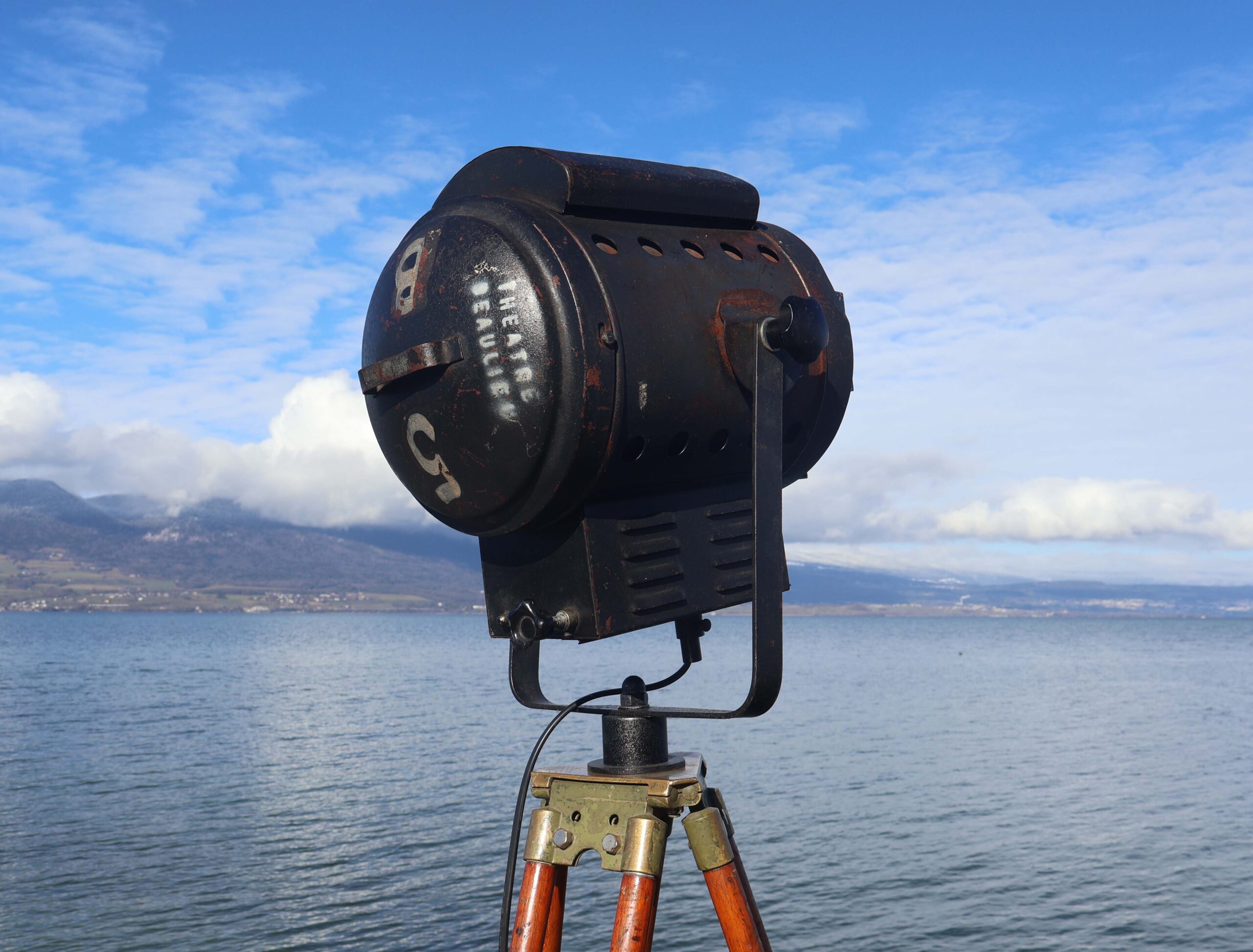 Pour le projecteur, j’ignore la marque, car il n’a pas de label. D’après la forme, des années 1950. Ce qui fait son intérêt, c’est qu’il provient du théâtre de Beaulieu à Lausanne, (marquage à l’arrière).