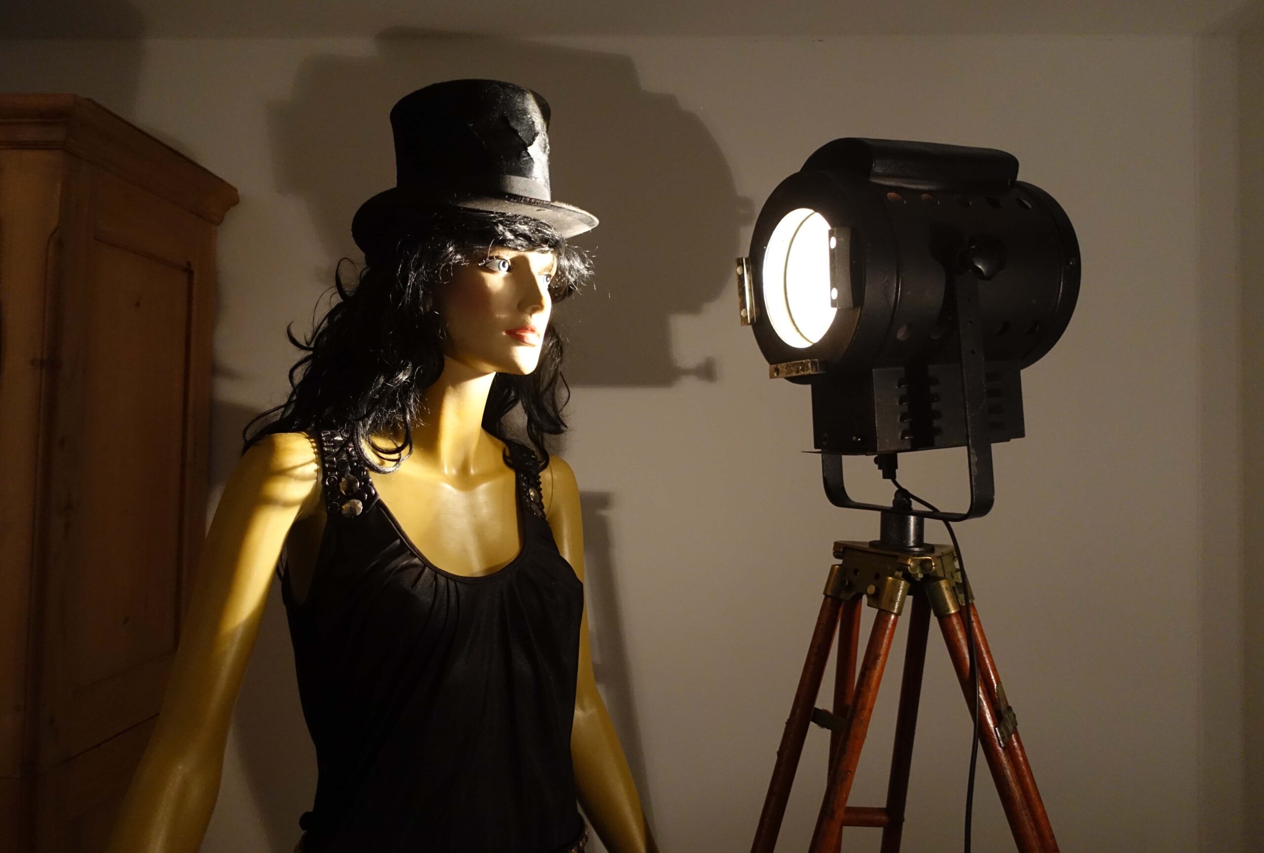 Ancien projecteur sur trépied. C’est un vieux projo lumière de spectacle, que j’ai fixé sur un trépied de géomètre vintage en bois. Pour le recycler en luminaire décoratif.