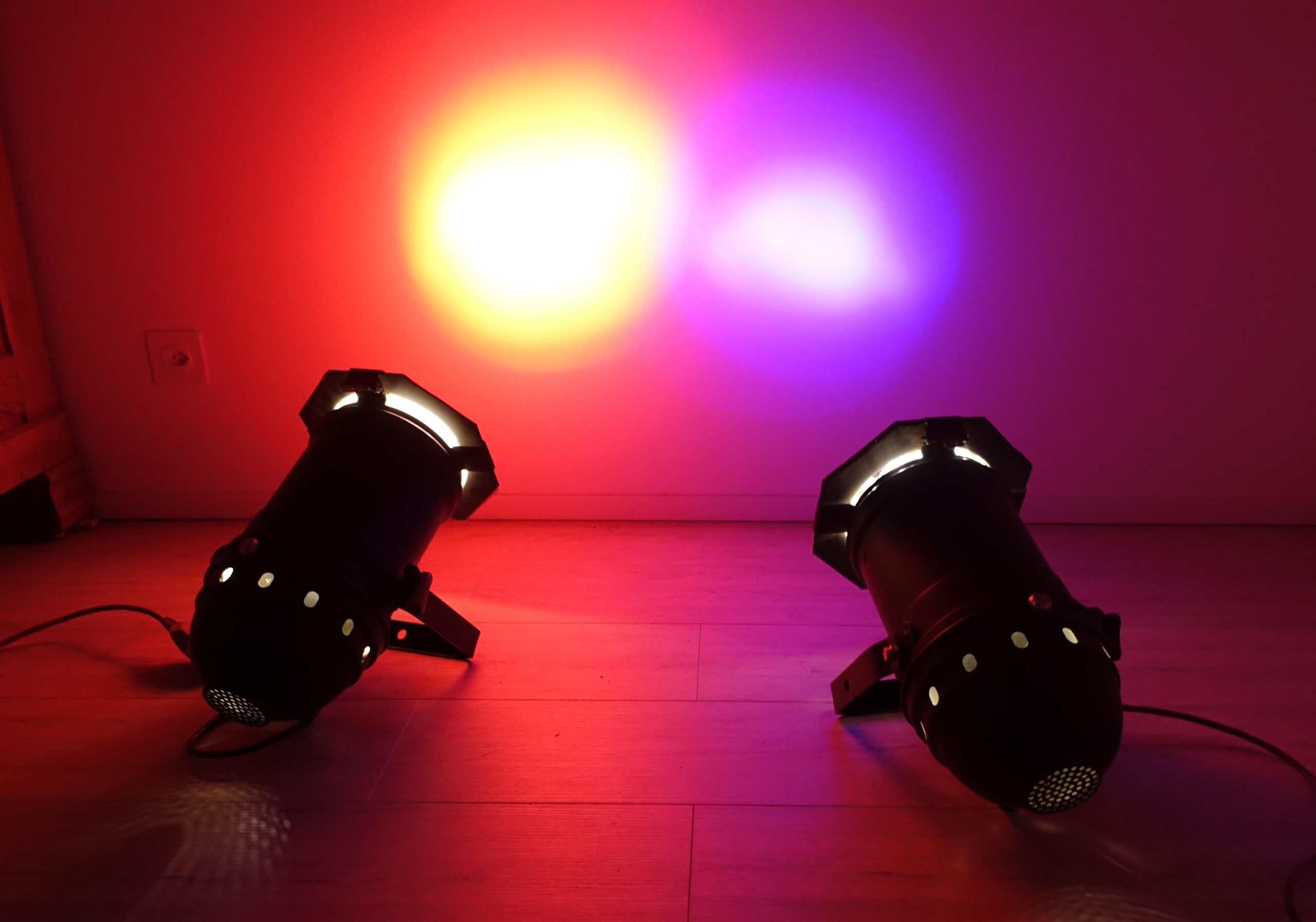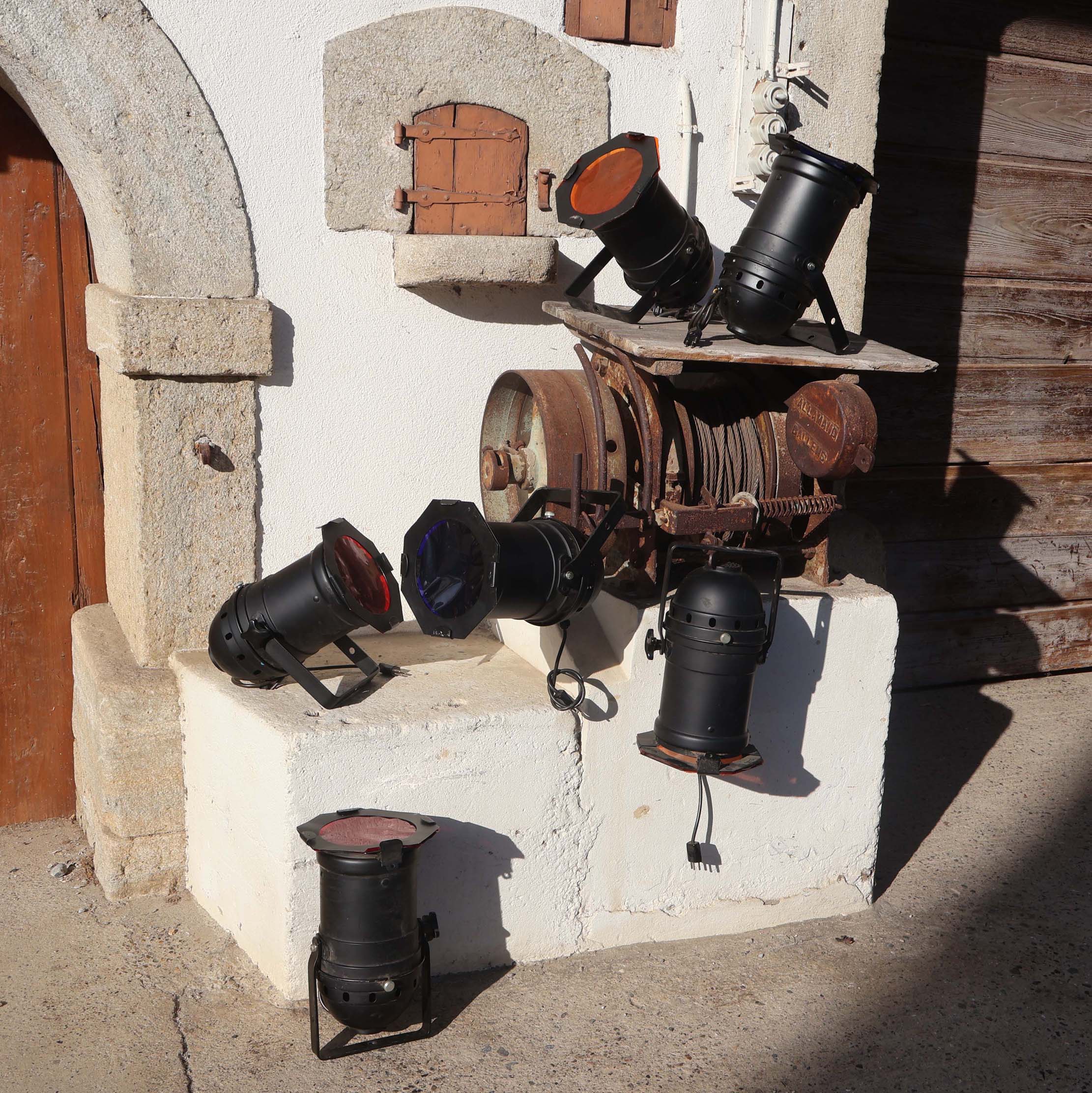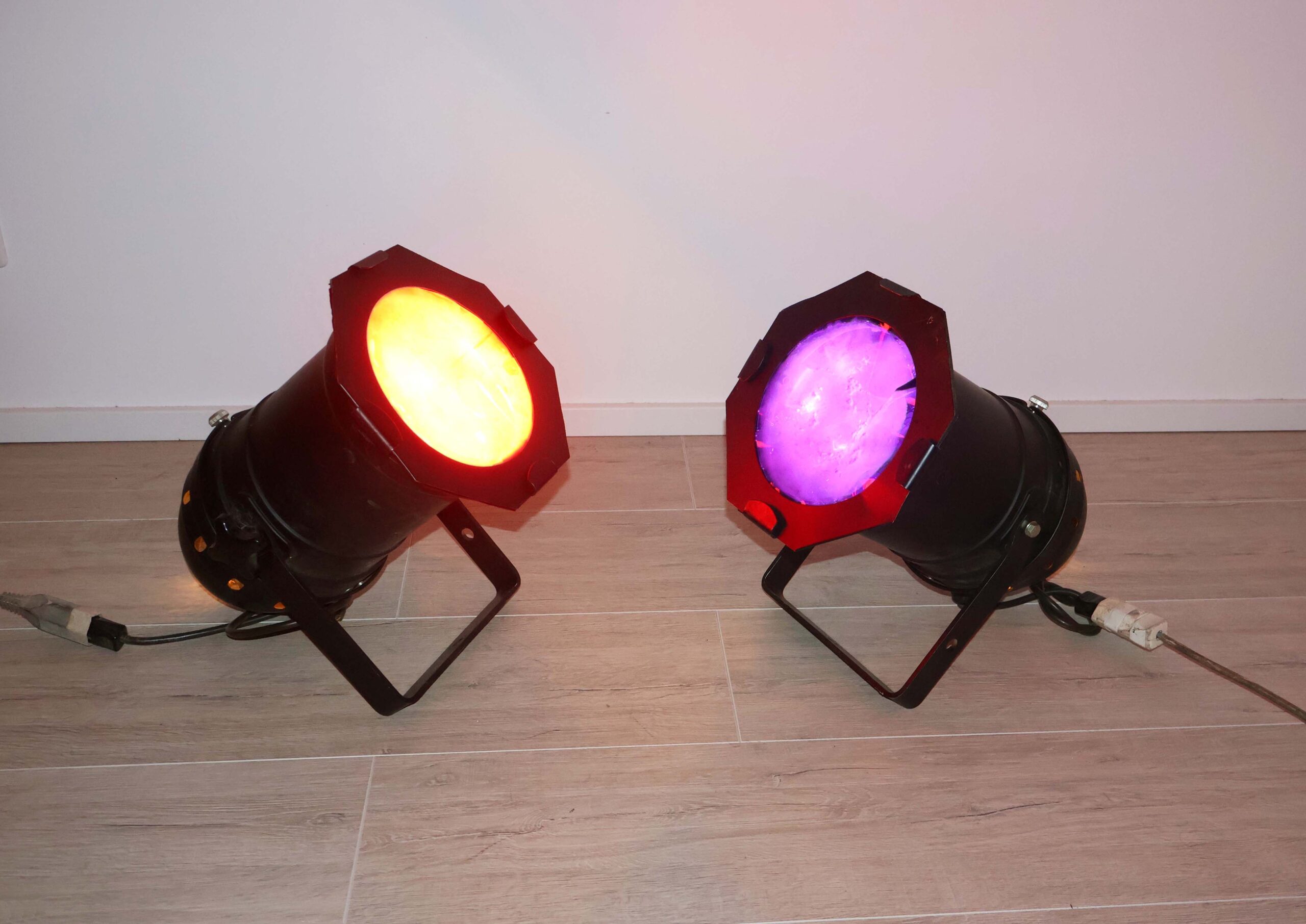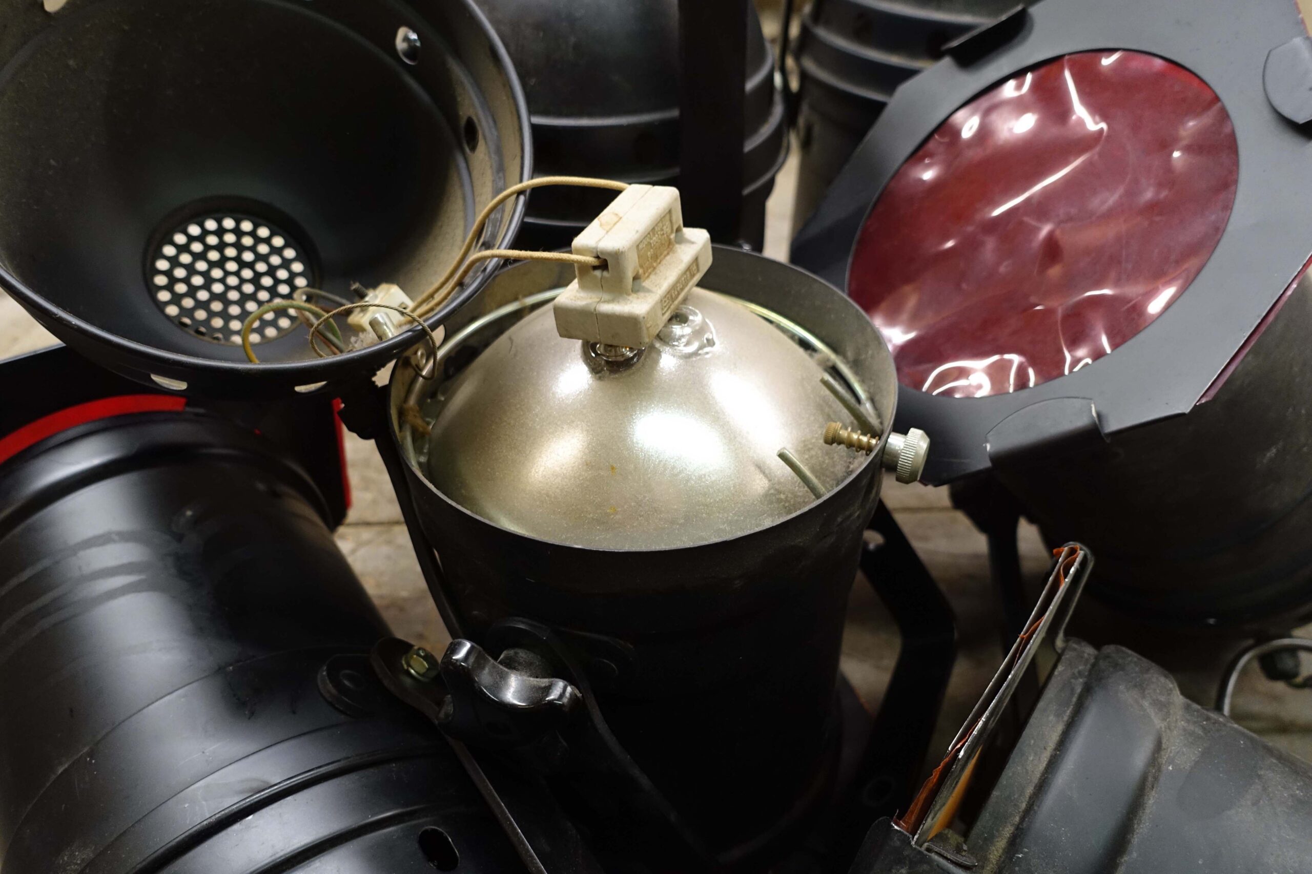 Pour ceux-ci, c’est le vieux modèle en halogène, (actuellement remplacé en LED). Avec des ampoules General Electric, probablement de 1000W. Et des porte-filtres amovibles de forme octogonale, avec filtres sous la forme de feuilles de plastique multicolore.