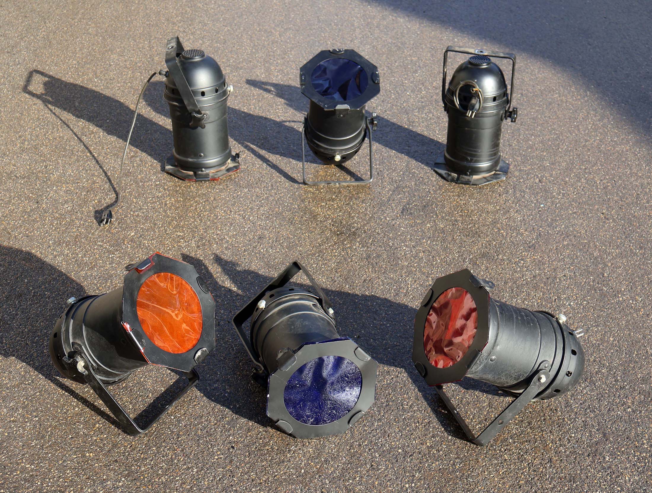 Projecteurs PAR 64 vintage. Lot de 6 projecteurs scéniques. Modèle appelé “PAR-64”. PAR, étant l’abréviation de parabolique, et 64 étant la dimension en pouces. Projos très populaires dans l’industrie du spectacle. C’est un modèle basique, connu de tous les éclairagistes.