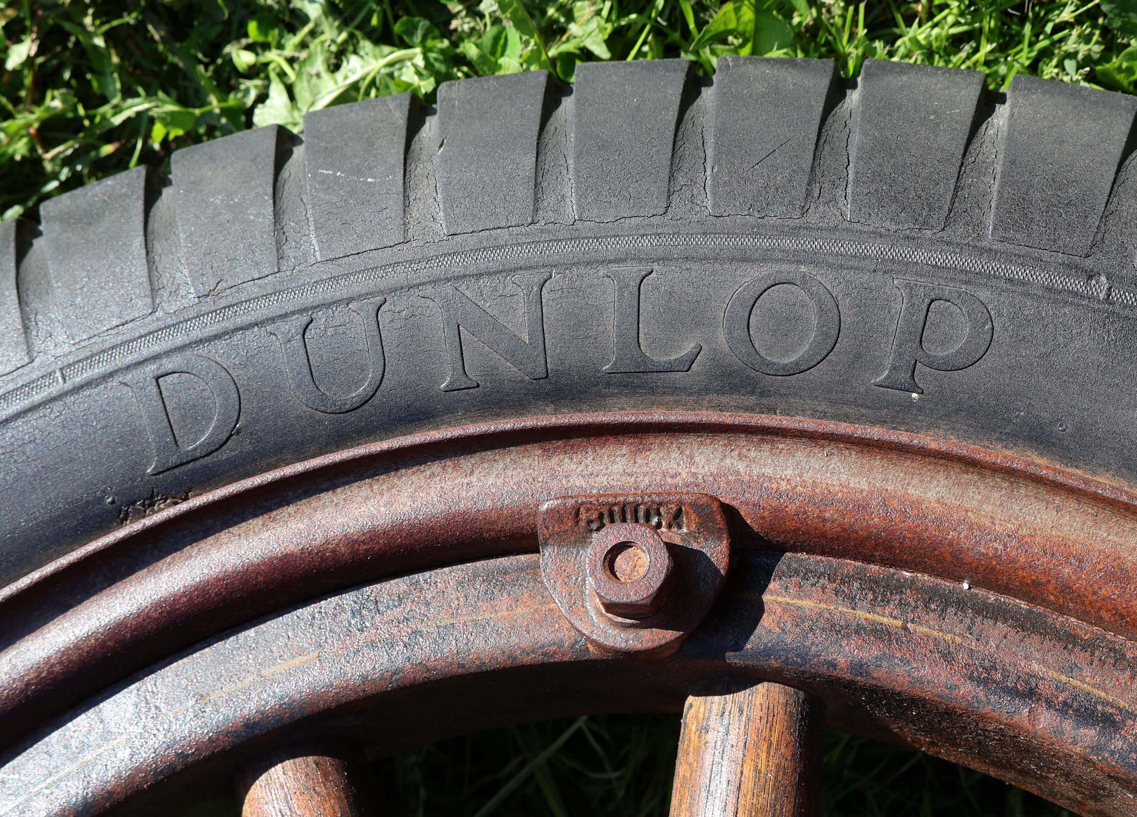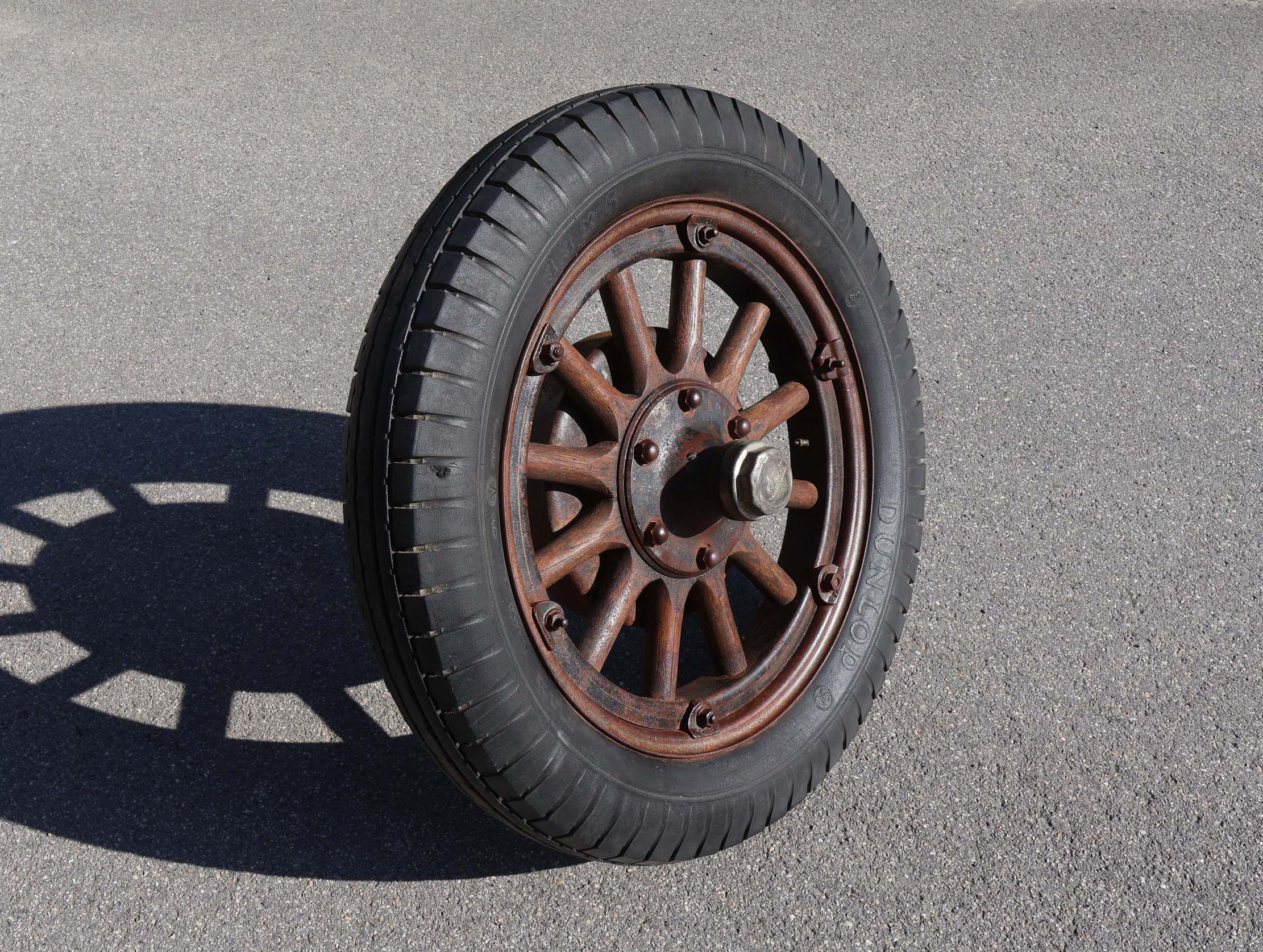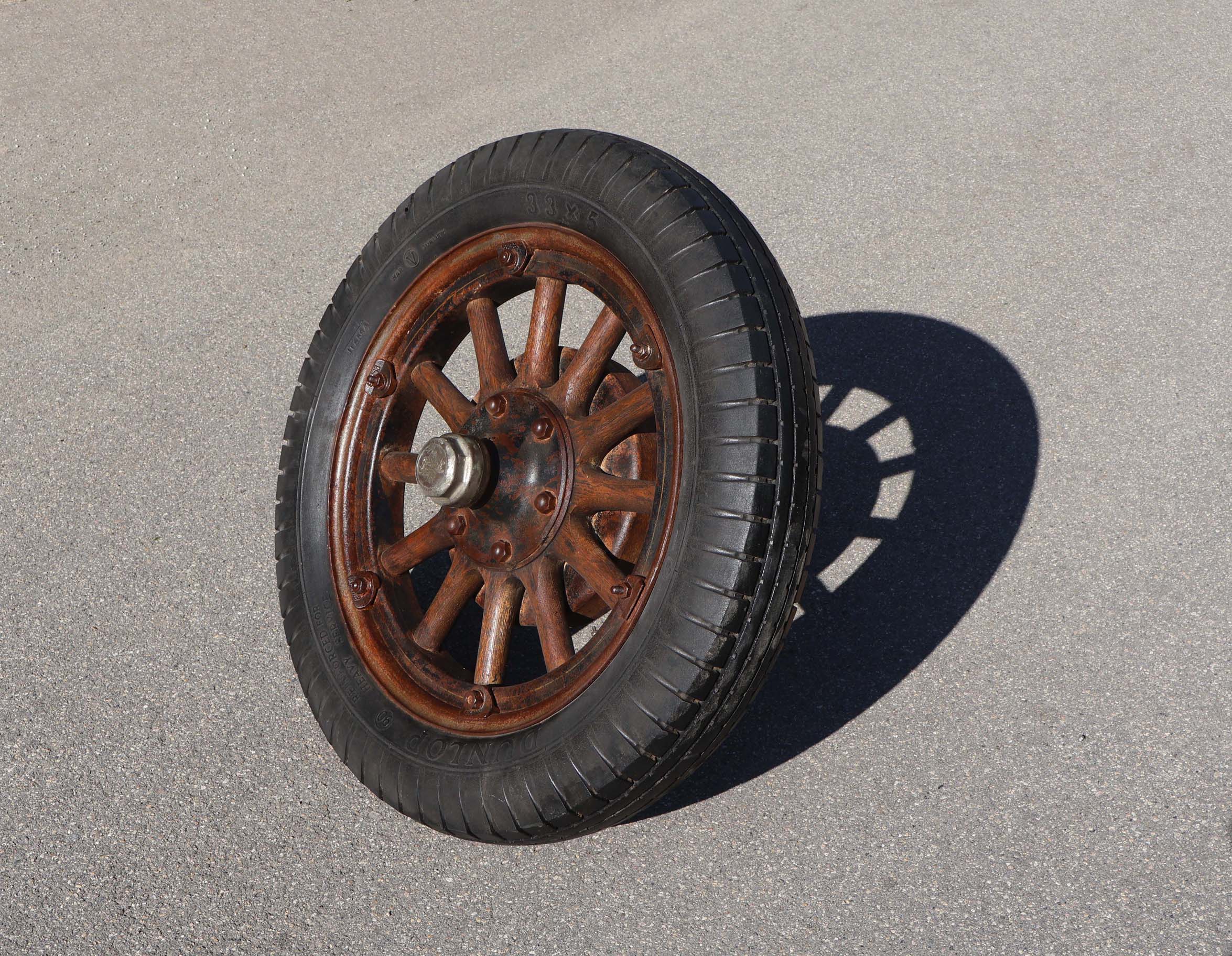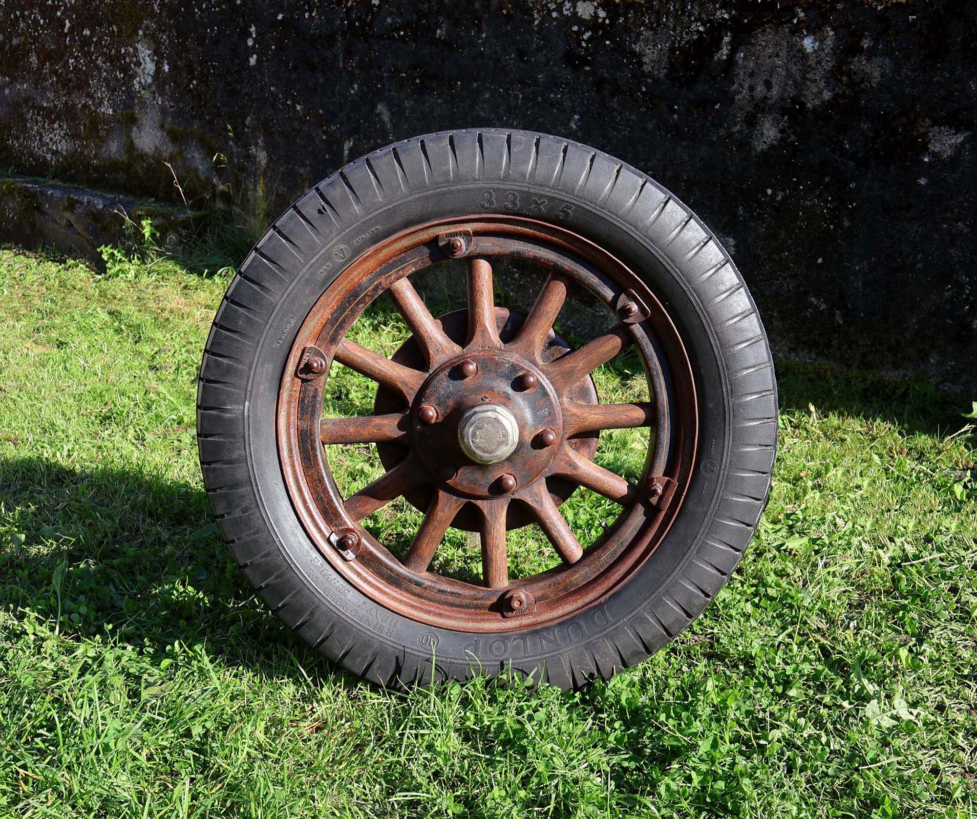 Jante en acier, avec des rayons en bois. Chaussée d’un pneu Dunlop. J’ai brossé un peu la jante, mis de la lasure sur les rayons, et fait un vernis incolore sur le tout. Pour stabiliser et raviver les couleurs. Donc en état d’origine, avec belle patine rouille.