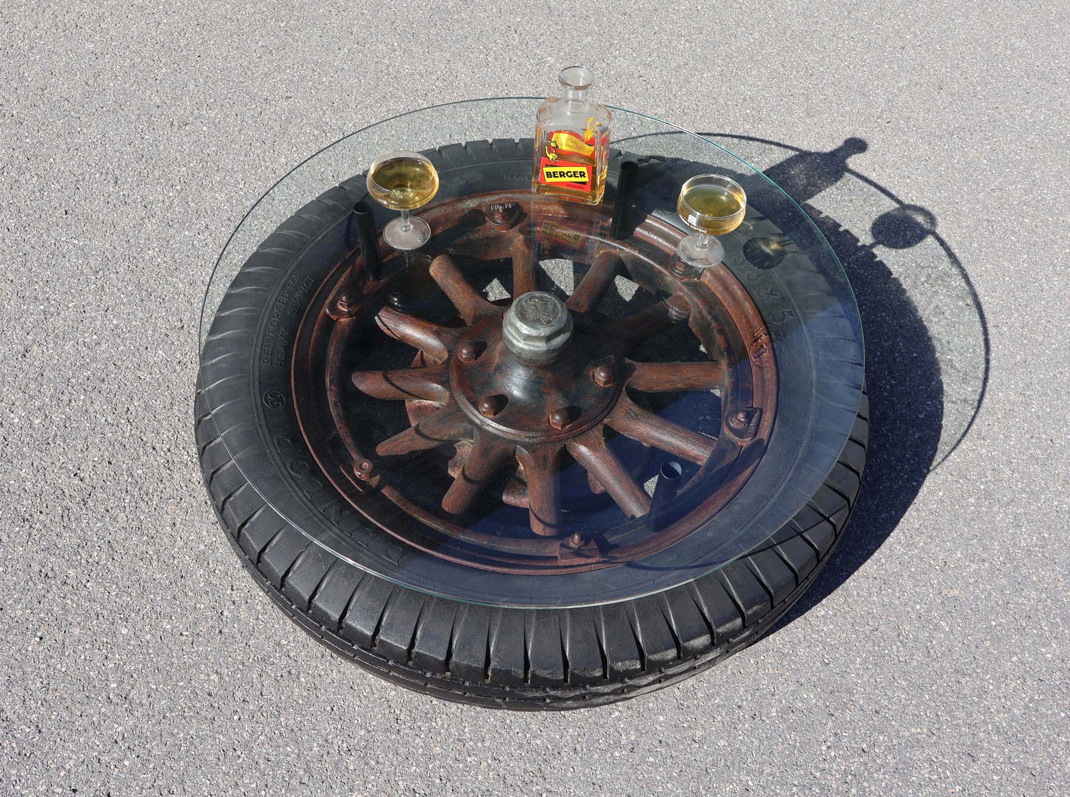 Table basse roue automobile 1920s : C’est un assemblage, (non finalisé). Pour créer une “coffee table”, avec une roue de voiture Buick. D’un modèle qui devrait dater entre 1925 et 1928, (d’après les photos que j’ai vues).