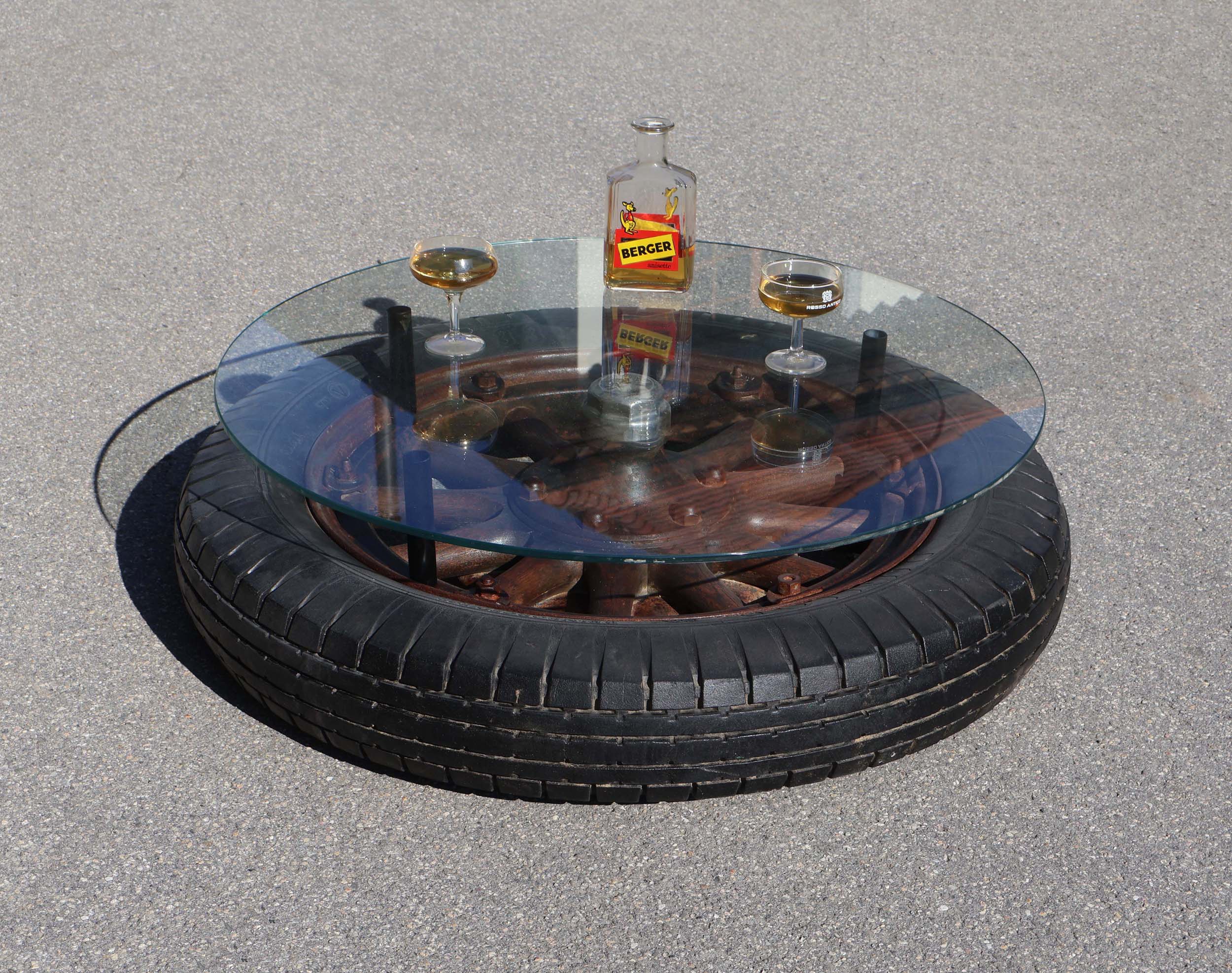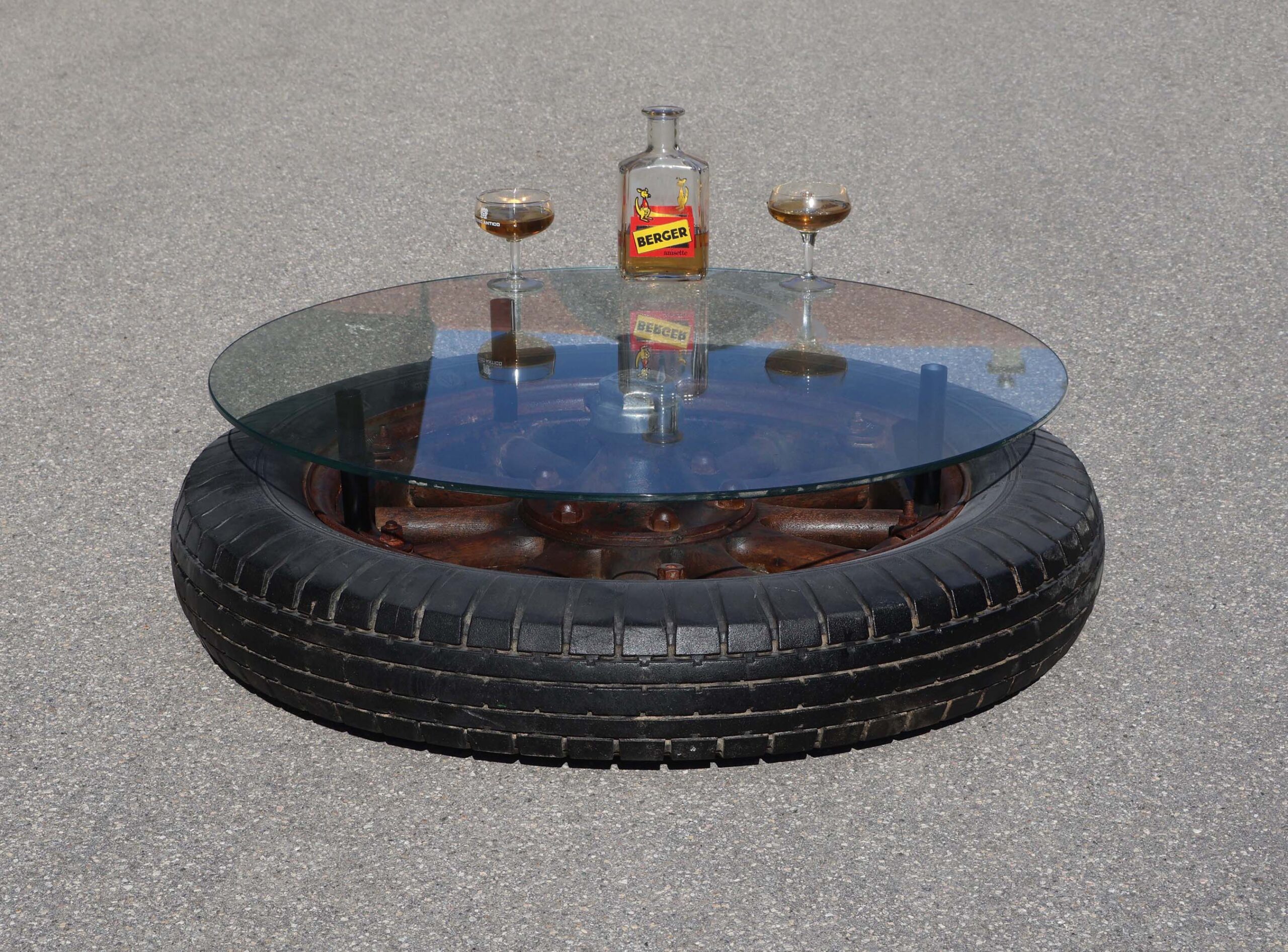 Accueil » Antiquités & Mobilier industriel » Meubles de métiers & industriels » Table basse roue automobile