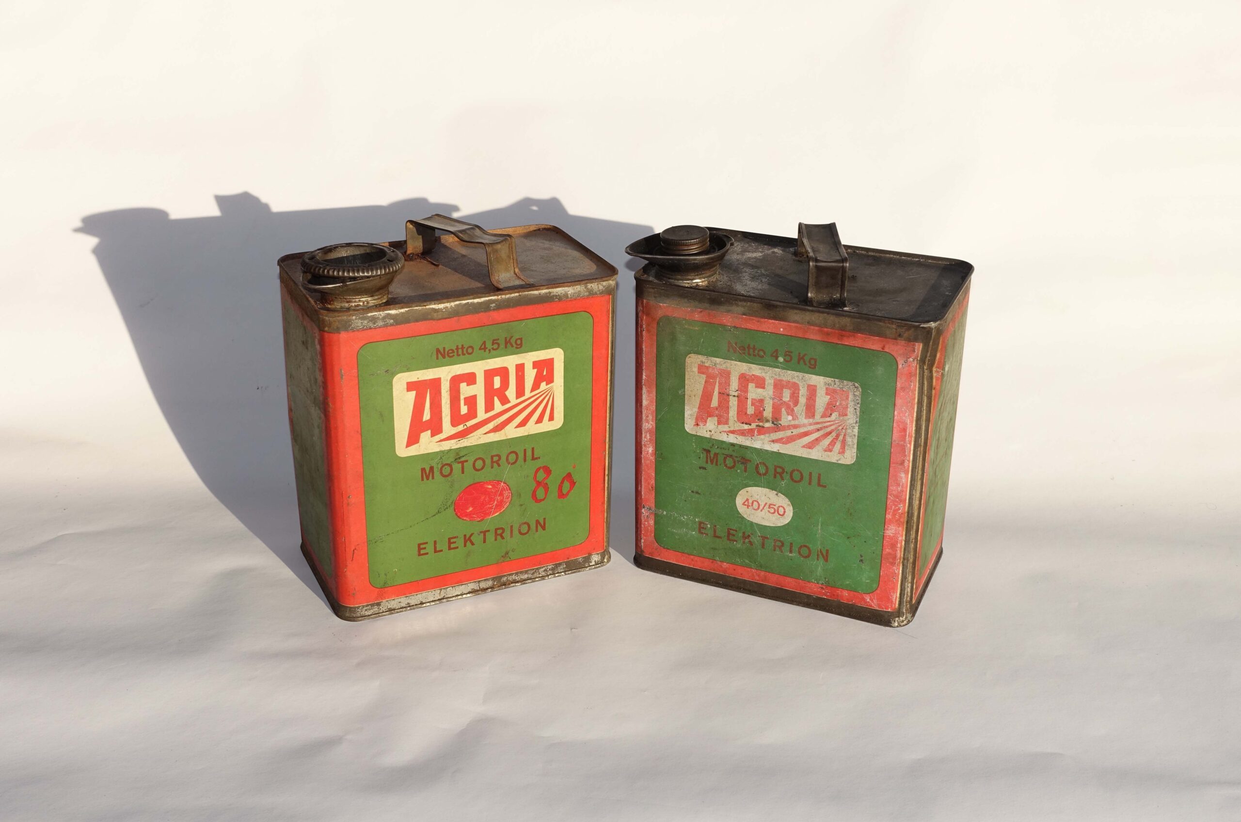 Agria bidons d’huile 1950 : Ce sont 2 bidons d’huile d’un contenance de 4,5kg. Pour la marque Suisse de machines agricoles “Agria”.
