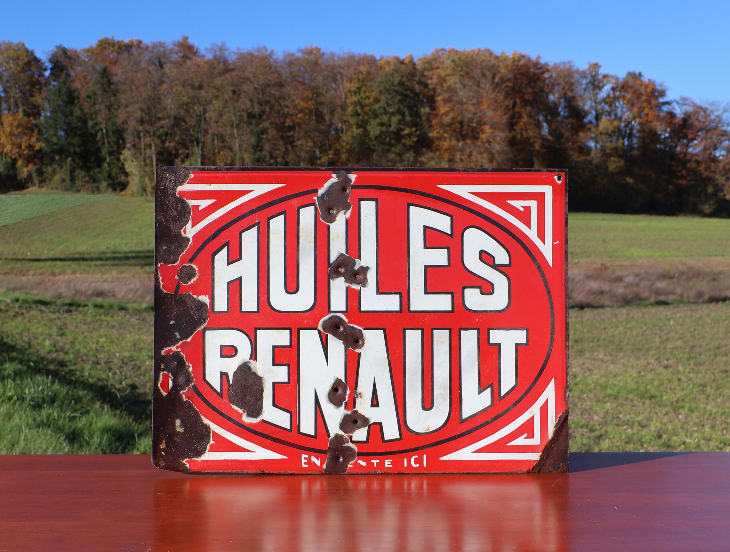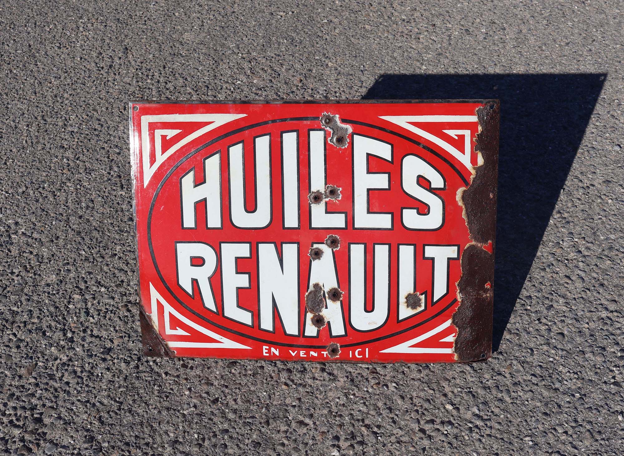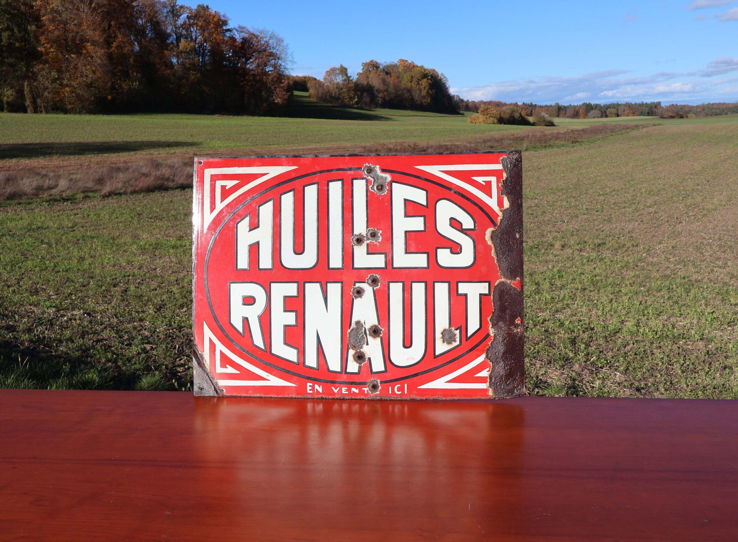 Plaque émaillée huile Renault. Ancienne tôle émail publicitaire, vers 1930, d’un garage revendeur de bidons de l’huile Renault.