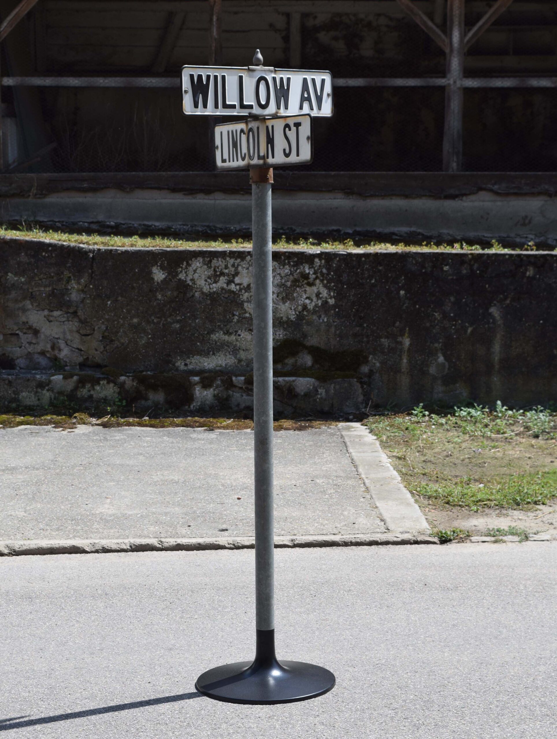 Plaques émaillées fond blanc, avec bordure et lettrage en relief noir. J’ai fixé cet assemblage sur un poteau en tube acier zingué de 60mm. Que j’ai soudé sur un socle évasé de 45cm de diamètre. En fonte, peint en noir.