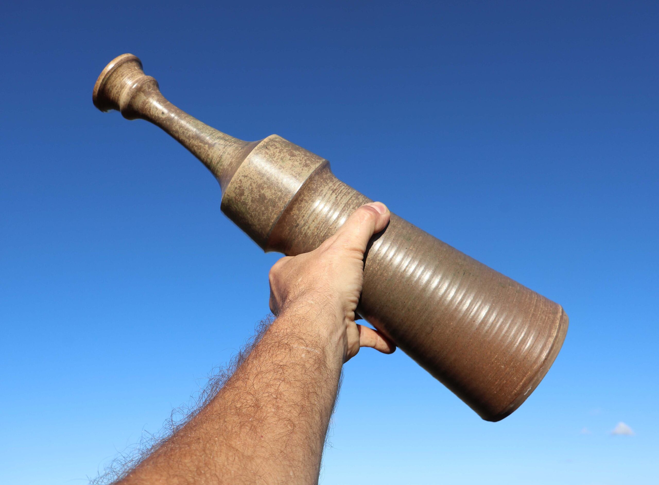 Assez lourd, diamètre au bas 11cm, diamètre au niveau du col 5,5cm et hauteur 42cm.