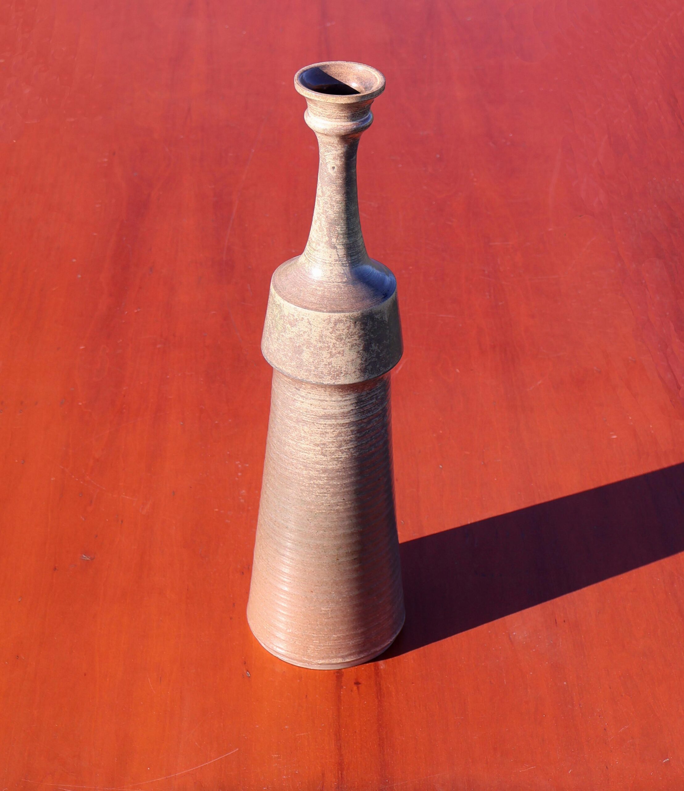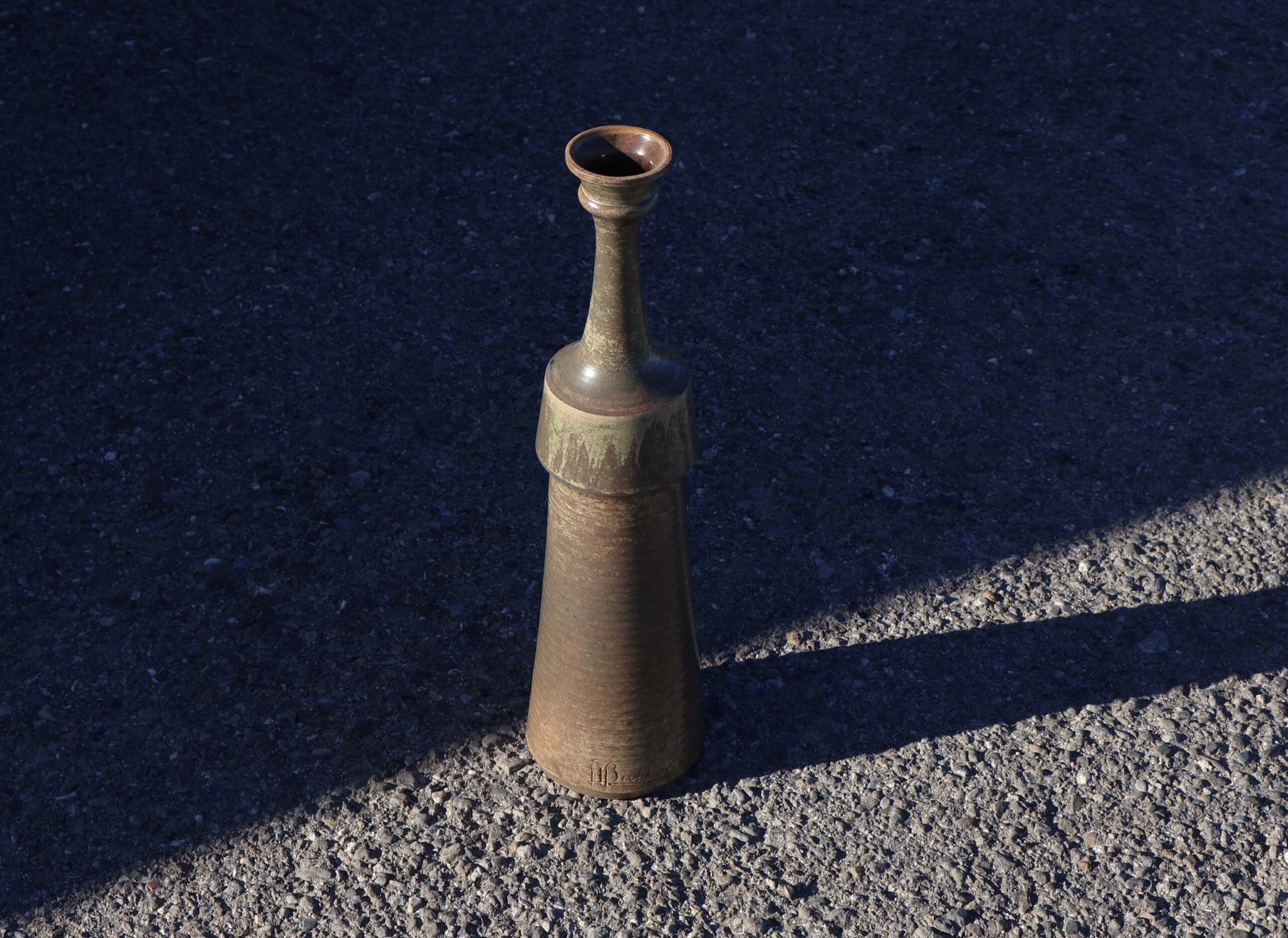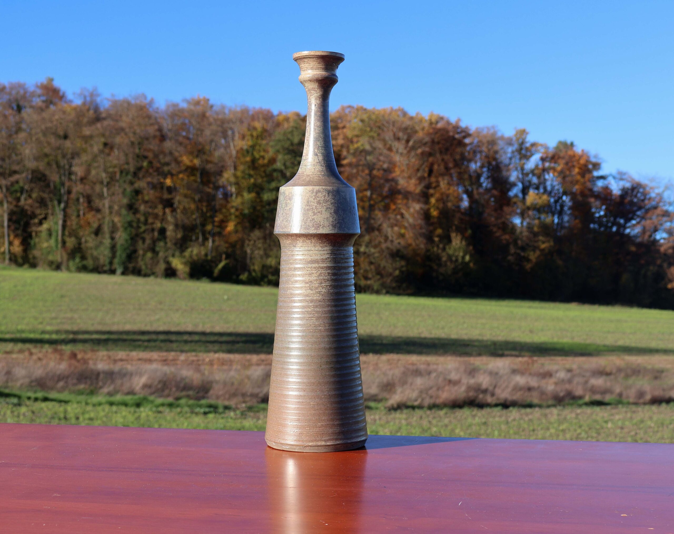 Vase Alain Bresson 1970s. Beau grand vase soliflore, avec un tournage fin, d’une grande maîtrise. Émaillage, avec des teintes brunes-beiges, qui fait penser aux années 1970.