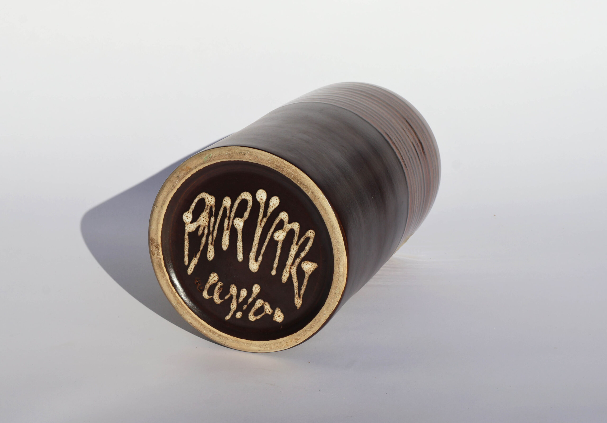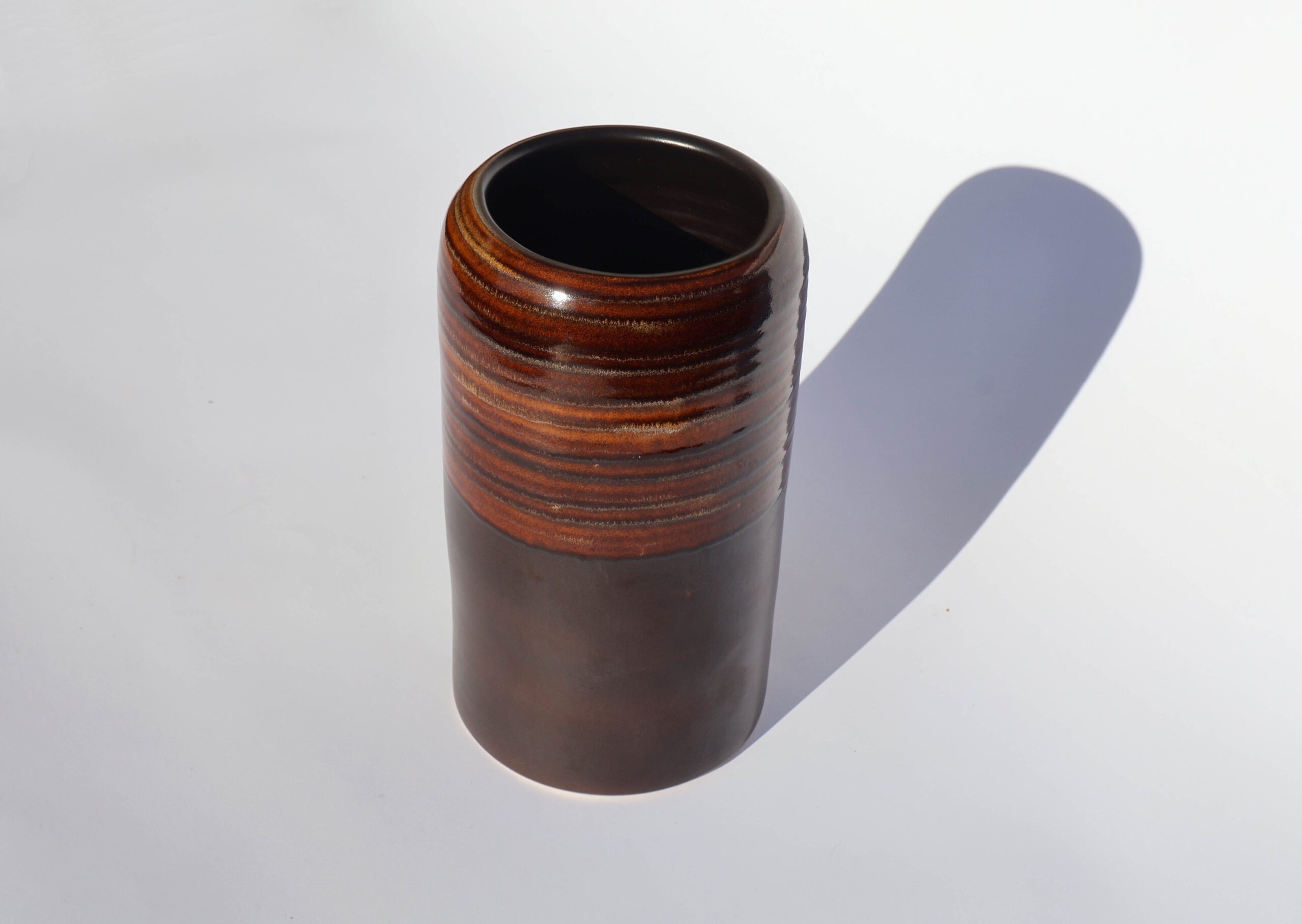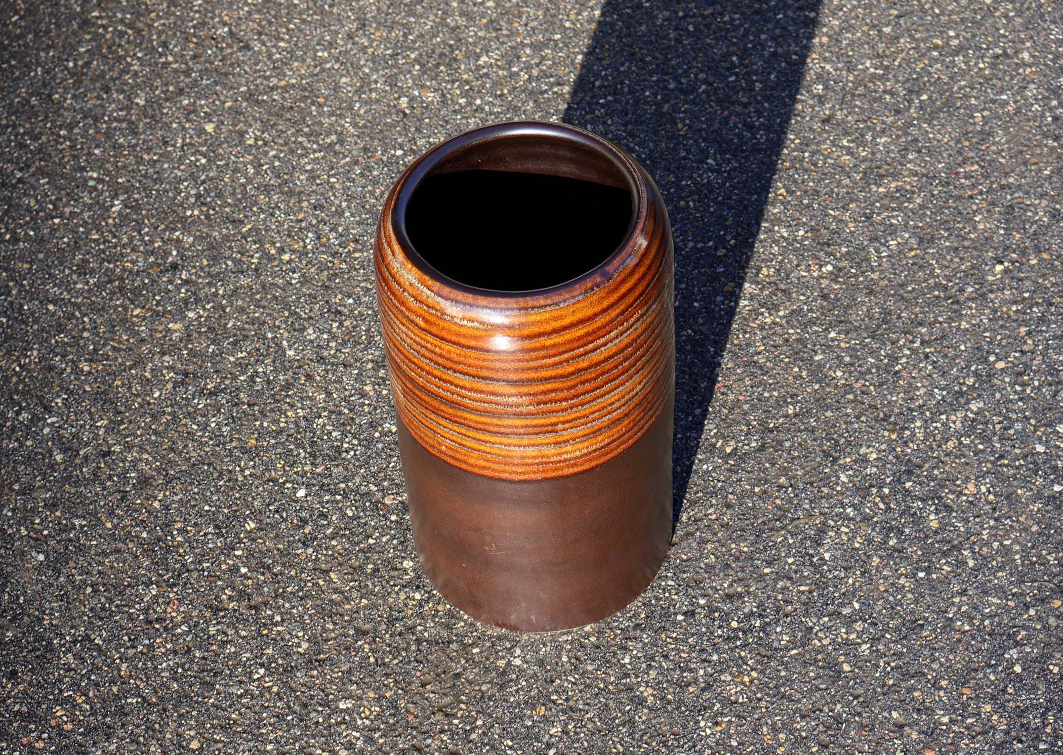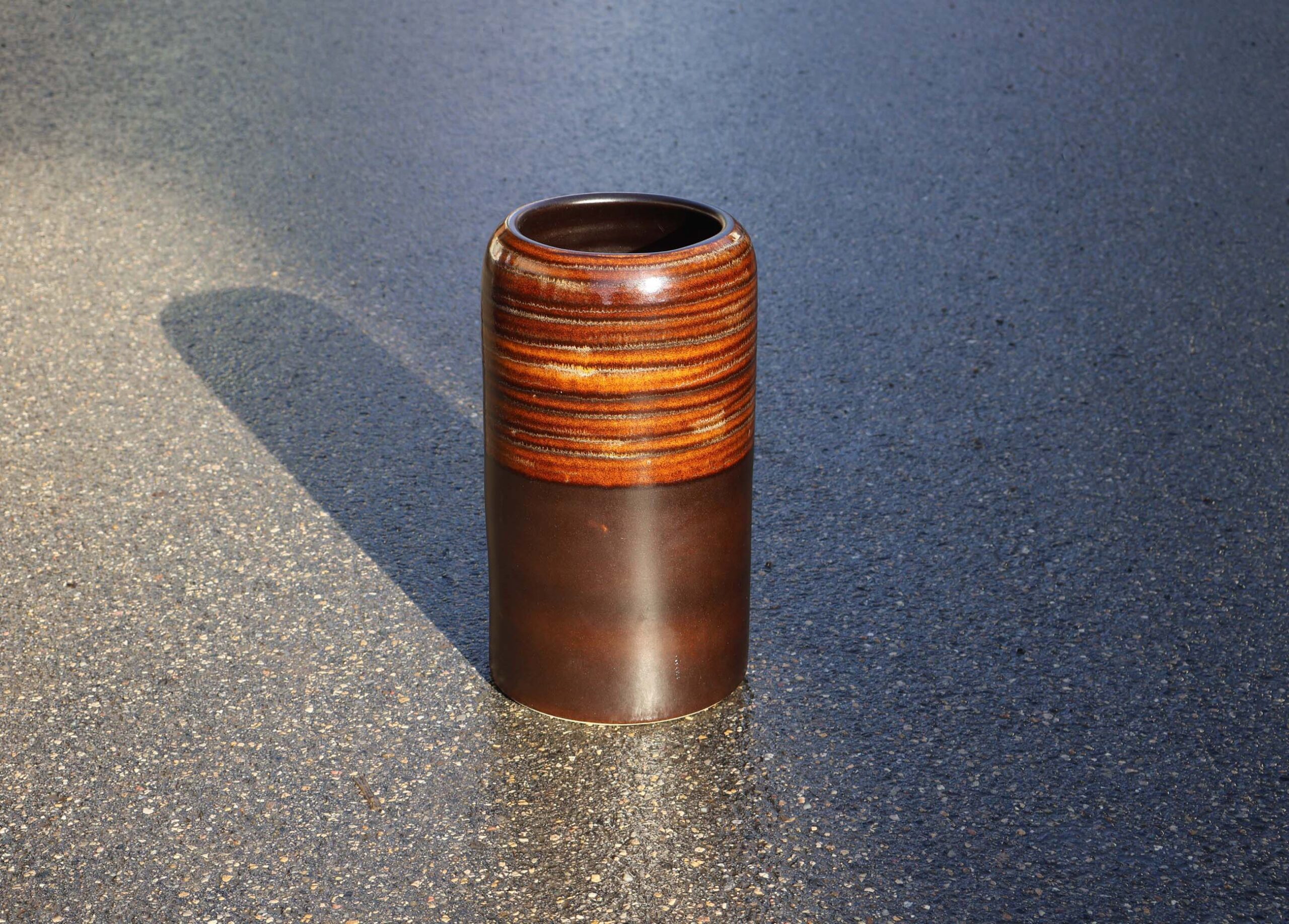Grand vase Burkart Keramik. Massif vase cylindrique, avec un émaillage brun et sur le haut, décor de lignes parallèles, avec un dégradé allant du beige jaune, au brun orangé.