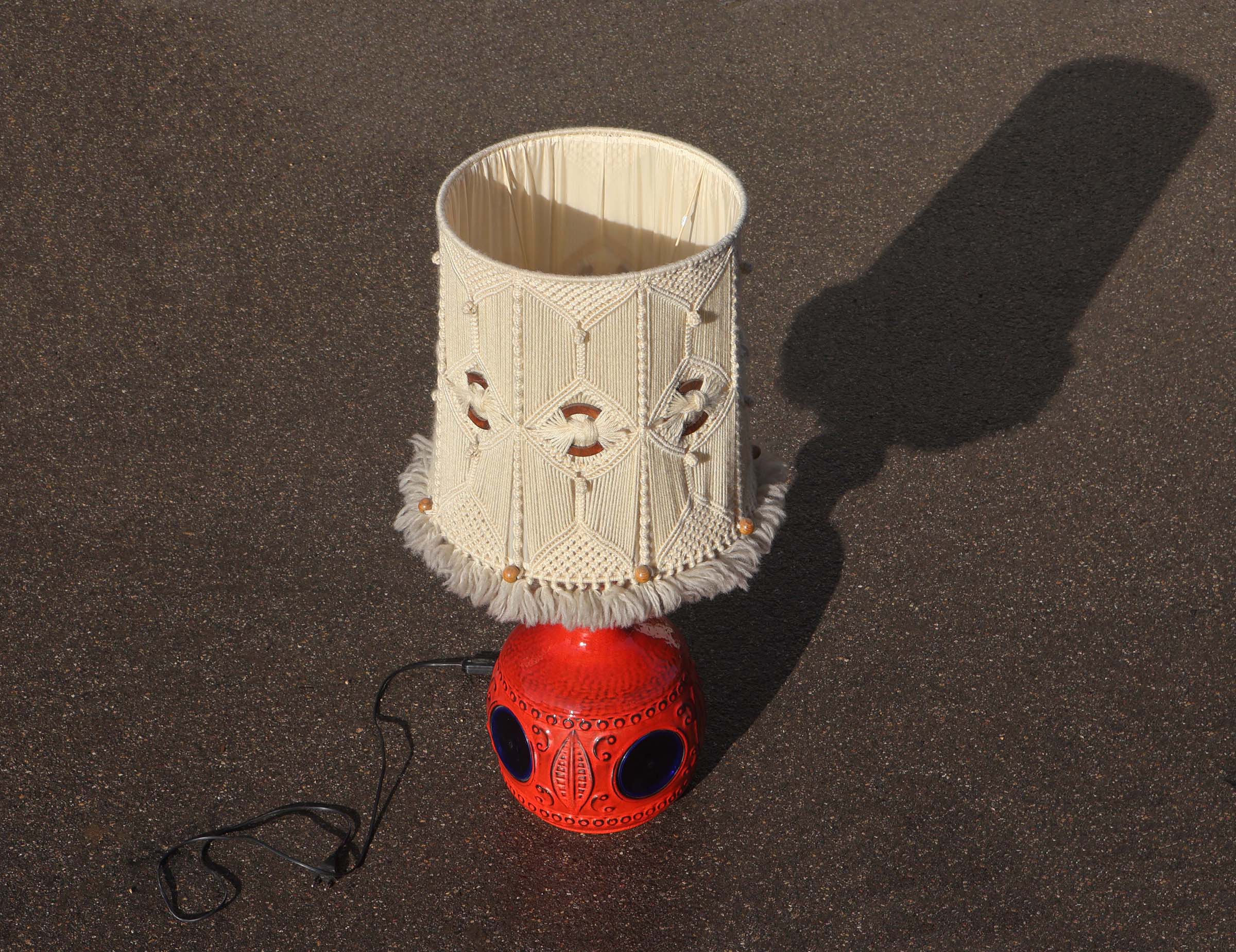 J’ai trouvé le pied seul, et quelques années après, j’ai déniché cet abat-jour en macramé, qui est bien en accord. Et qui donne une esthétique “hippie-kitsch” 70’s.