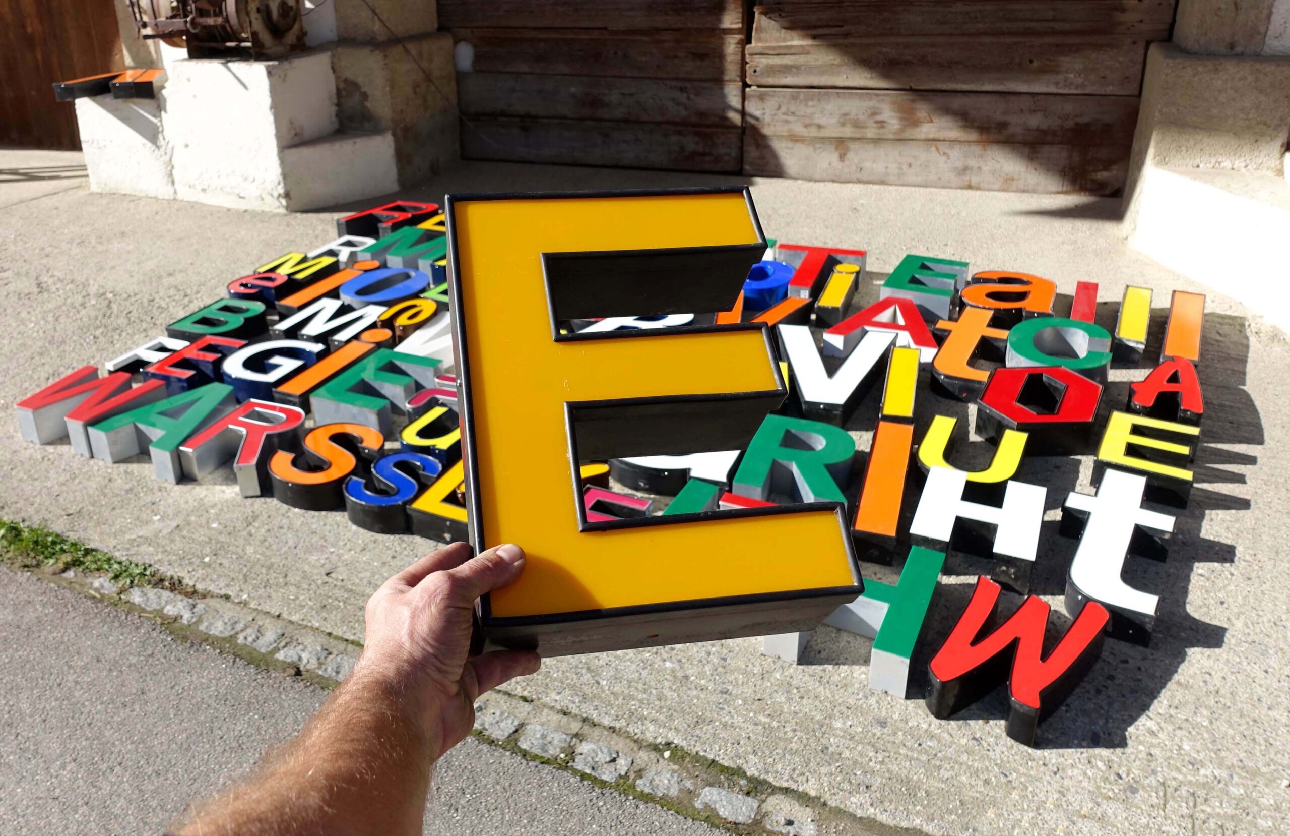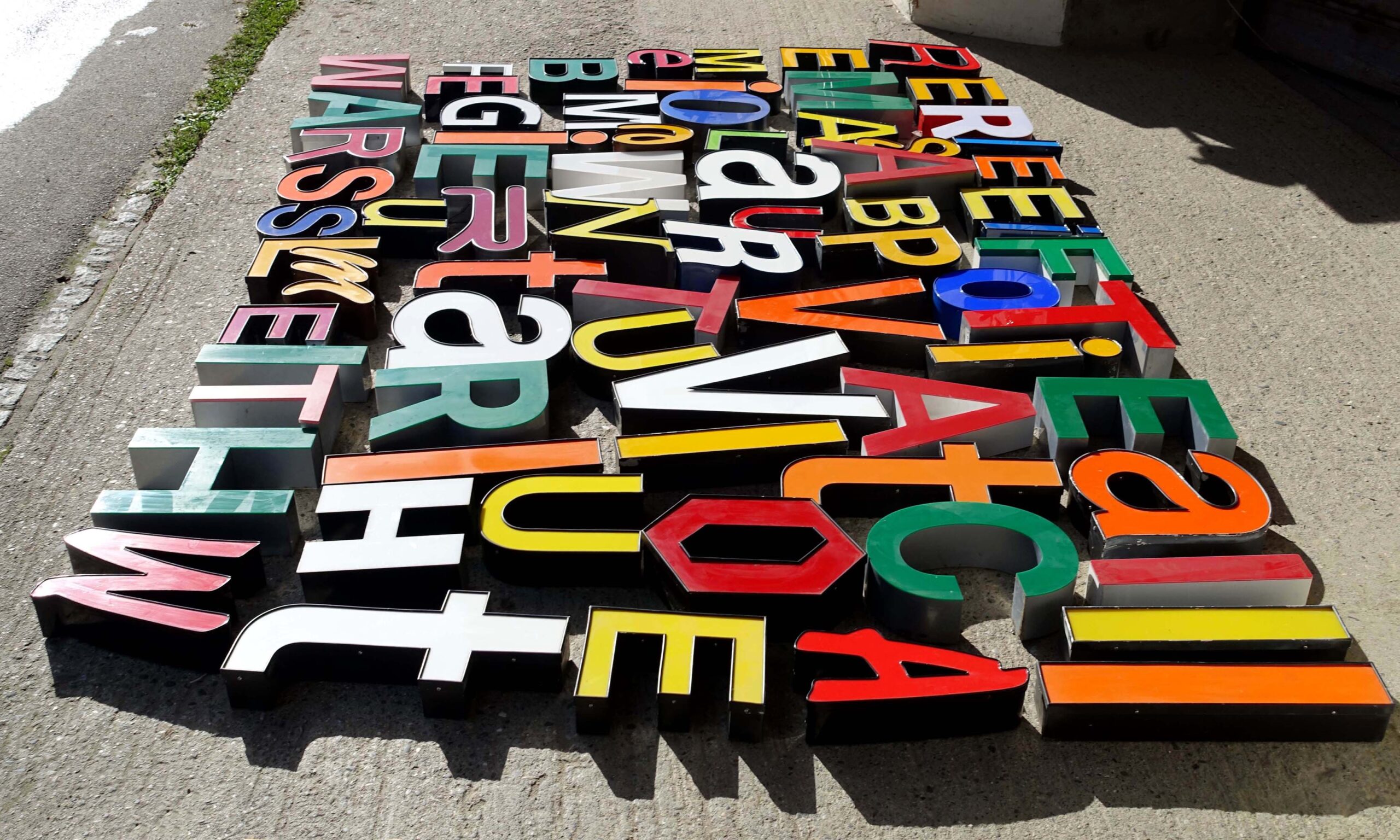 Lettres enseigne vintage 1970 : Dépareillées, et avec des couleurs multicolores, ces lettres publicitaires “boitier” d’enseignes lumineuses de démantèlement, sont idéales en déco …
