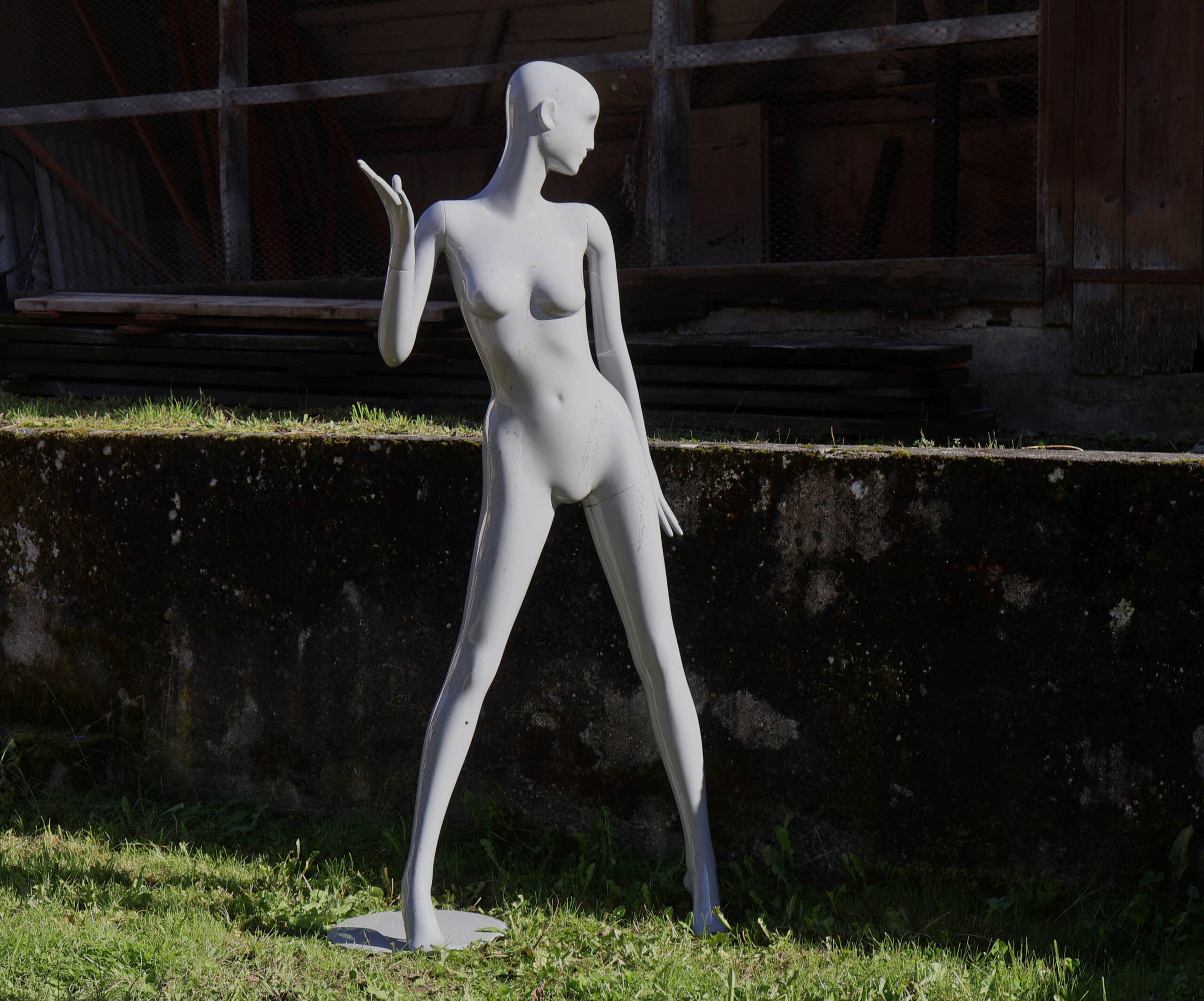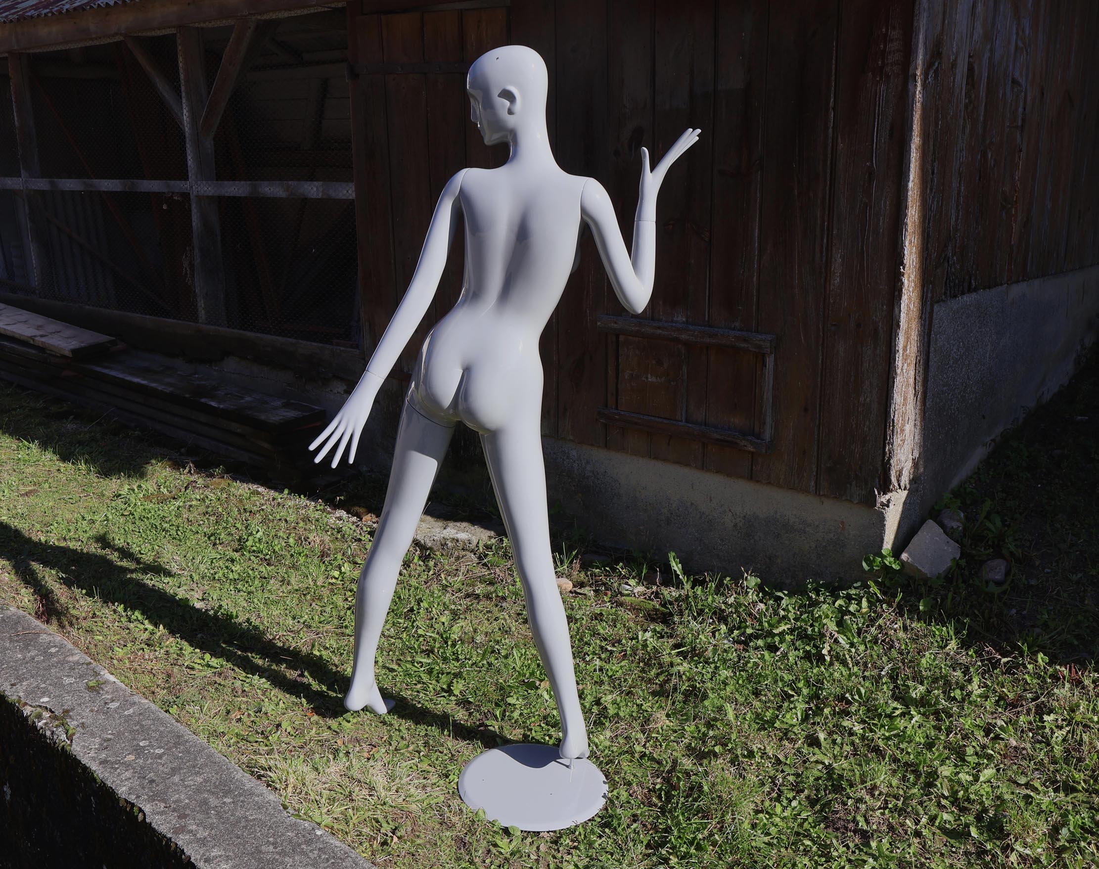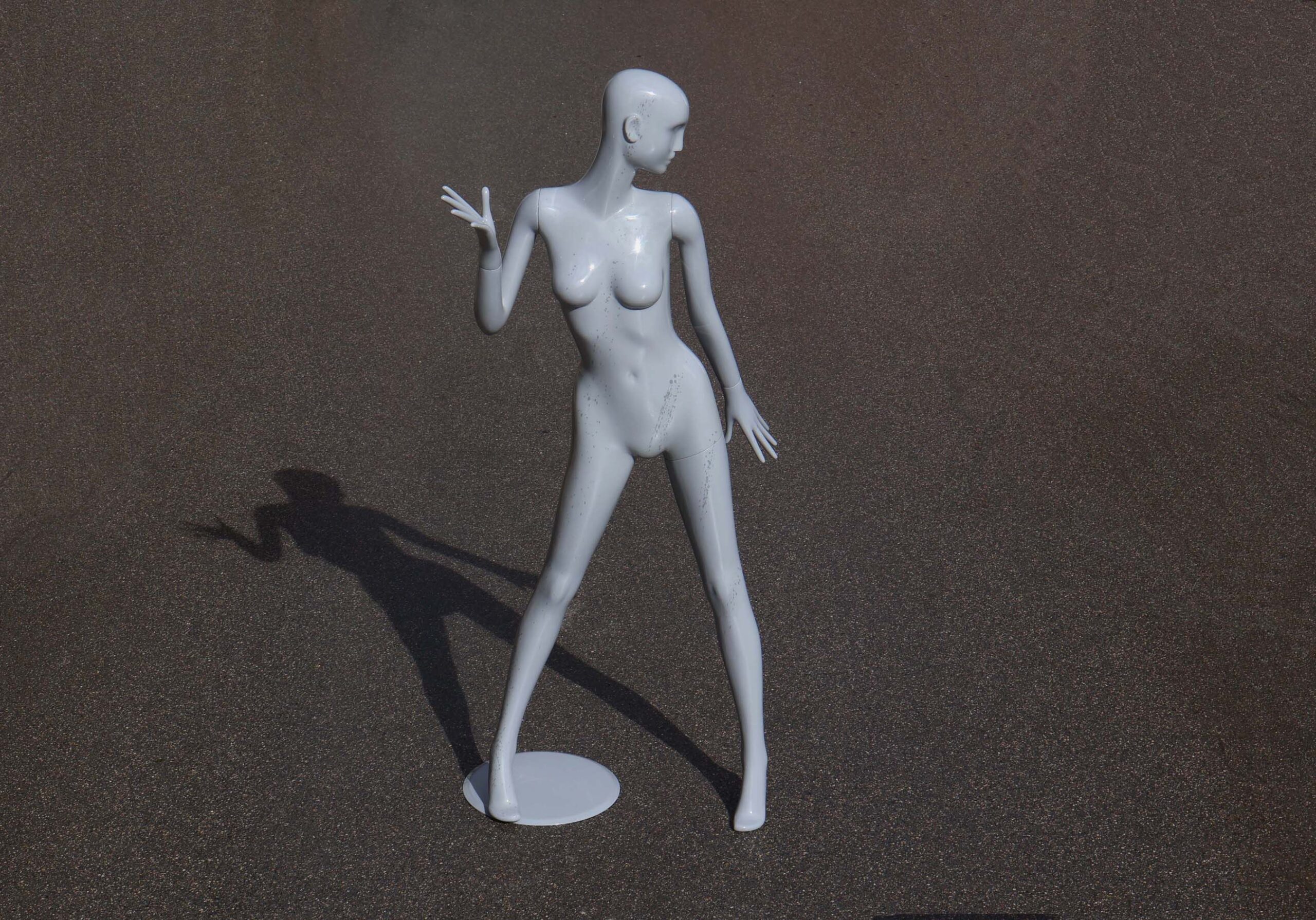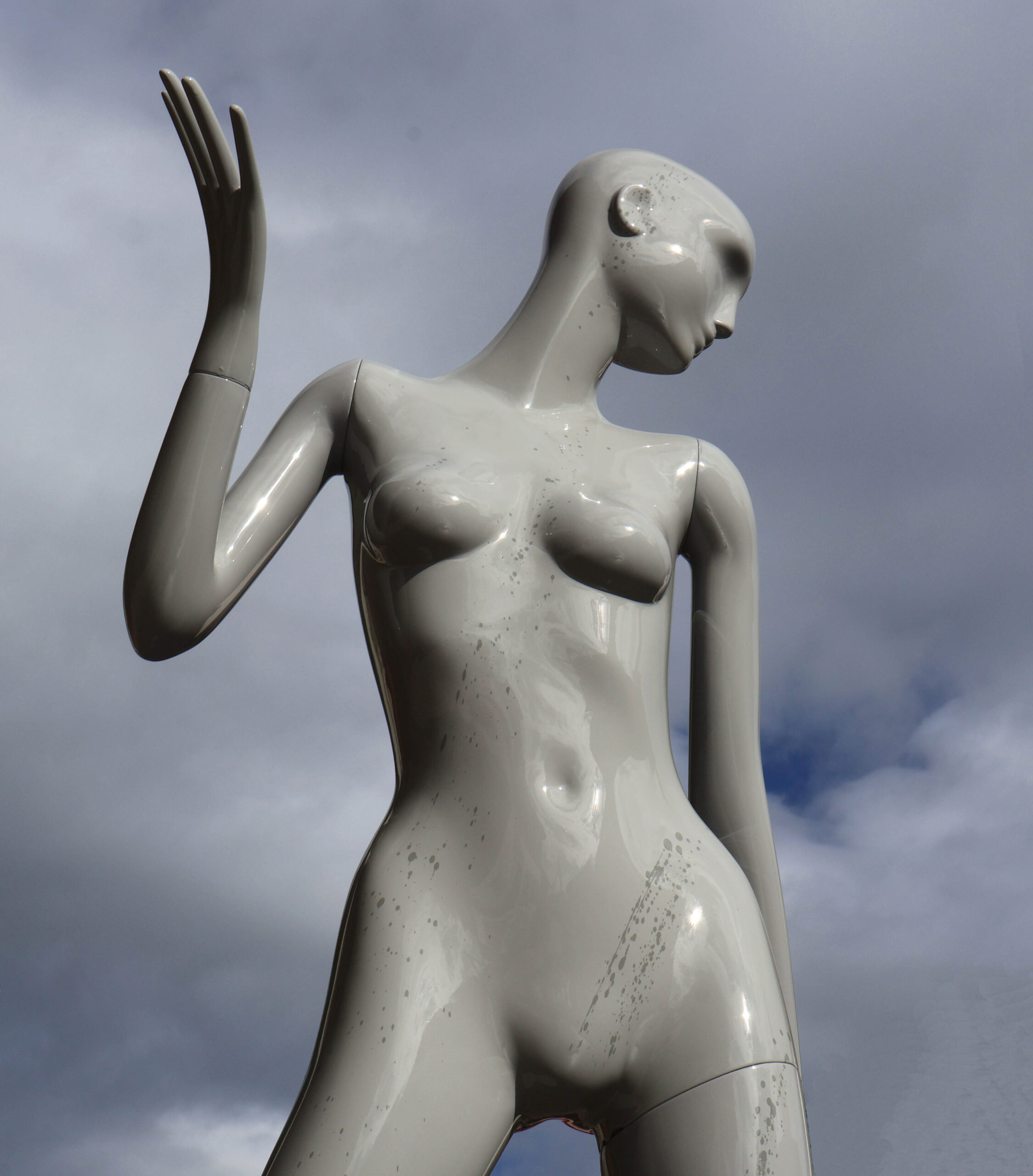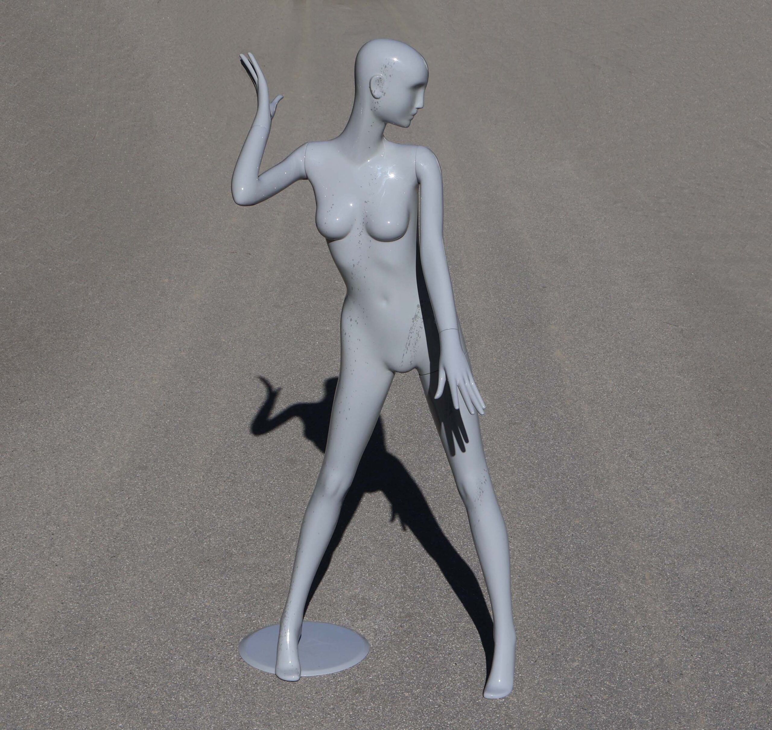 Intéressante pose dynamique / expressive. Hauteur 180cm. Il a été repeint en carrosserie, avec un vernis gris brillant. Et ajout, (discret), de “giclures” / projections au pinceau, gris plus sombre, pour donner un style.