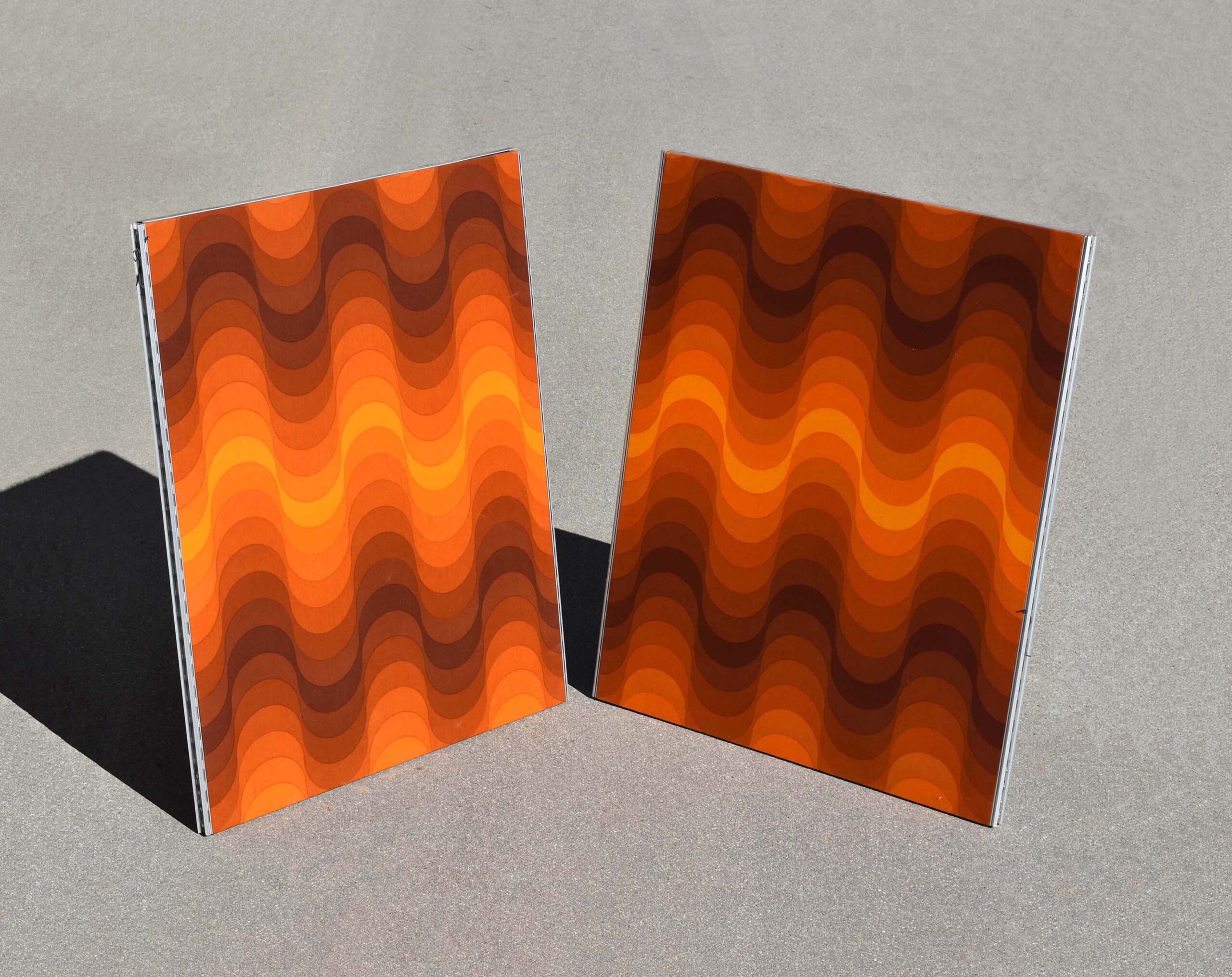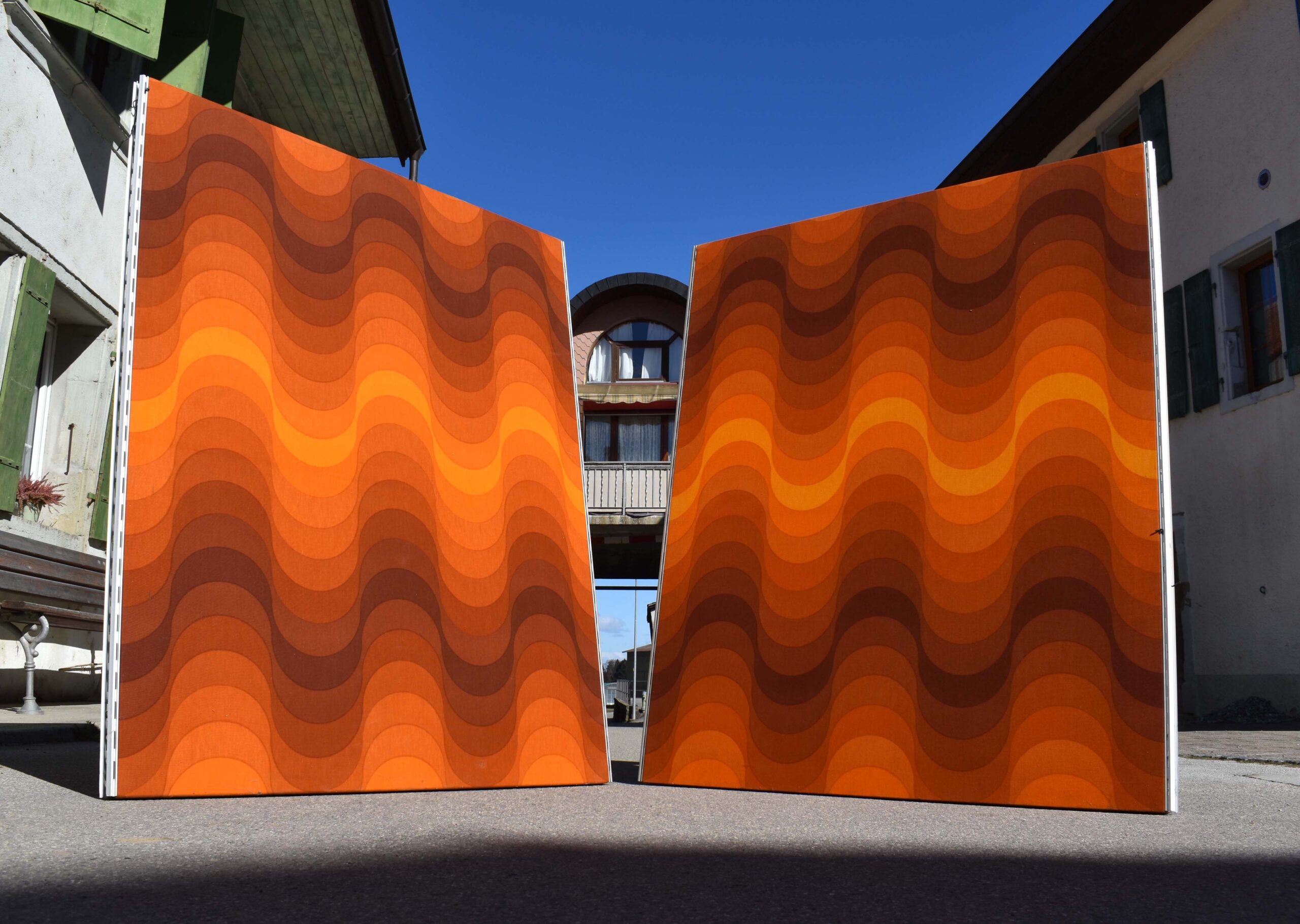 Wave Verner Panton 1973. Ce sont 2 panneaux revêtus de tissus d’ameublement. Avec un décor de vagues. Formant un dégradé allant de l’orange au brun foncé.