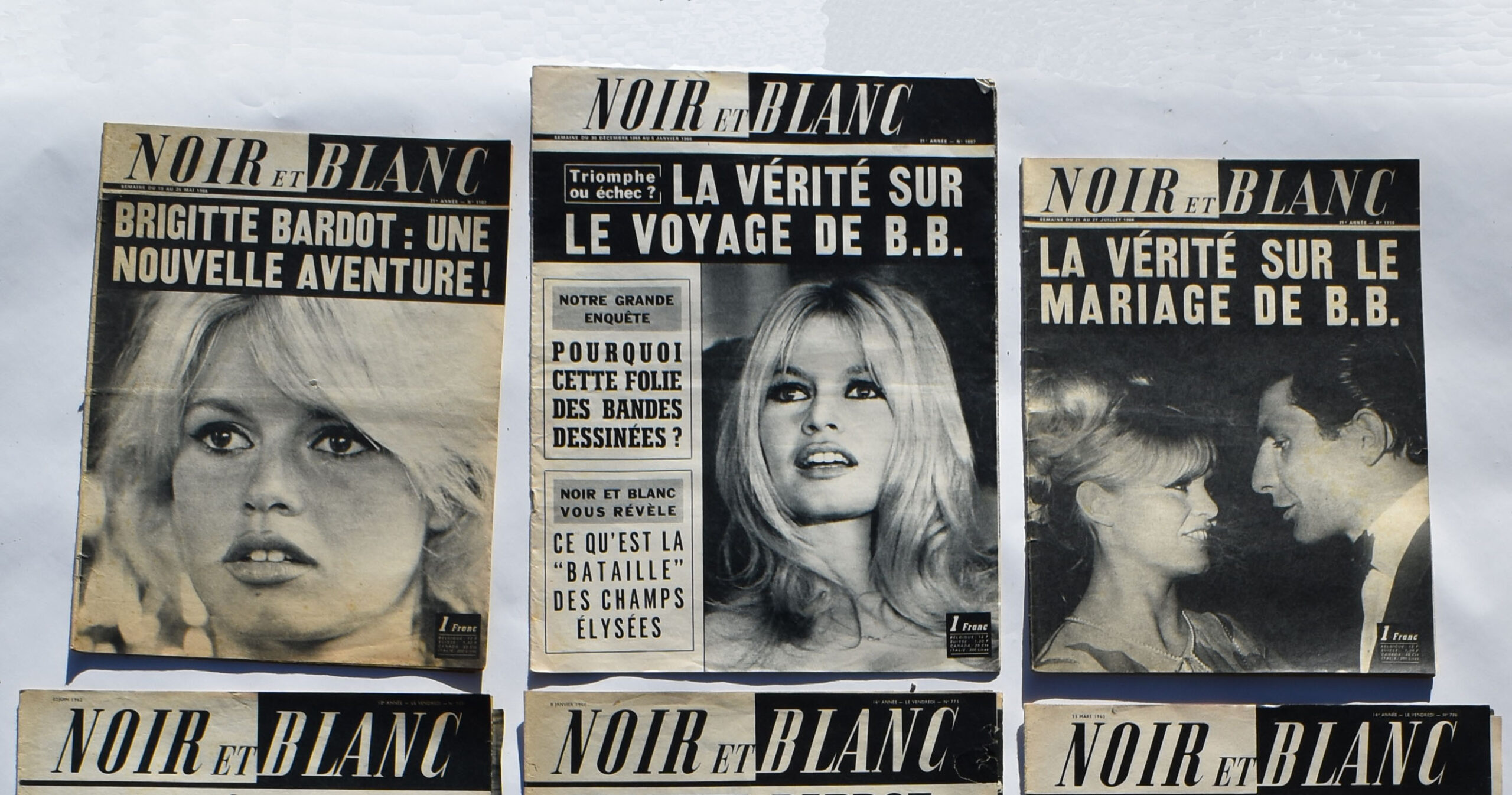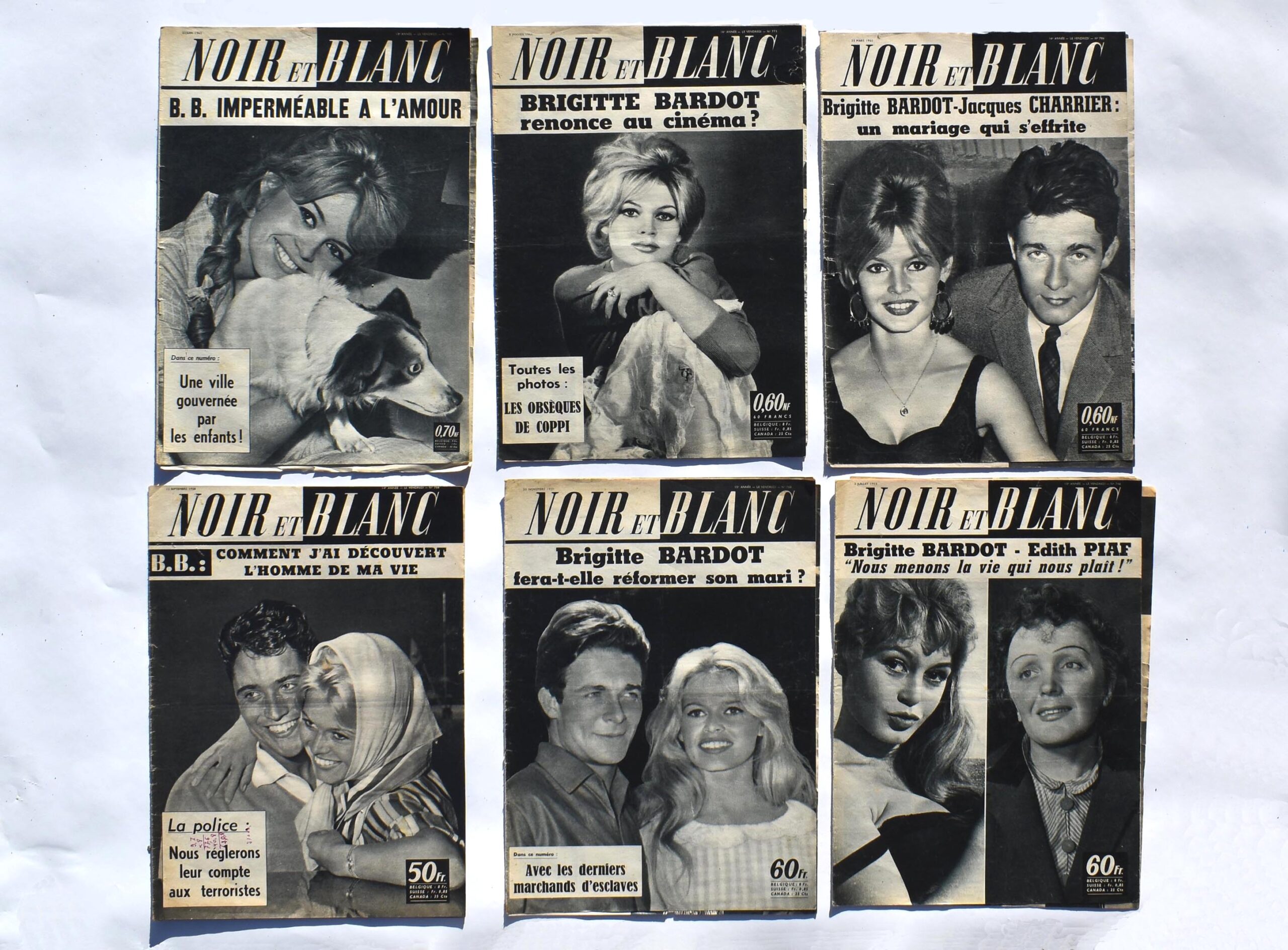 Brigitte Bardot 9 couvertures : Insolite lot de magazines, hebdomadaire du nom de “Noir et Blanc” des années 1950 à 60. Avec des photos de l’actrice et chanteuse “BB” sur la couverture. Sur des éditions de ce journal, datées de septembre 1958 à décembre 1966.