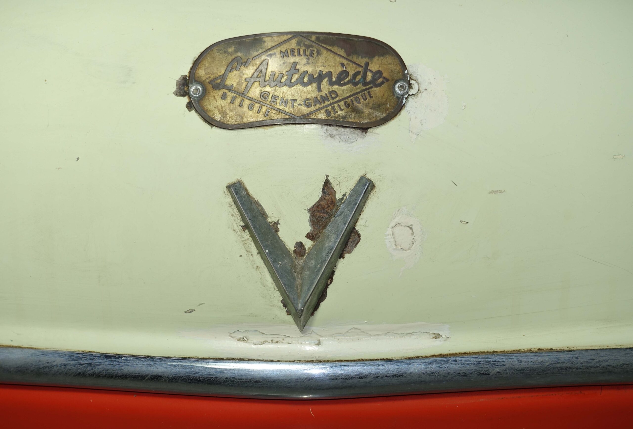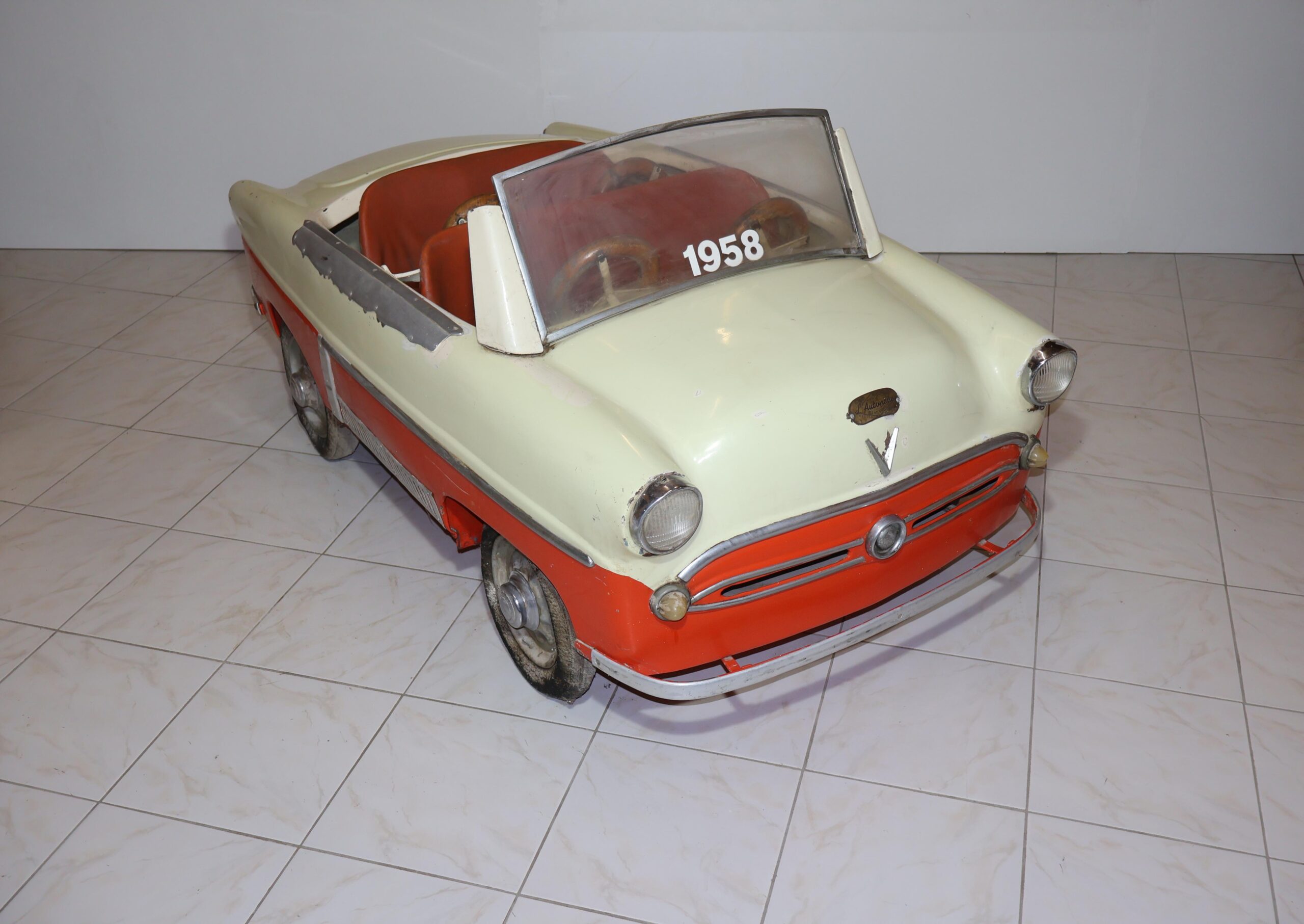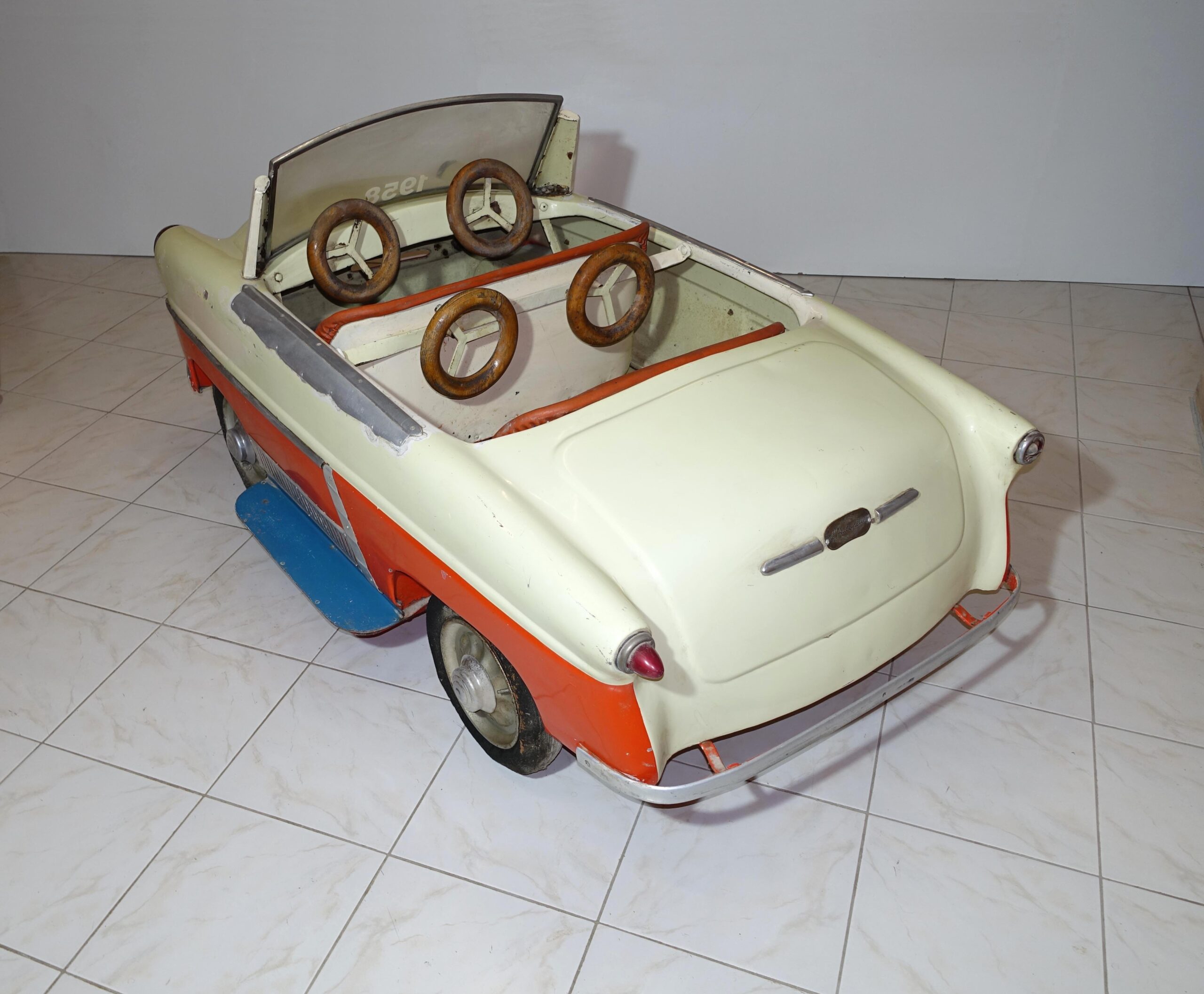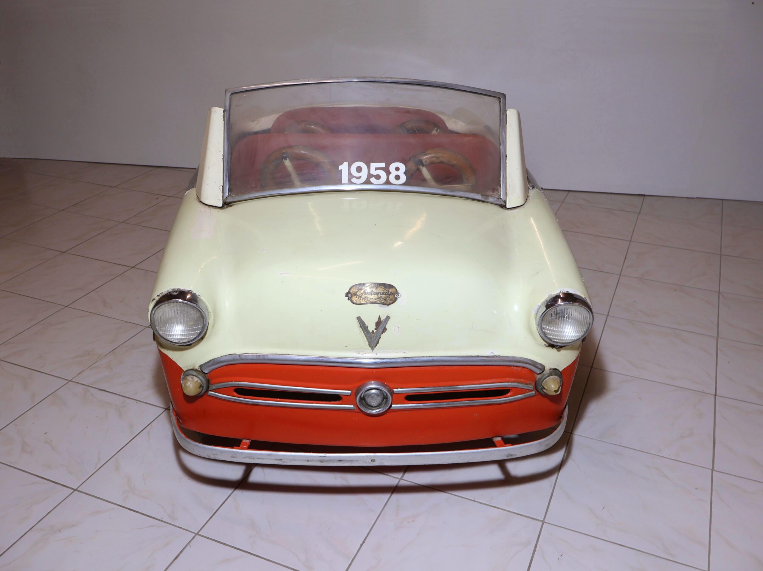 Sur le pare-brise il y a des stickers 1958, (posés ultérieurement), qui laissent à penser que c’est l’année de fabrication. Je n’ai pas réussi à déterminer le type de voiture reproduit. Je pense que c’est plutôt un modèle “fantaisie”. S’inspirant des microcars de l’époque, style Fiat 1100, Vespa 400, Nash Metropolitain …