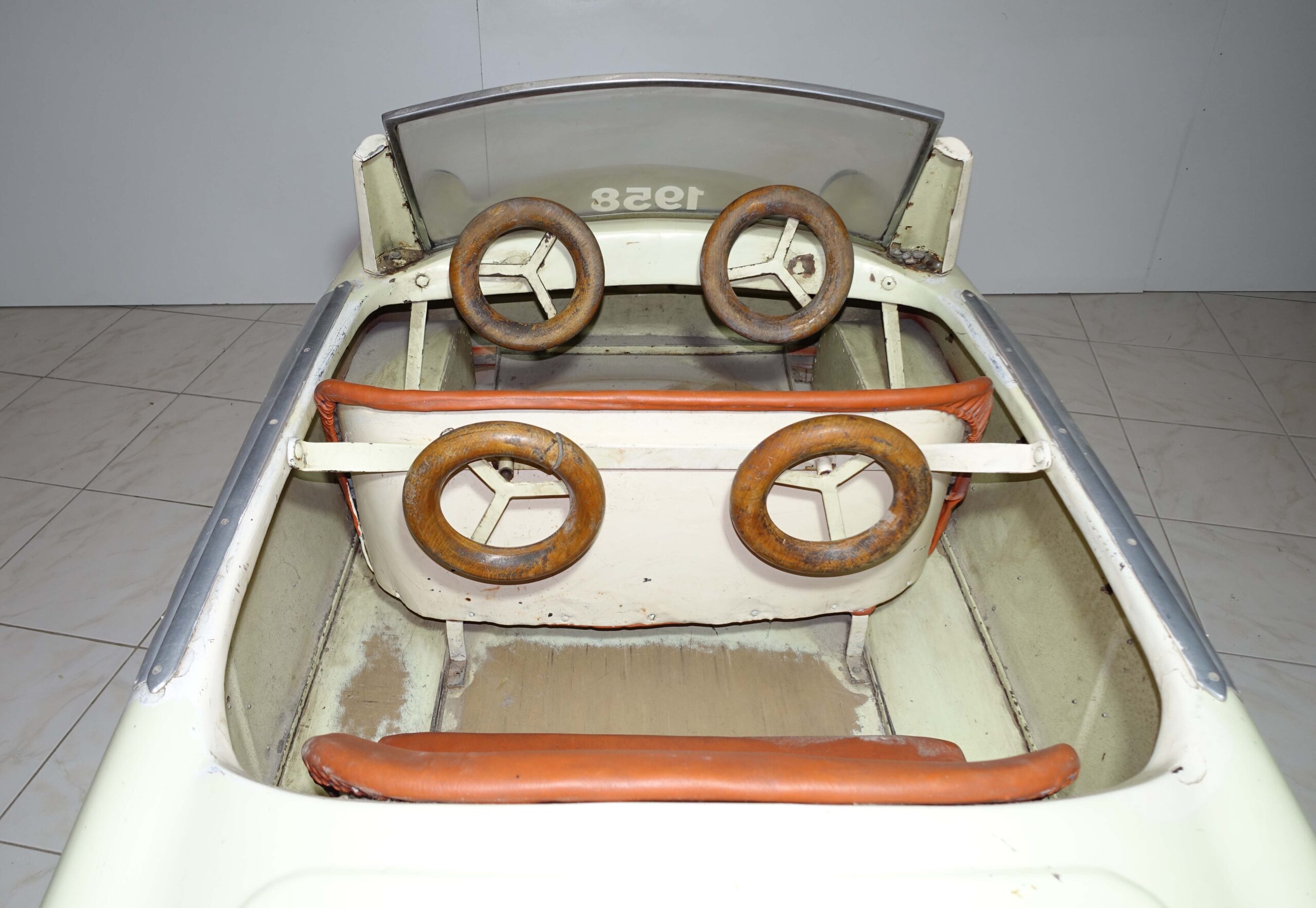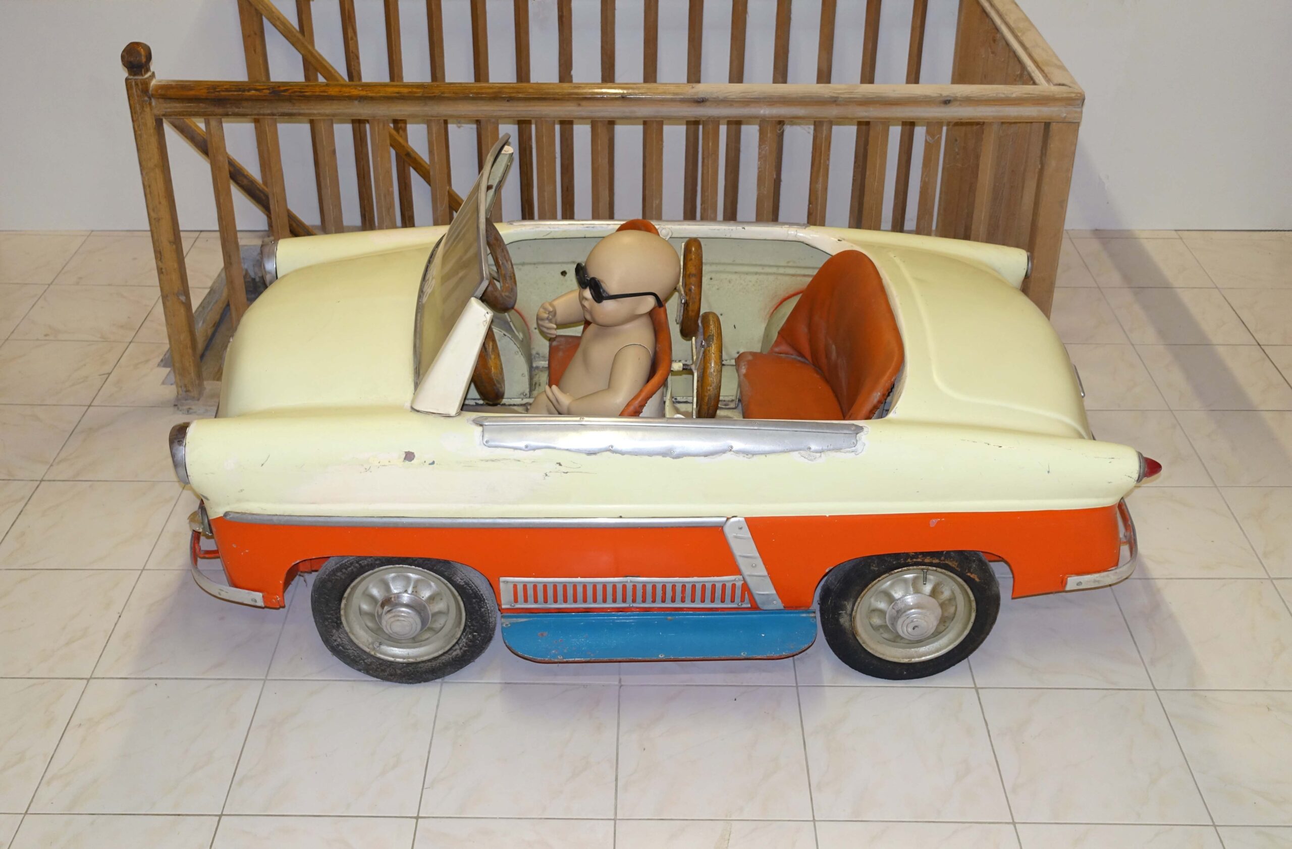 L’Autopède voiture de manège : Superbe sujet de carrousel des années 1950, sous la forme d’une auto cabriolet, 4 places, et avec 4 volants en bois.