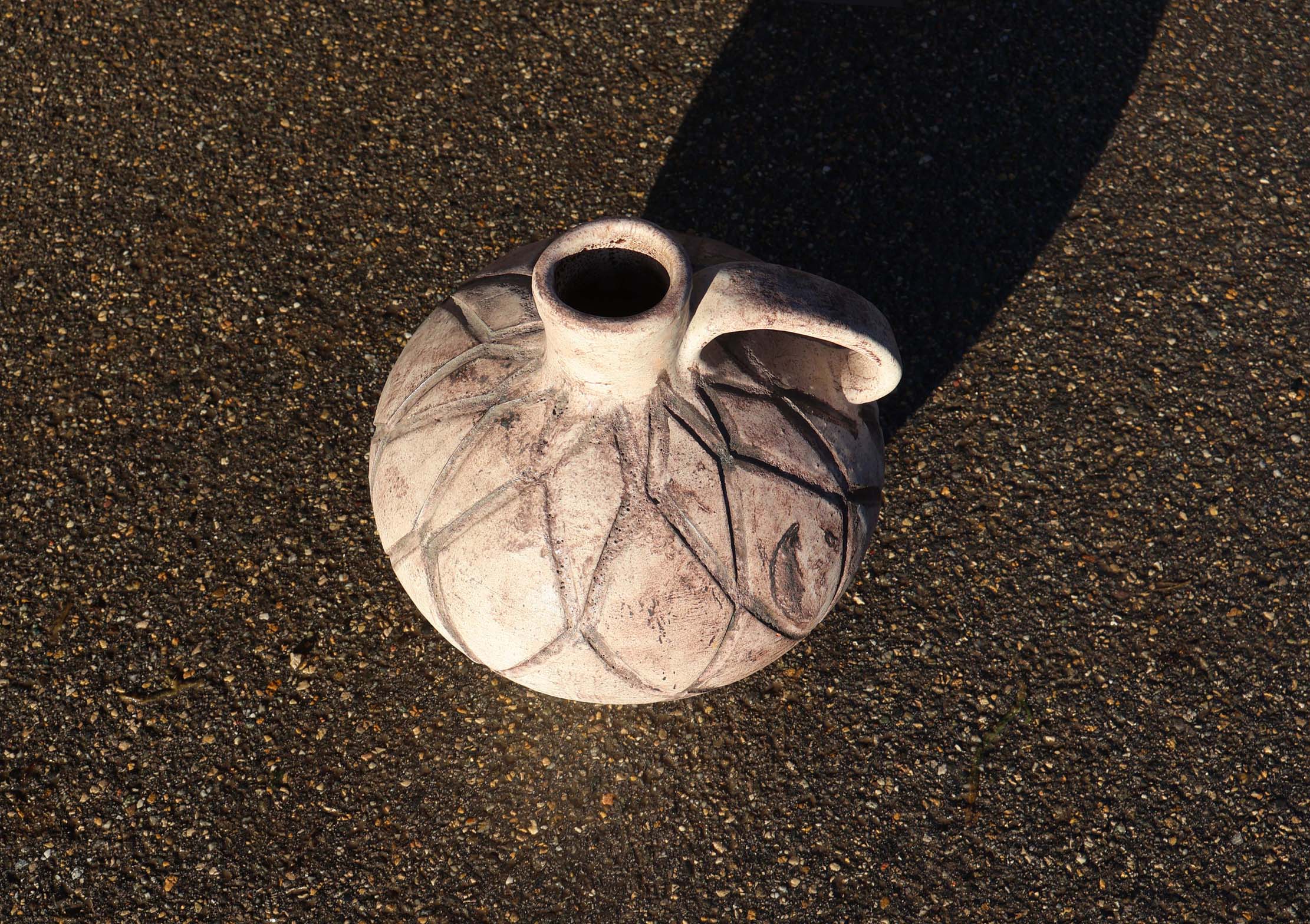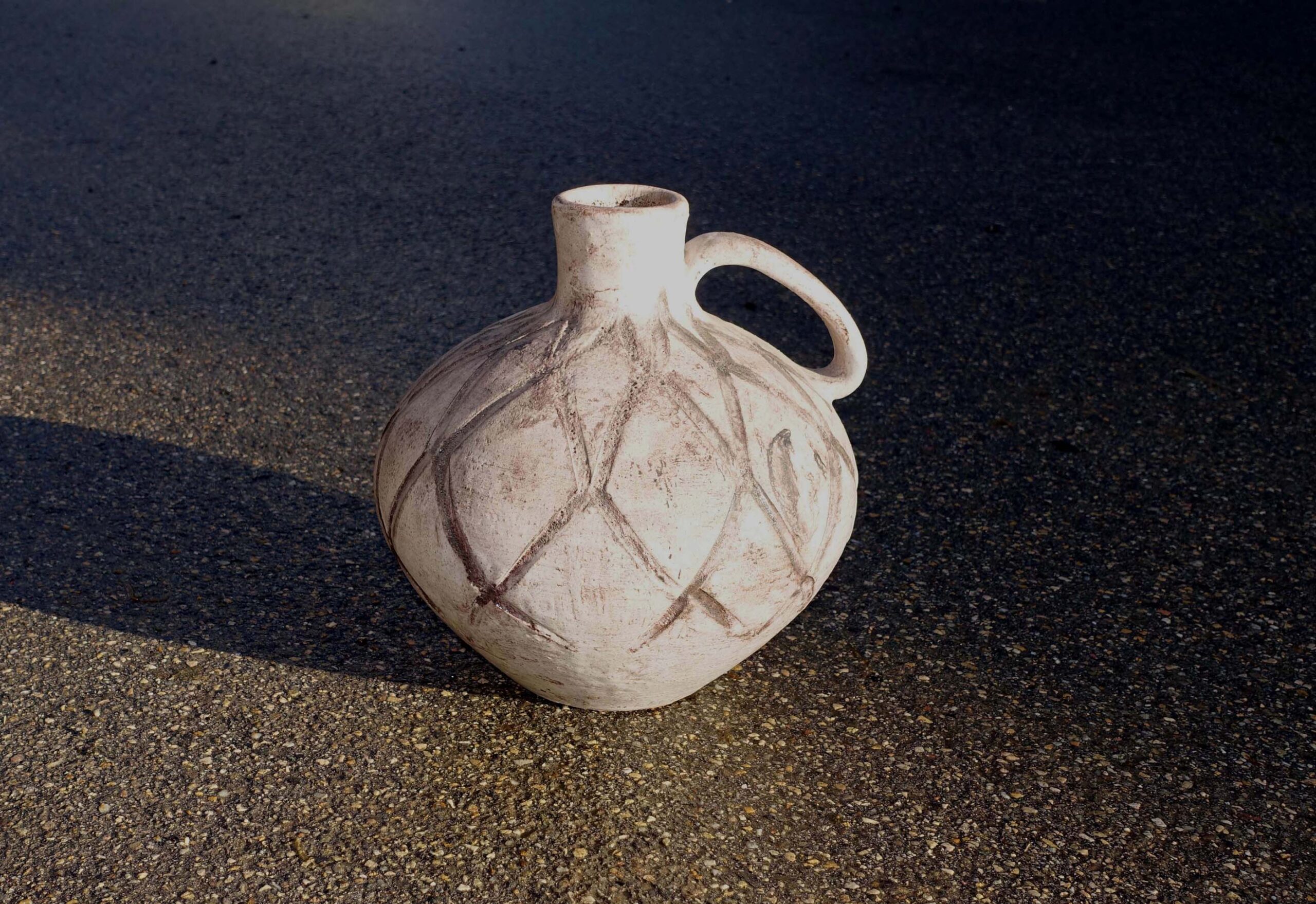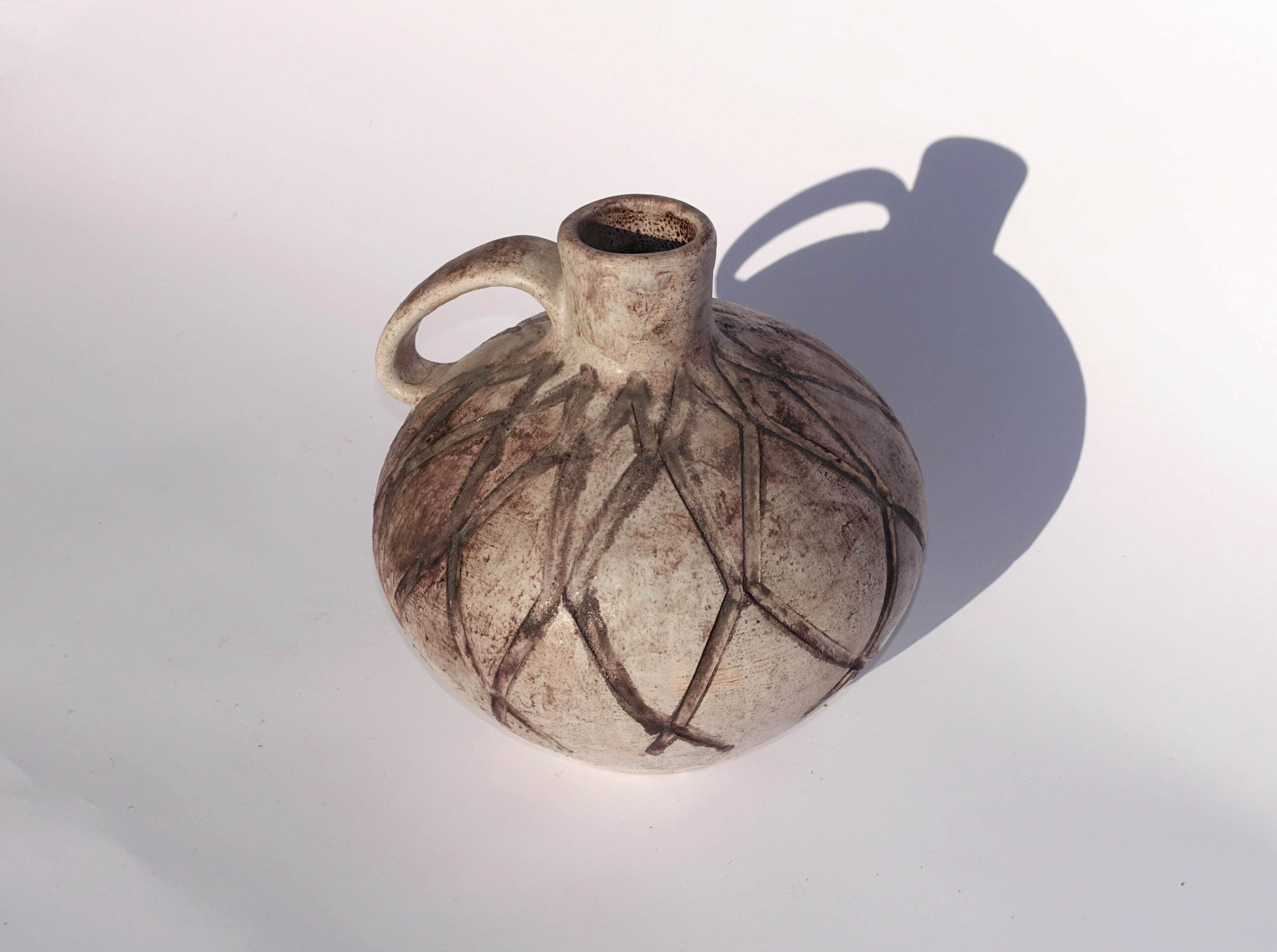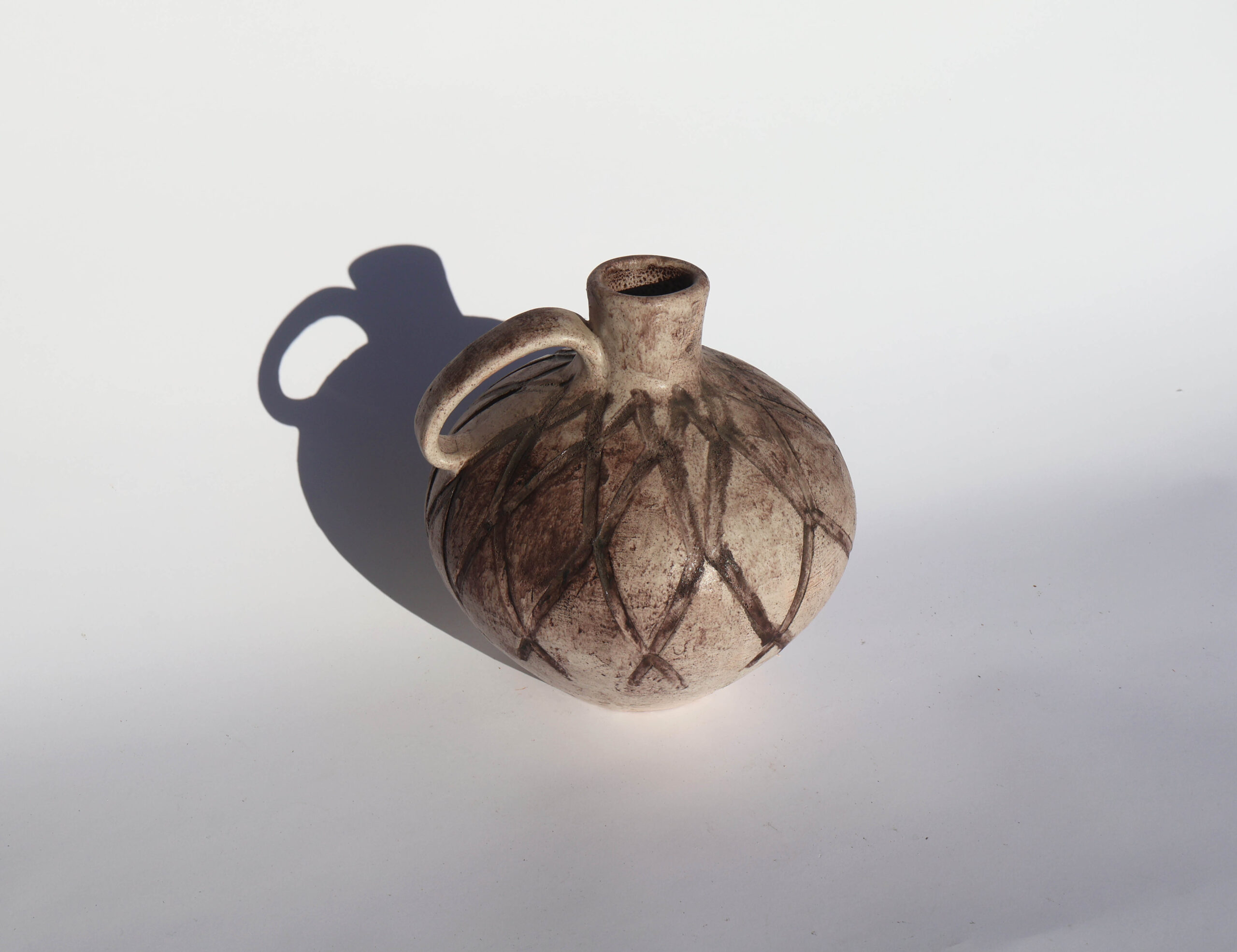 De forme globulaire, avec anse. Larges lignes en creux / “scarifications”, en forme de losanges entremêlés. Surface rugueuse blanc-beige, rajouts de brun-rouge, dans les creux, et estompé de manière irrégulière en surface.
