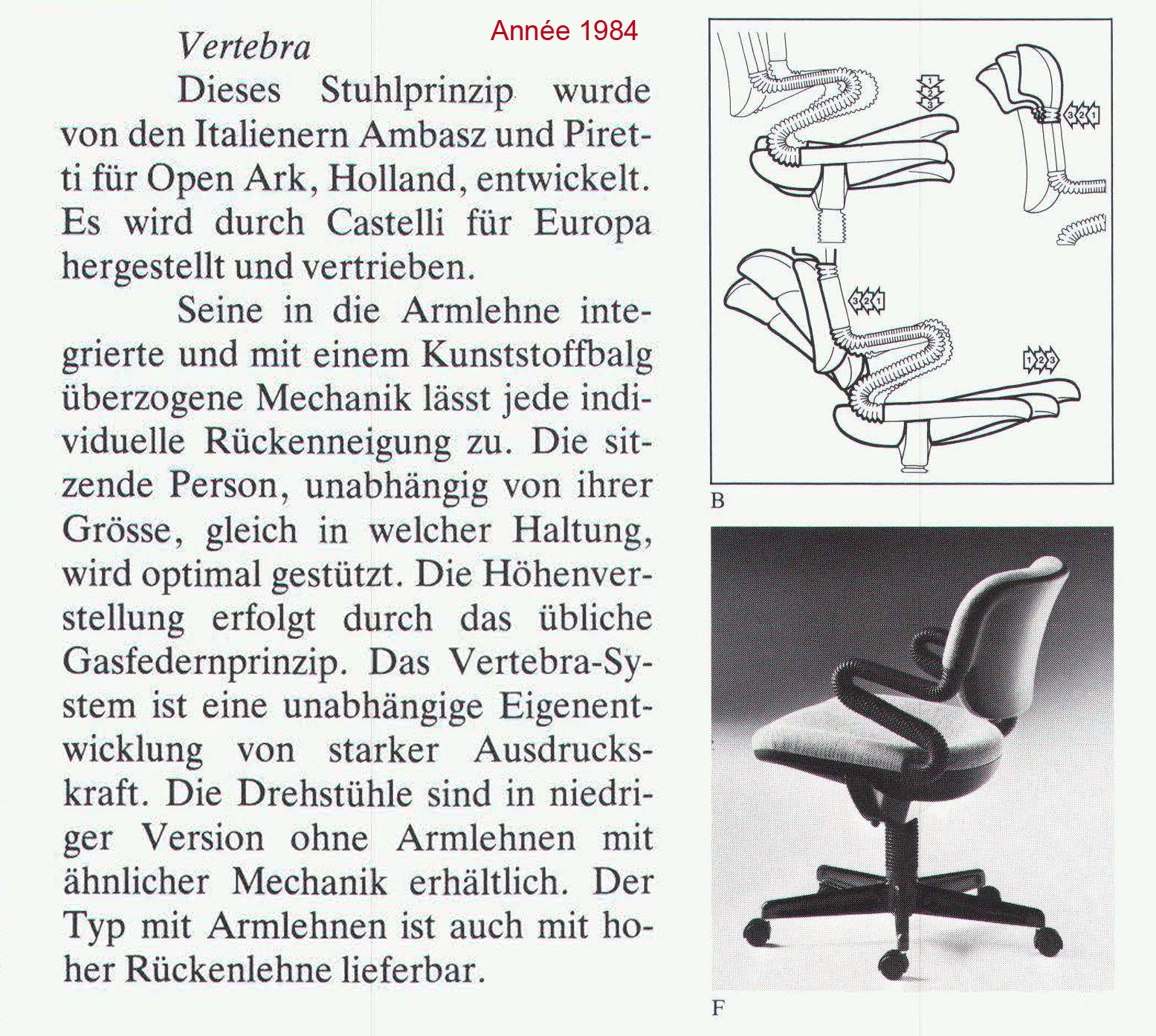 L’illustration datée de 1984, montre une évolution de ce fauteuil de bureau, avec pied central à roulettes. Et assise pivotante.