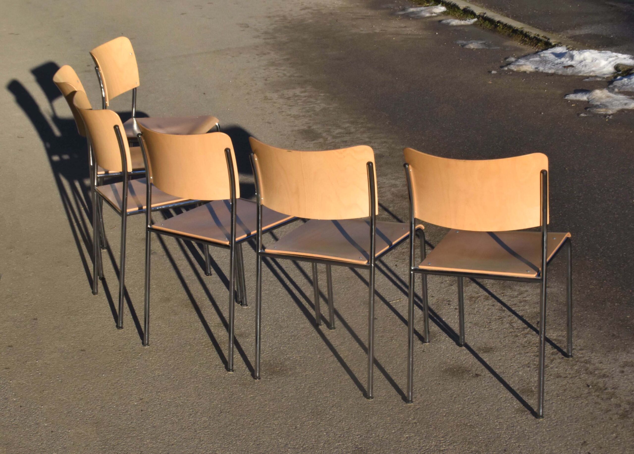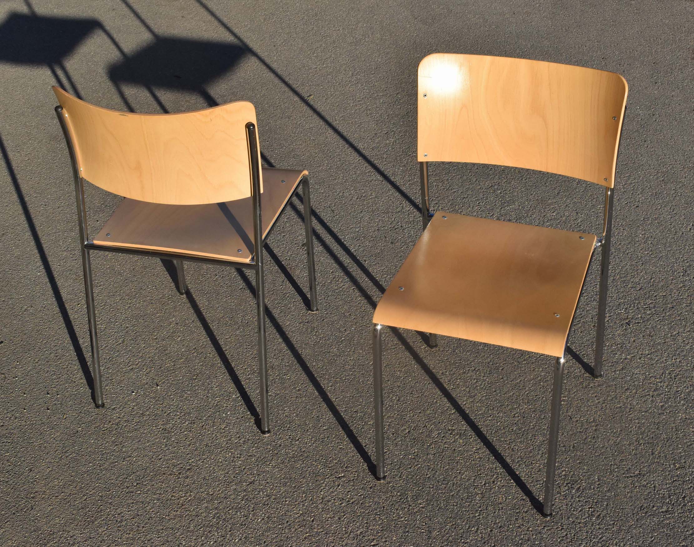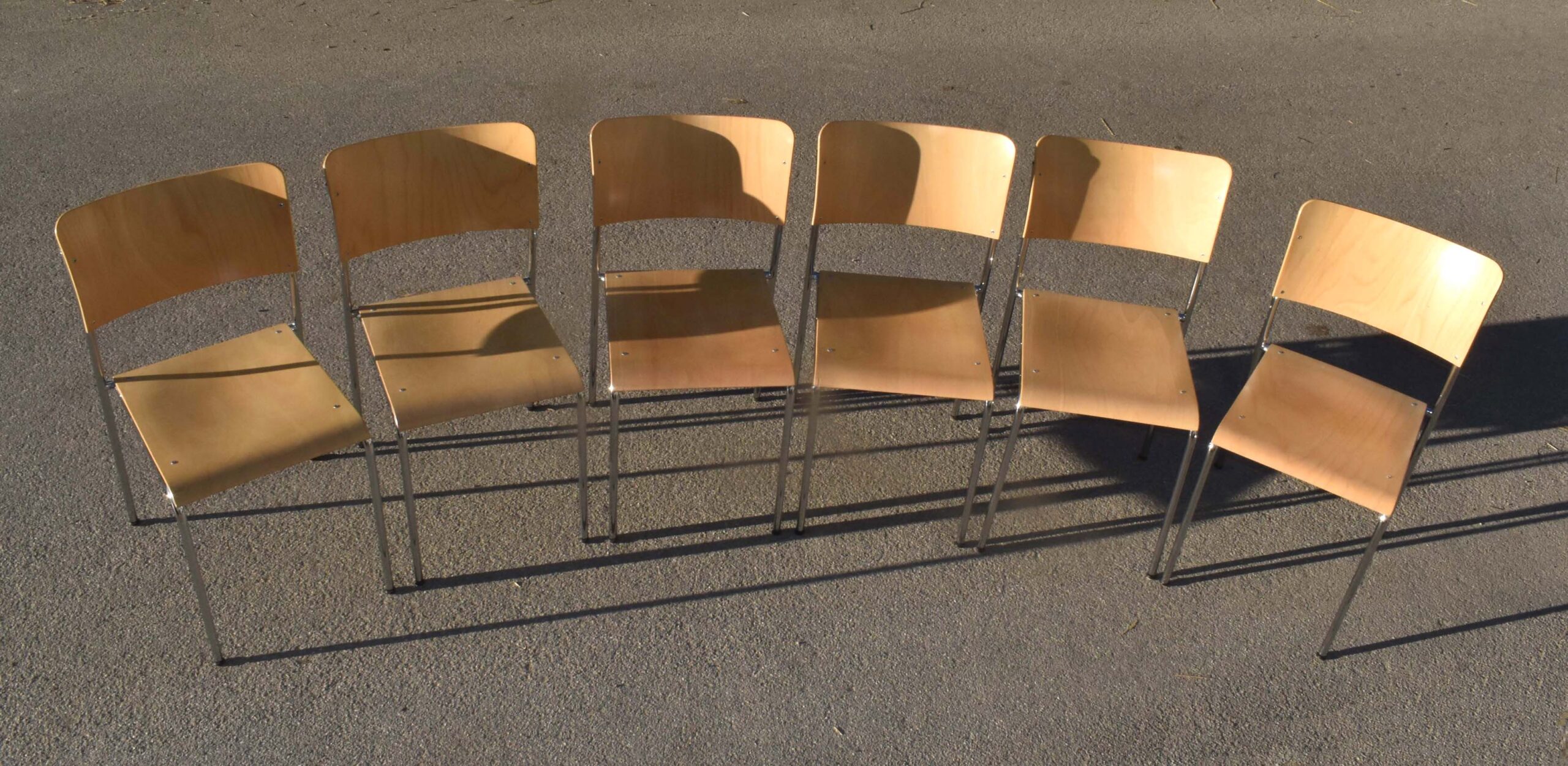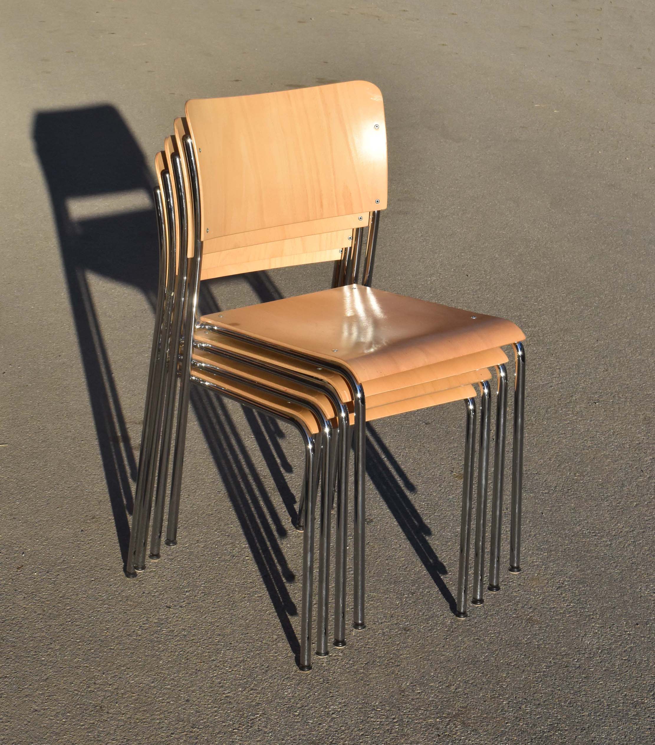 6 chaises du fabricant Suisse Dietiker. Modèle “Atrio”. Conception / design de Christoph Hindermann, en 1998. Sièges empilables utilisés dans les cafétérias, et autres collectivités.