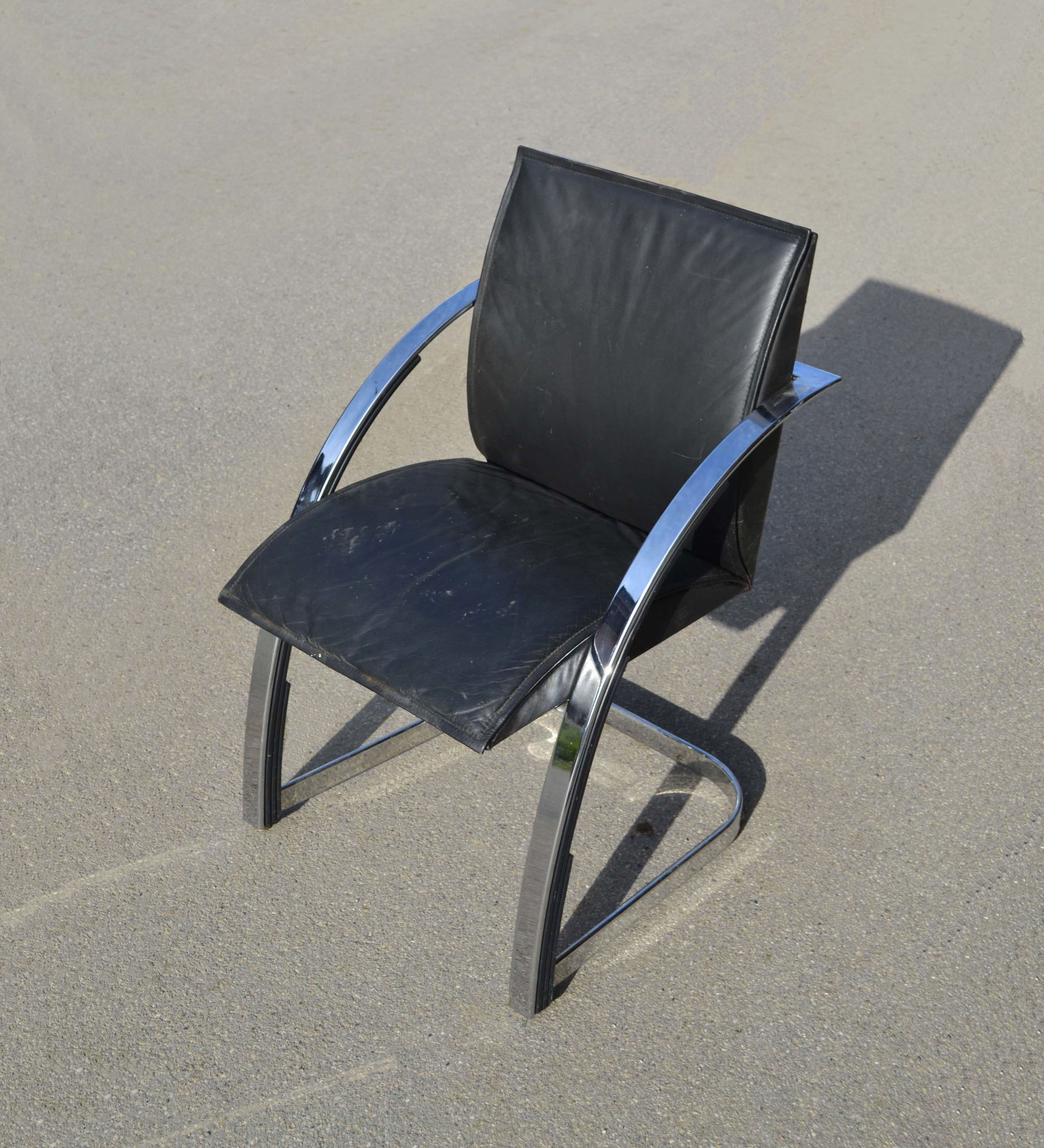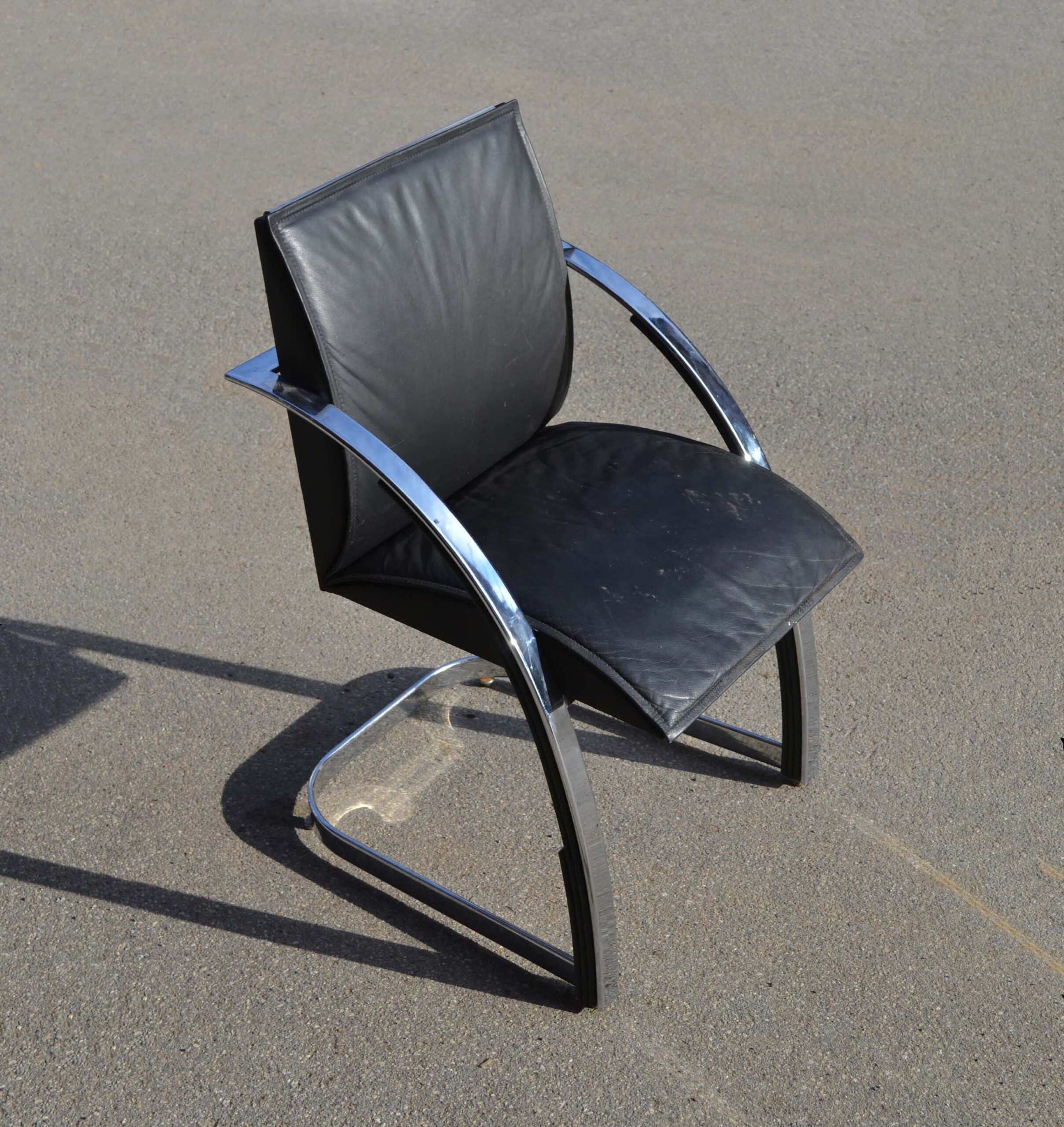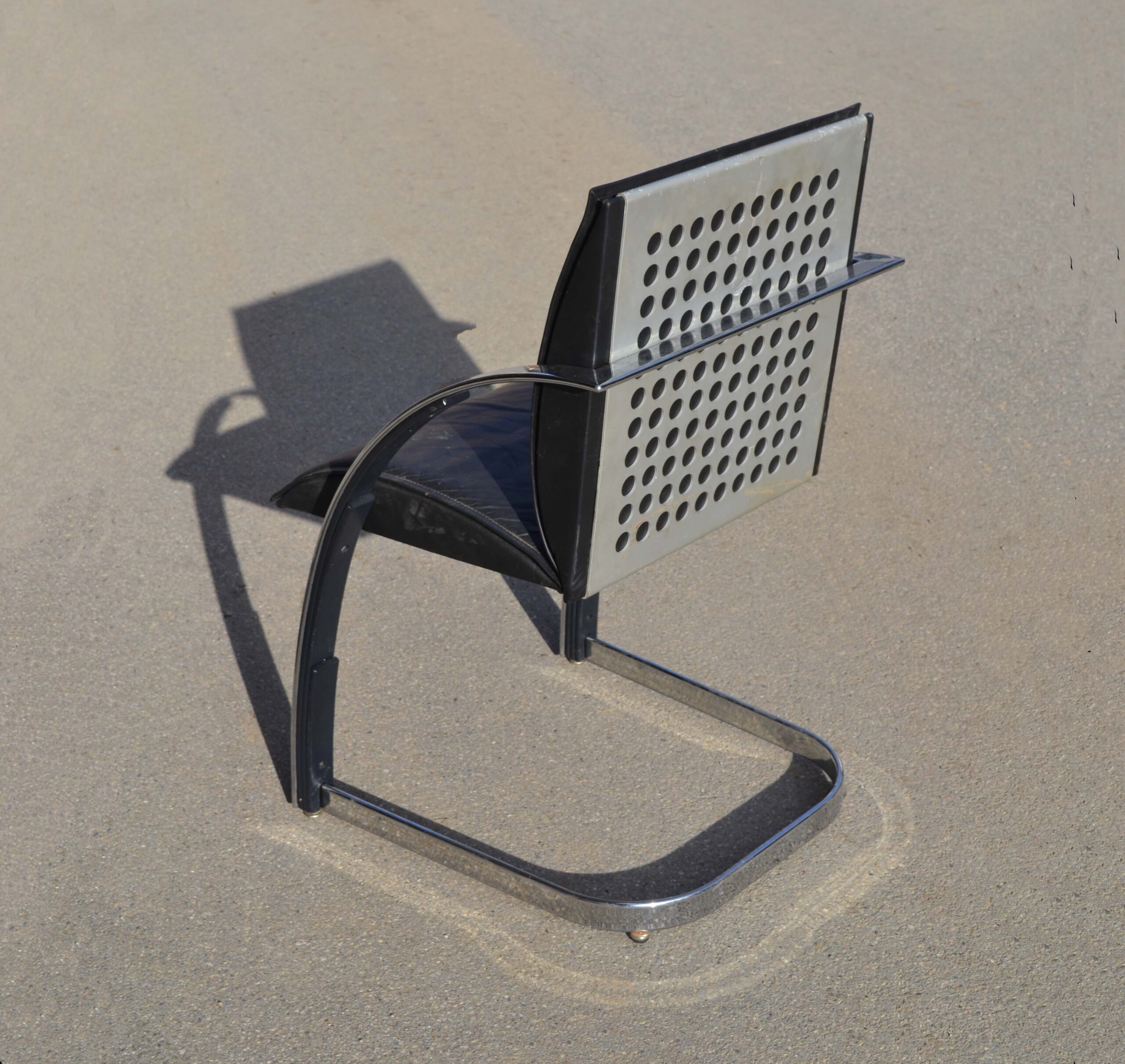 Fauteuil de bureau en cuir. Châssis cantilever en tube acier chromé. Assise et dossier en simili-cuir noir, en forme d’arc. Avec dossier en tôle alu éloxé naturel. Avec grosses perforations circulaires. Le trous ont pour but d’évacuer l’air, rendant l’assise confortable.