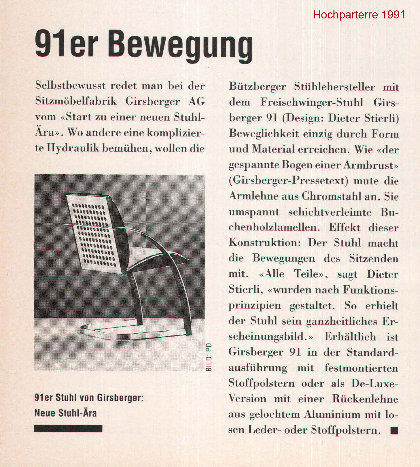 Girsberger 91er Stühl. Fauteuil de bureau avec une forme “cantilever”. Design de Dieter Stierli en 1991. Pour la manufacture Suisse Girsberger. En allemand l’on appelle ce type de siège “Freischwinger”. Que l’on peut traduire par chaise cantilever.