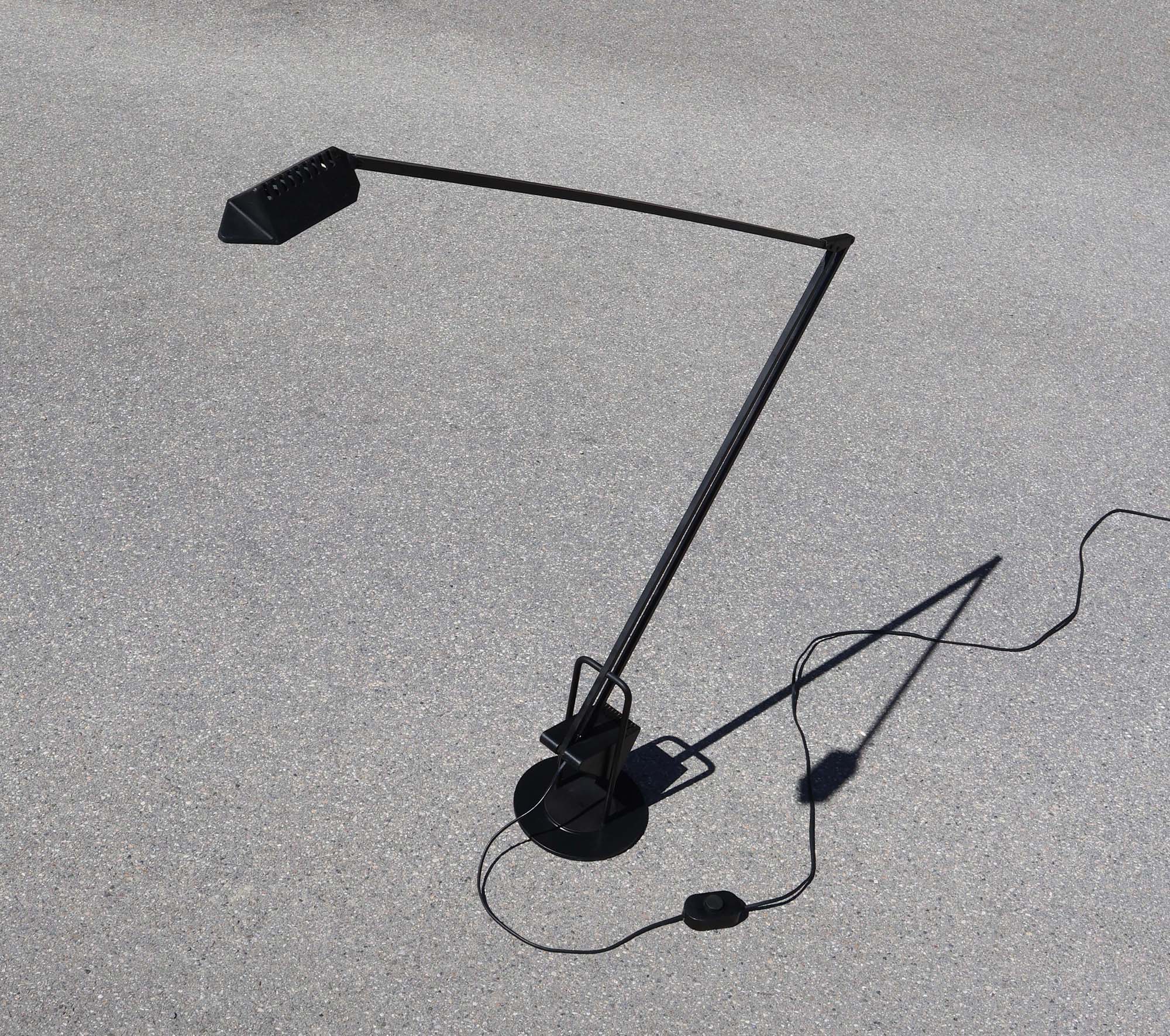 Finition noir mat / satiné. Fonctionnelle, l’on trouve encore les ampoules dans le commerce, (mais plus pour longtemps). Socle diamètre 20cm, bras en fin tube carré. Longueur totale avec tête, = 117cm. Légèrement tordue, et surface un peu usée / griffée.