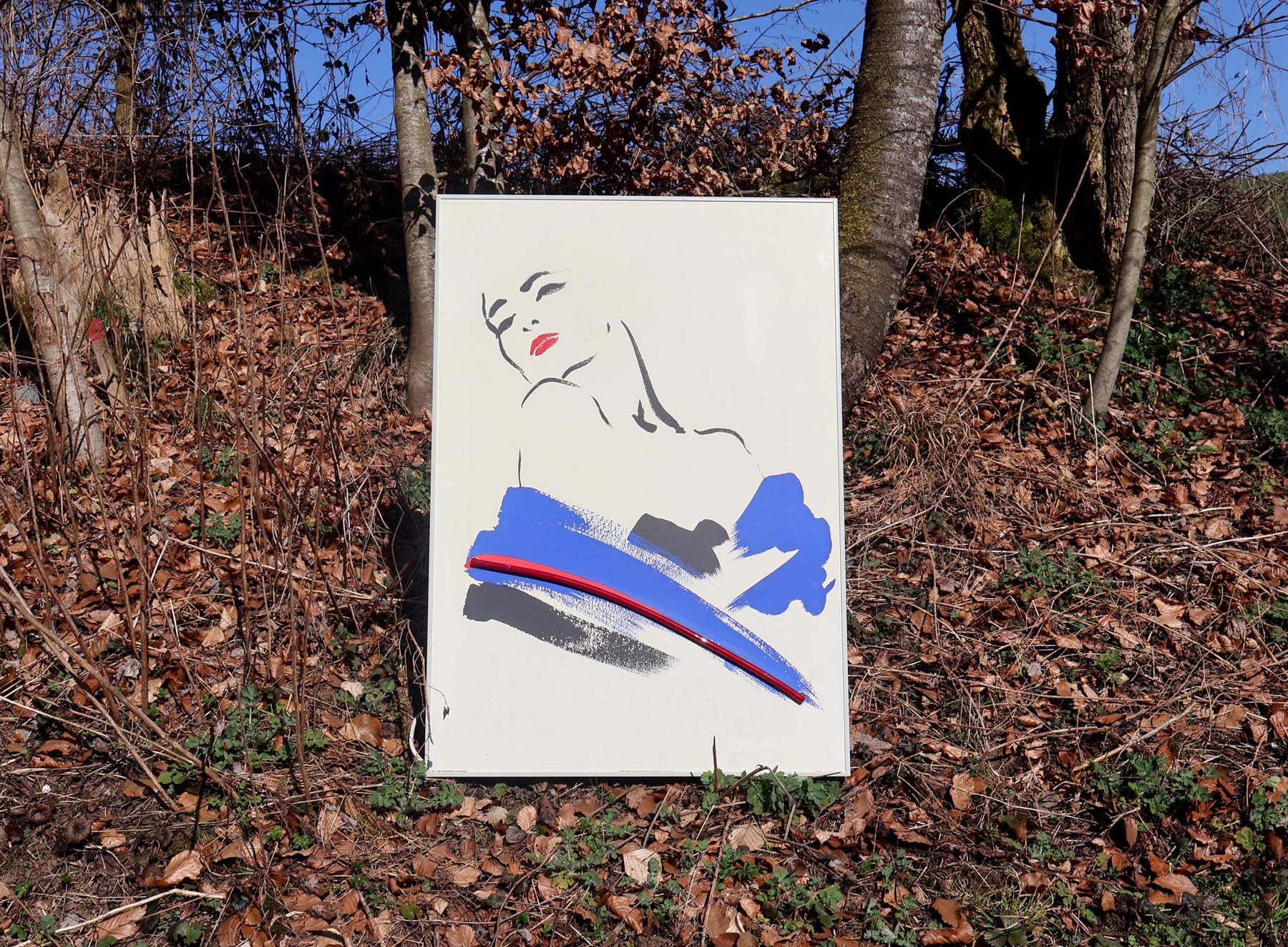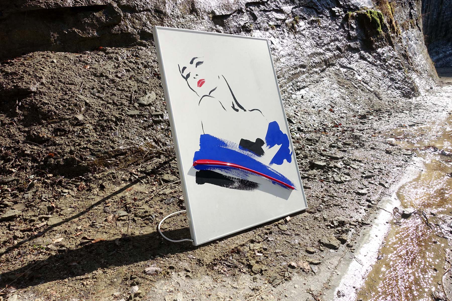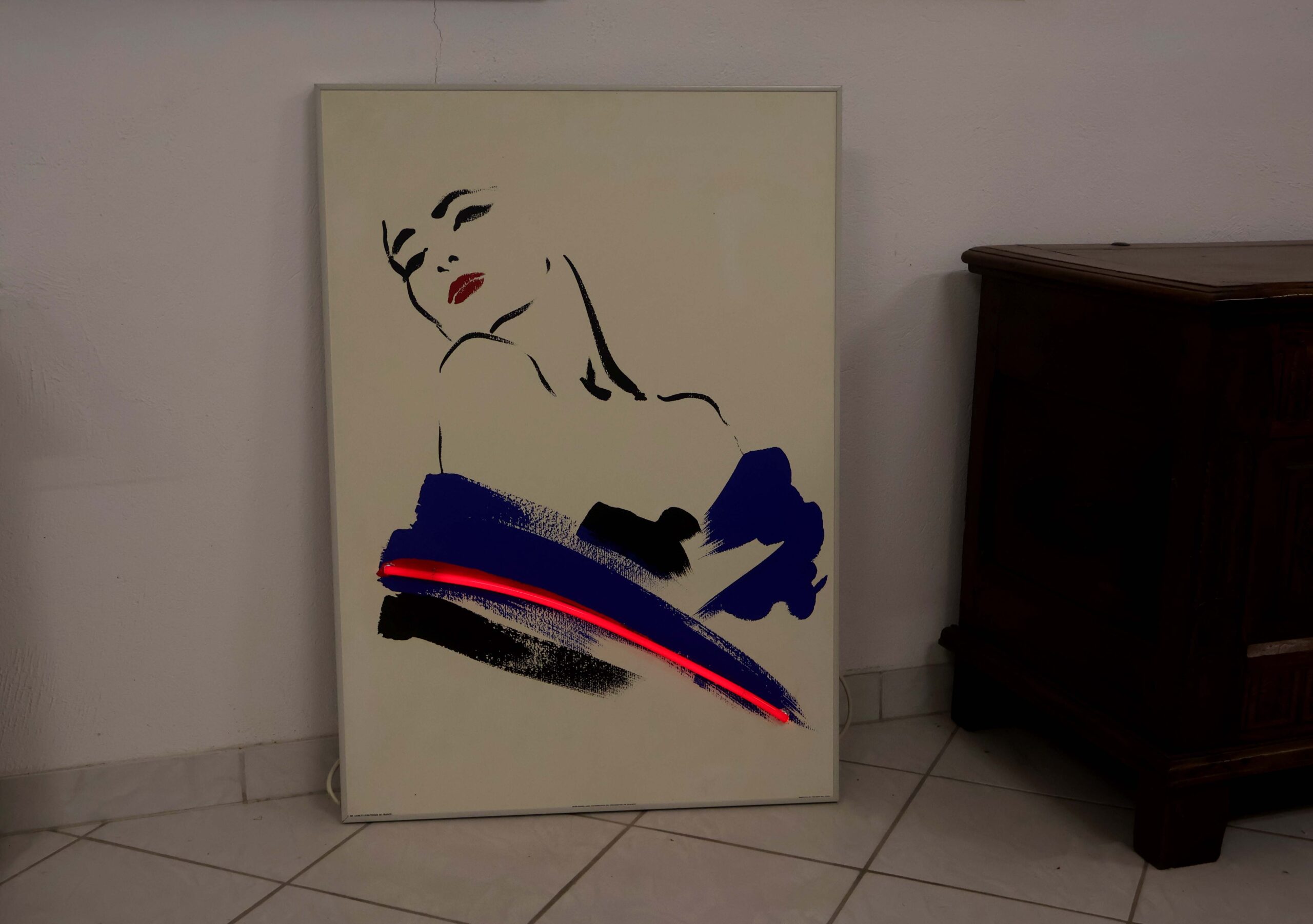 Poster sérigraphié encadré dans cadre en alu de marque Nielsen. Agrémenté d’un néon décoratif rouge. Transformateur à l’arrière, dans l’épaisseur de l’encadrement.