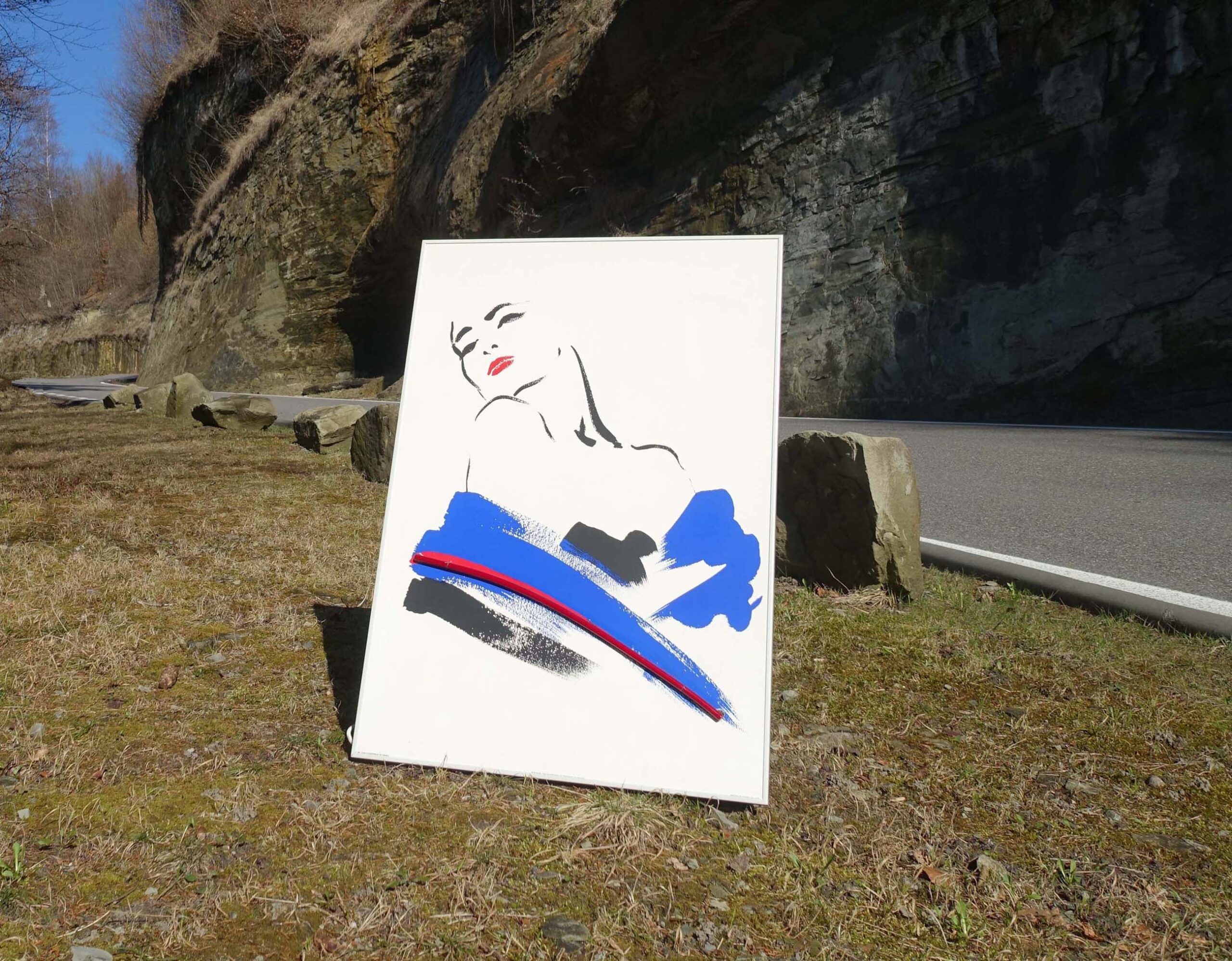Illustration stylisée, et minimaliste, d’une femme. J’ai retrouvé comme info, l’expression: “blue stole, red lips”. Que l’on peut traduire par étole bleue, lèvre rouges.