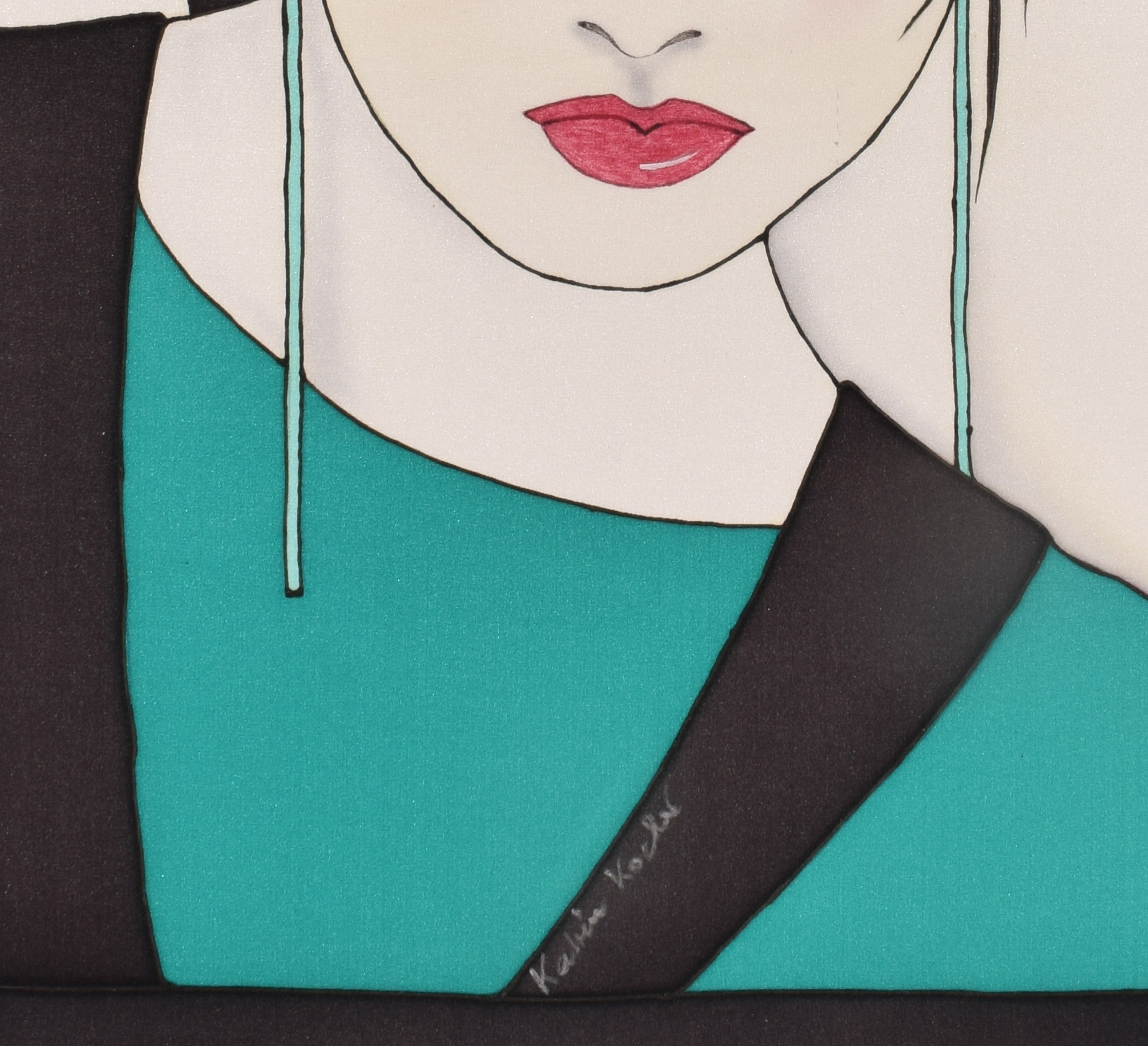 Peinture sur soie copie Nagel. Illustration sur soie, tendue sur un cadre un bois. Reproduction, (mais avec des couleurs différentes) d’une pin-up de Patrick Nagel.