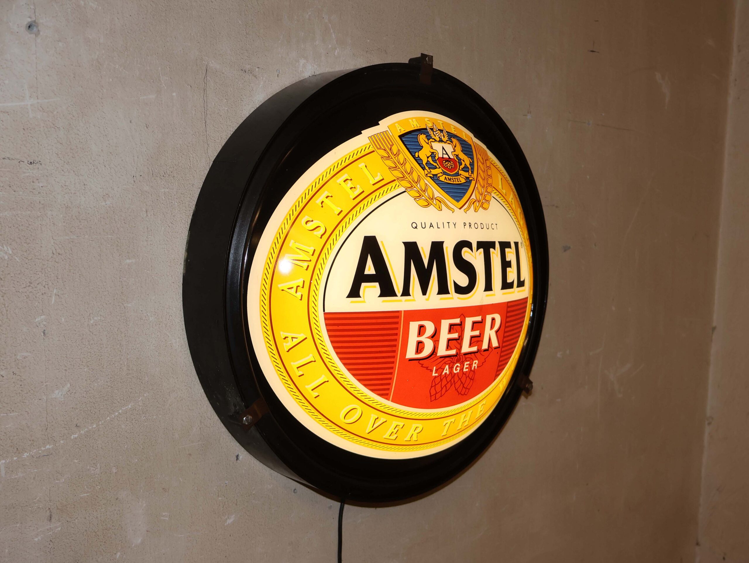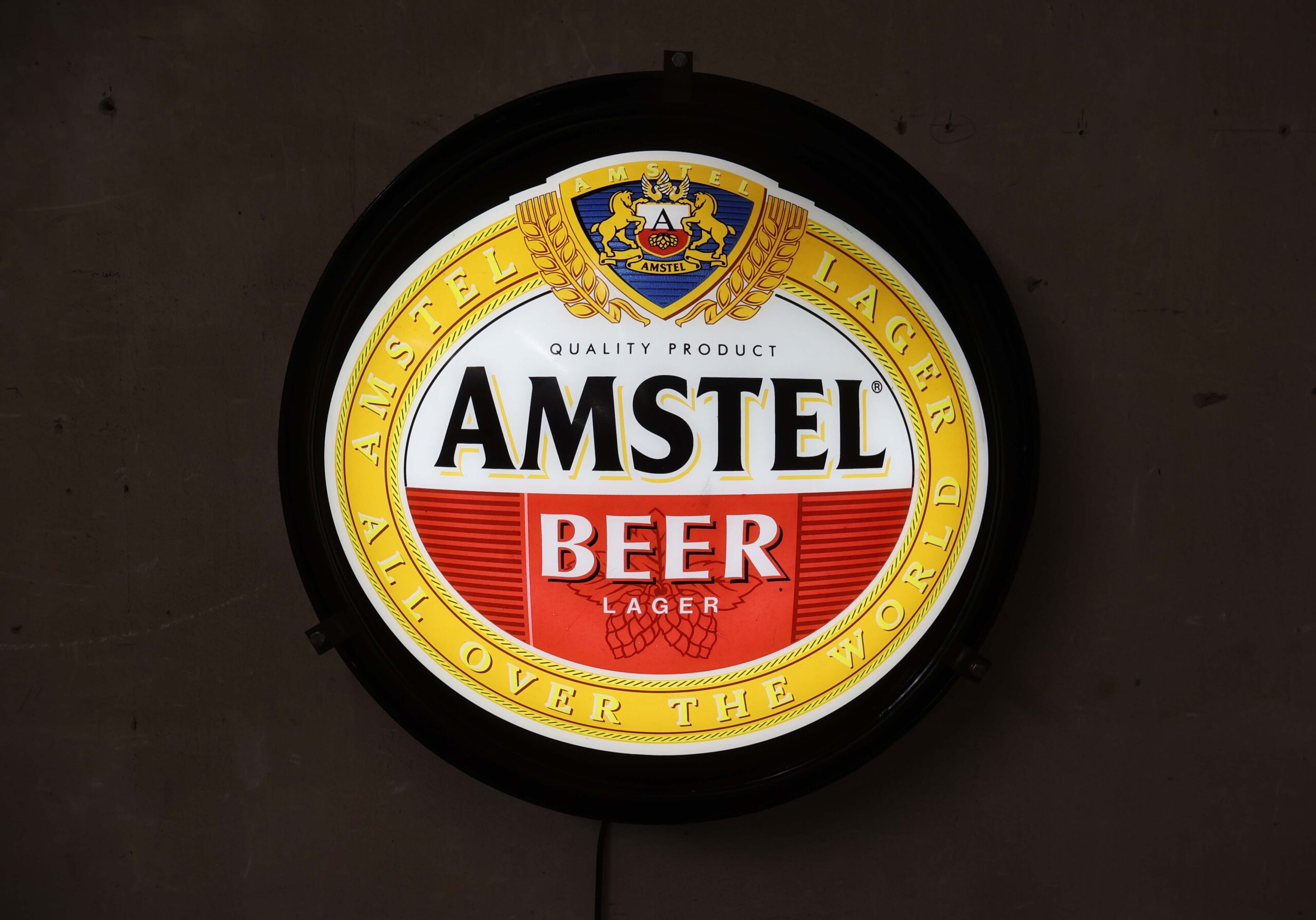 Amstel beer enseigne lumineuse vintage : Il s’agit d’une petite enseigne publicitaire illuminée, pour la marque de bière Hollandaise “Amstel”. Le nom Amstel vient d’un fleuve canalisé qui traverse la ville d’Amsterdam.