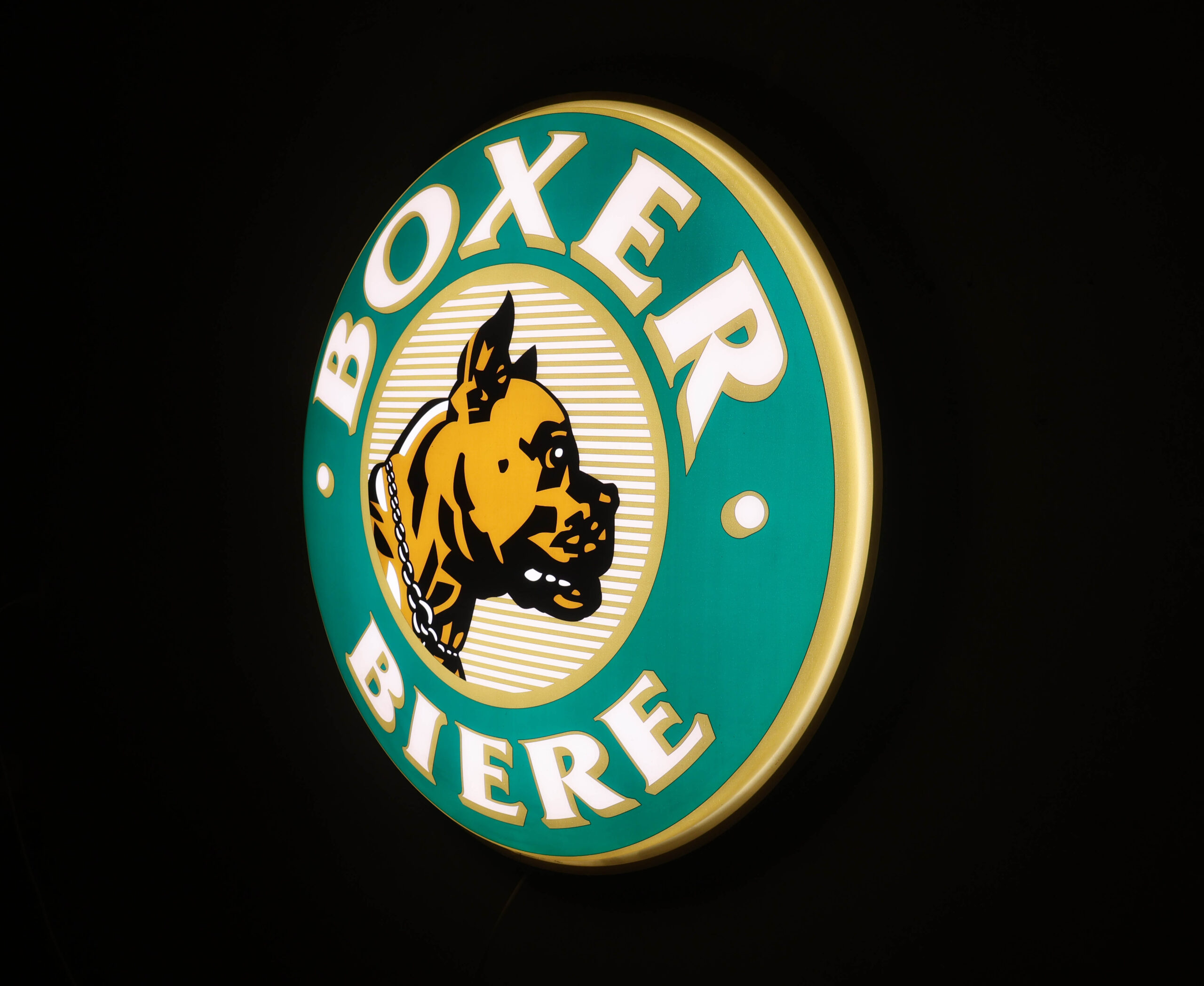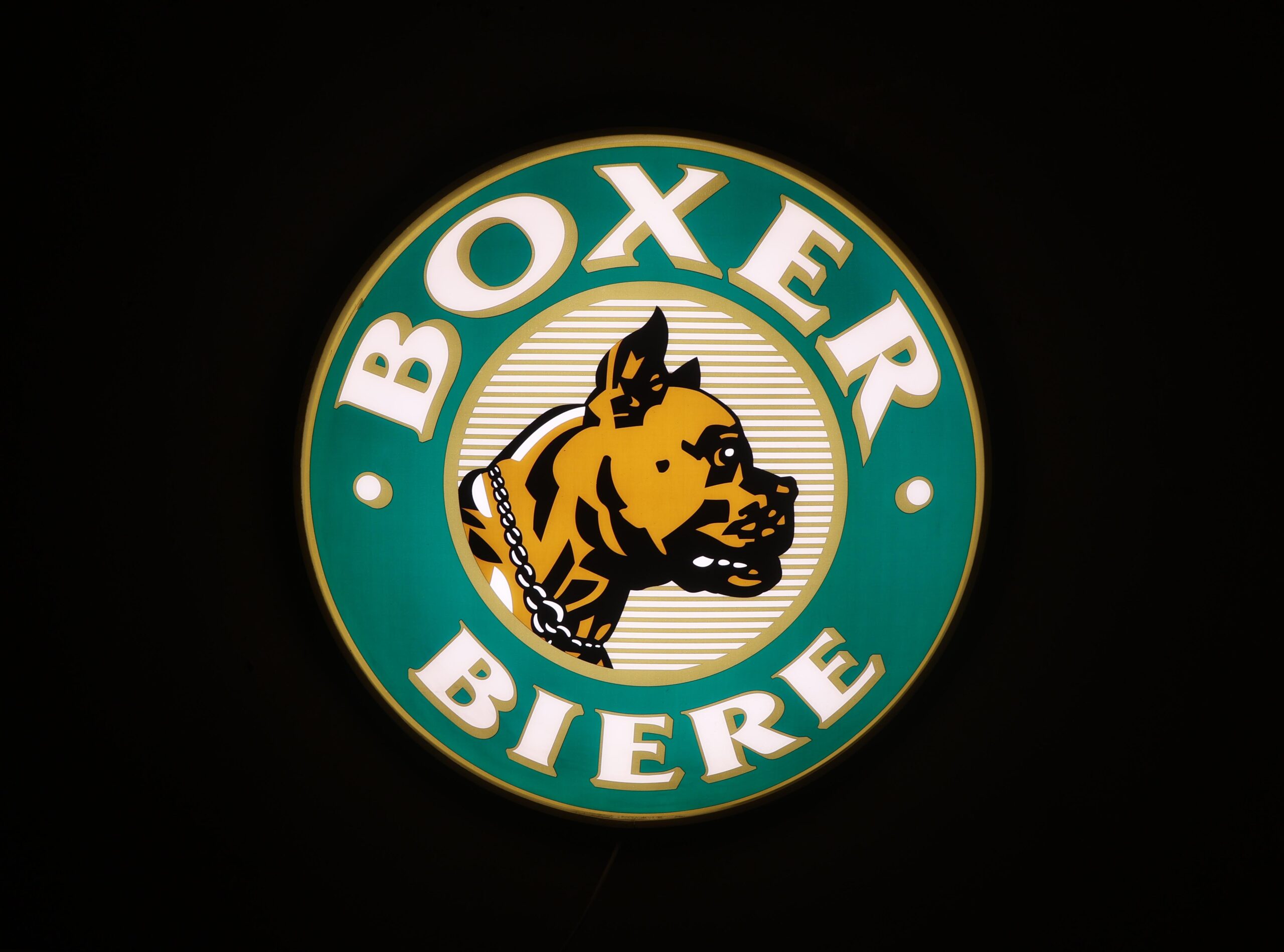 Bière Boxer enseigne lumineuse. C’est une enseigne ronde, publicité lumineuse, pour la bière Suisse de la brasserie du Boxer de Romanel-sur-Lausanne: Ce qui fait son intérêt, c’est la belle illustration d’une tête de chien de la race Boxer.