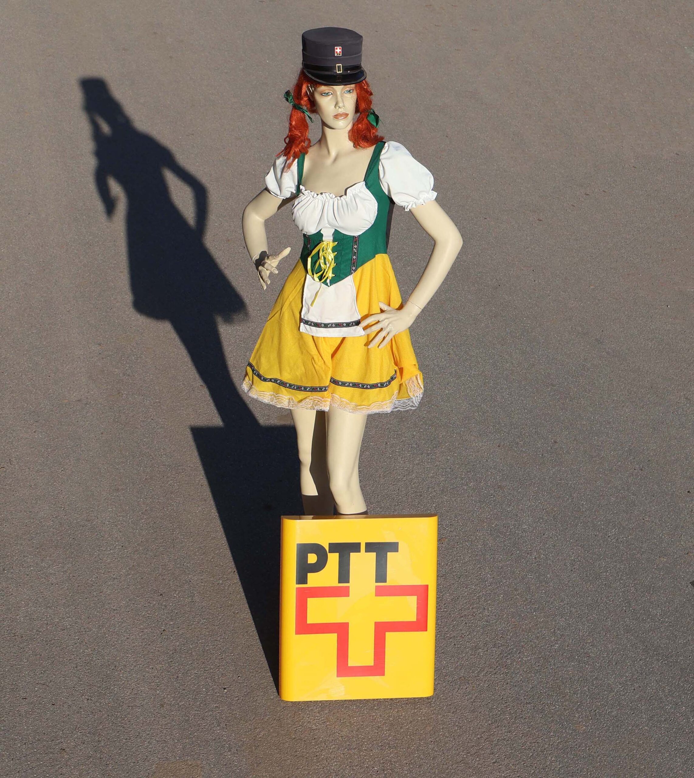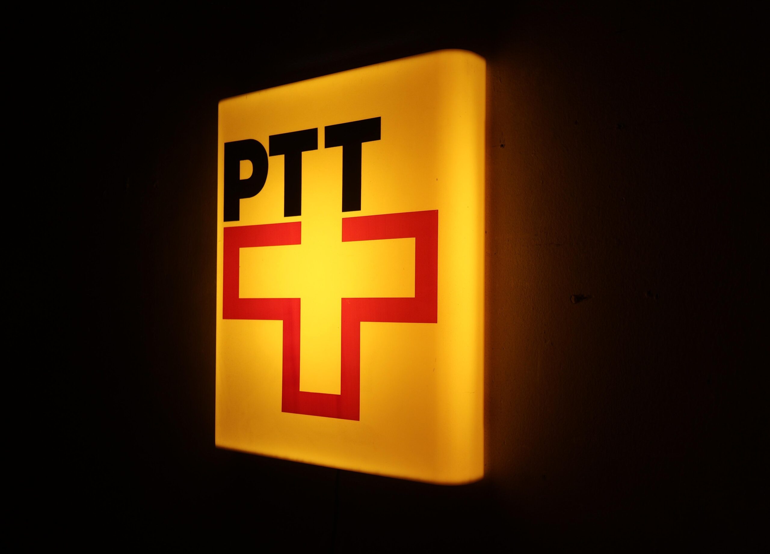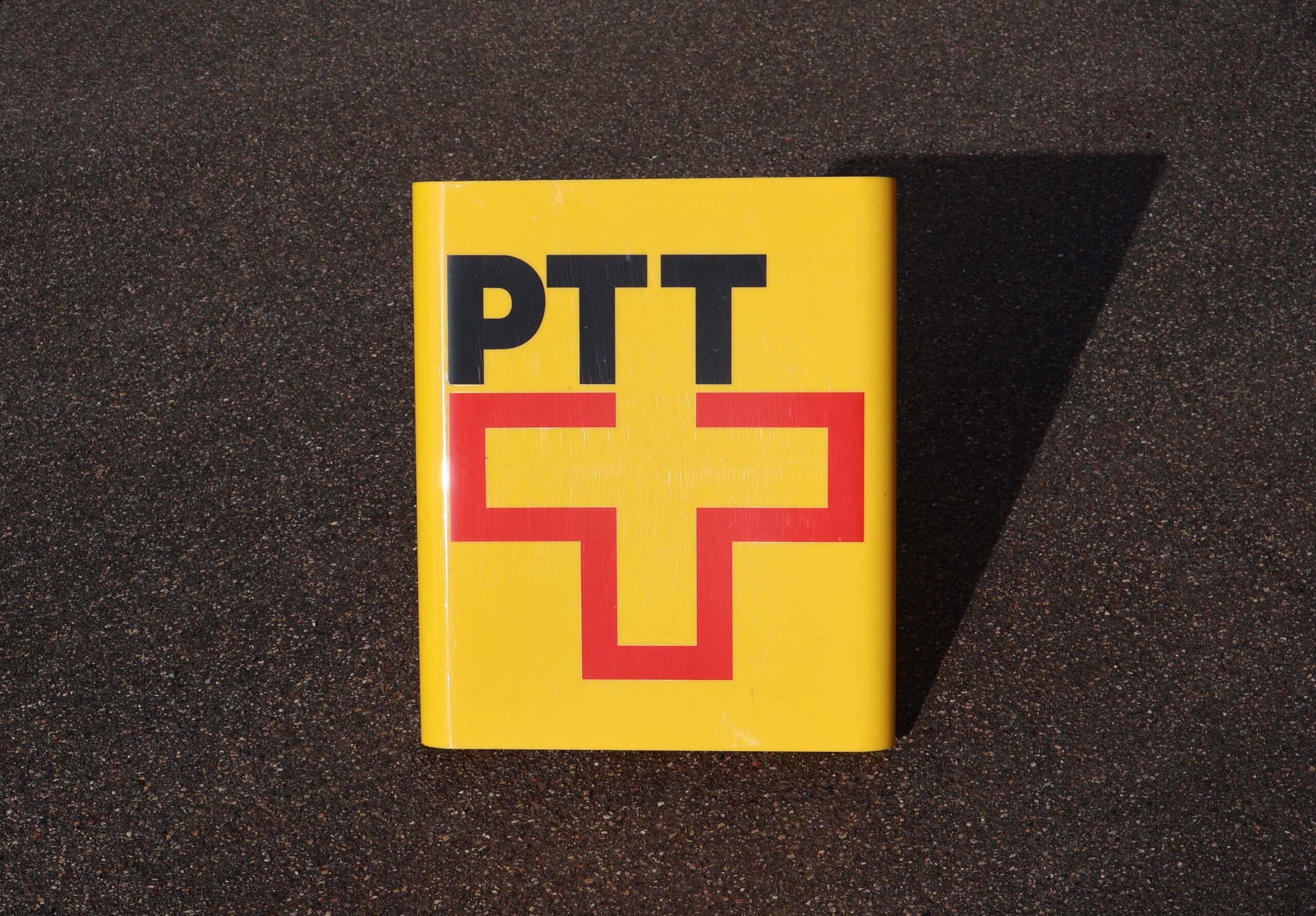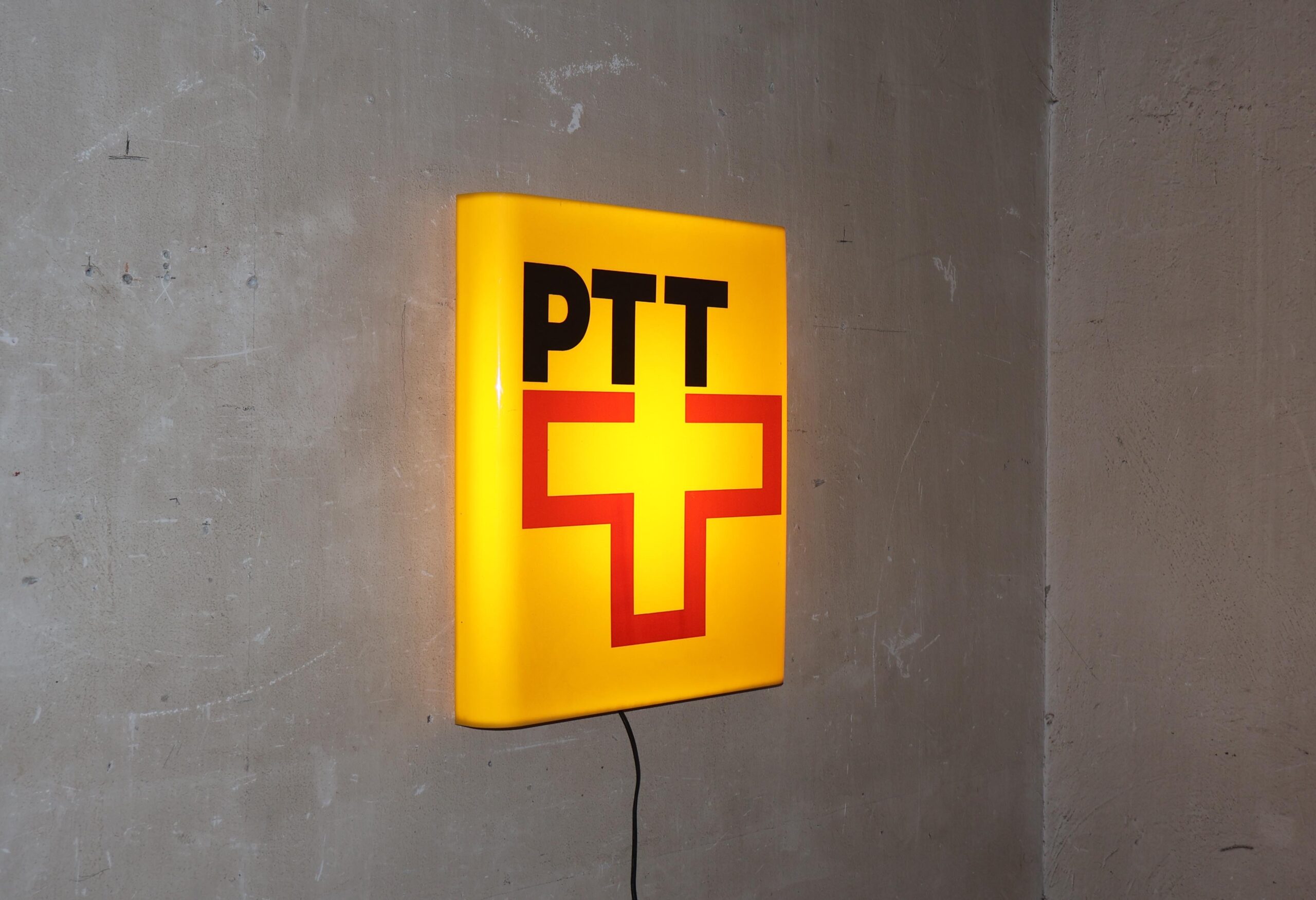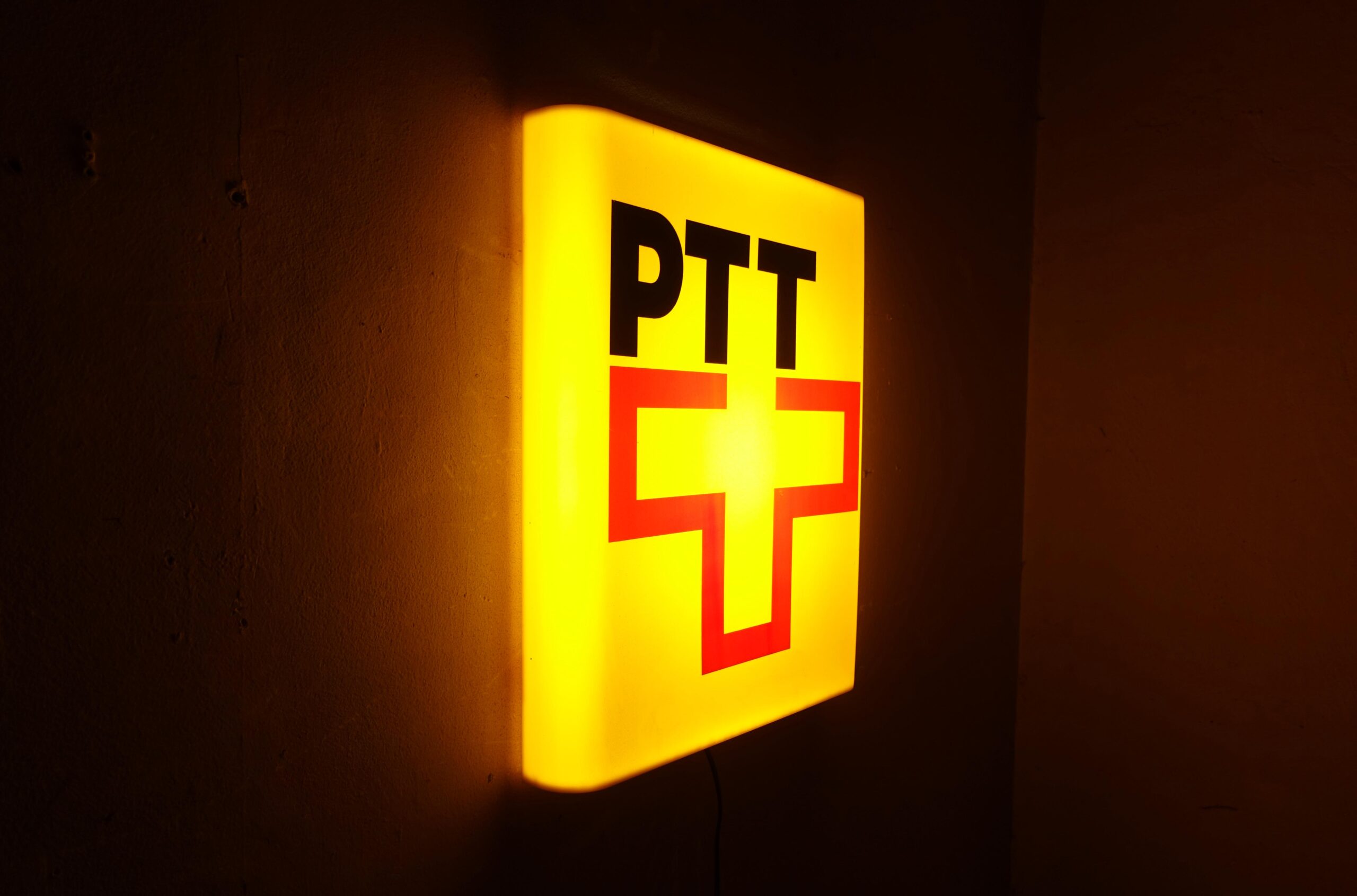 Enseigne lumineuse PTT 1989. Petite enseigne simple face, de bureau postal Suisse, d’après le logo esquissé par Martin Altenburger, et finalisé en 1983 par le graphiste / typographe Adrian Frutiger.