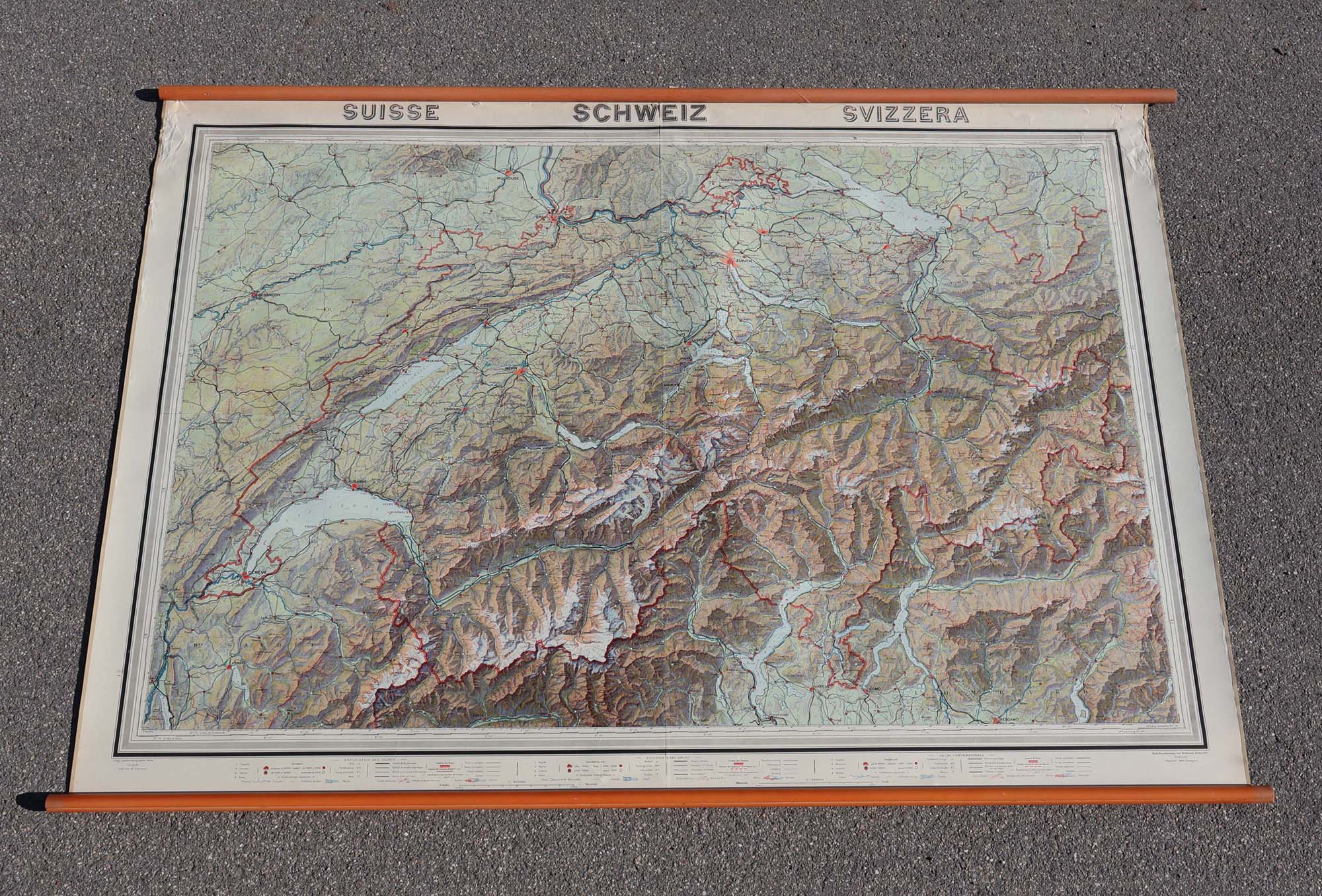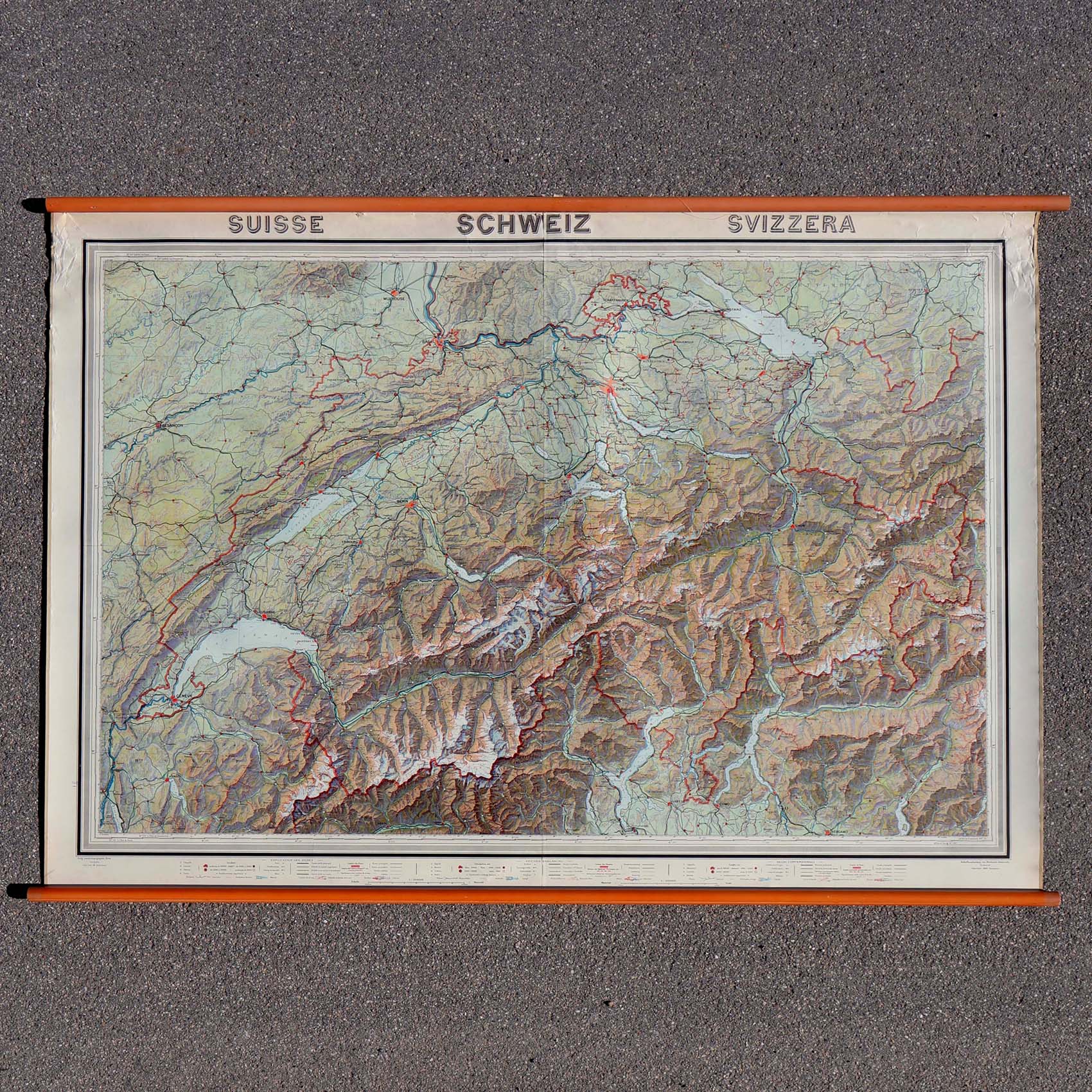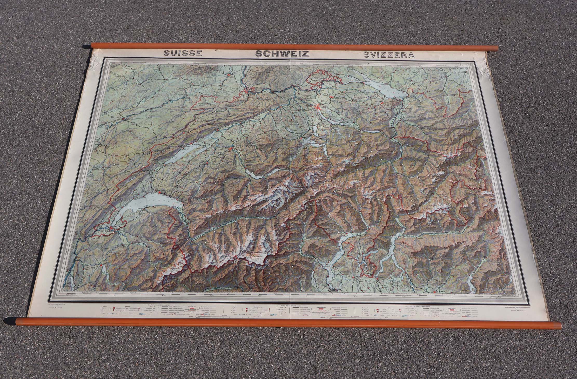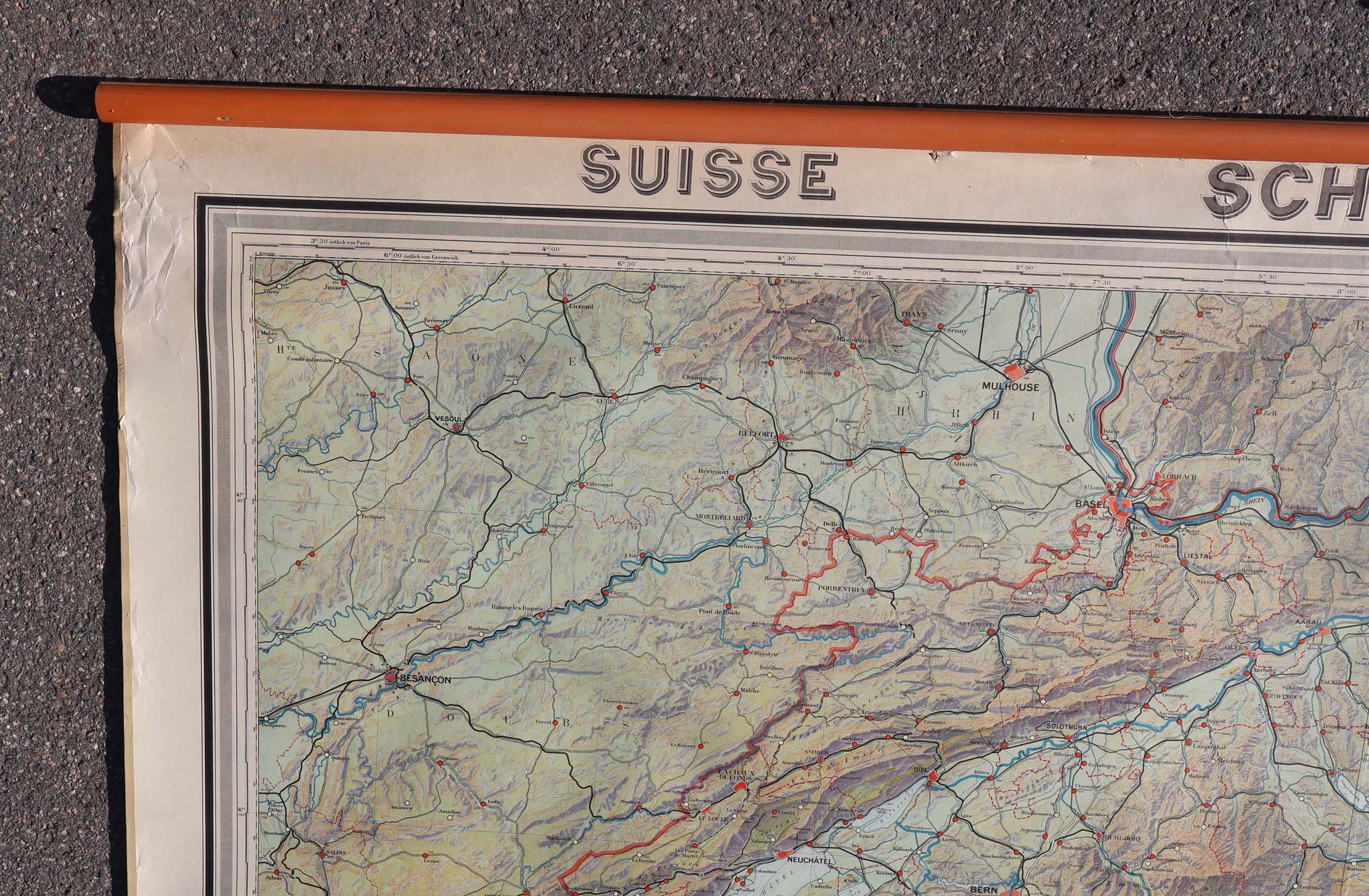 Carte scolaire Suisse 1964 : C’est une grande carte murale d’école Helvétique. Entoilée, avec des lattes en bois. Représentation de la Suisse, à l’échelle 1:200’000.