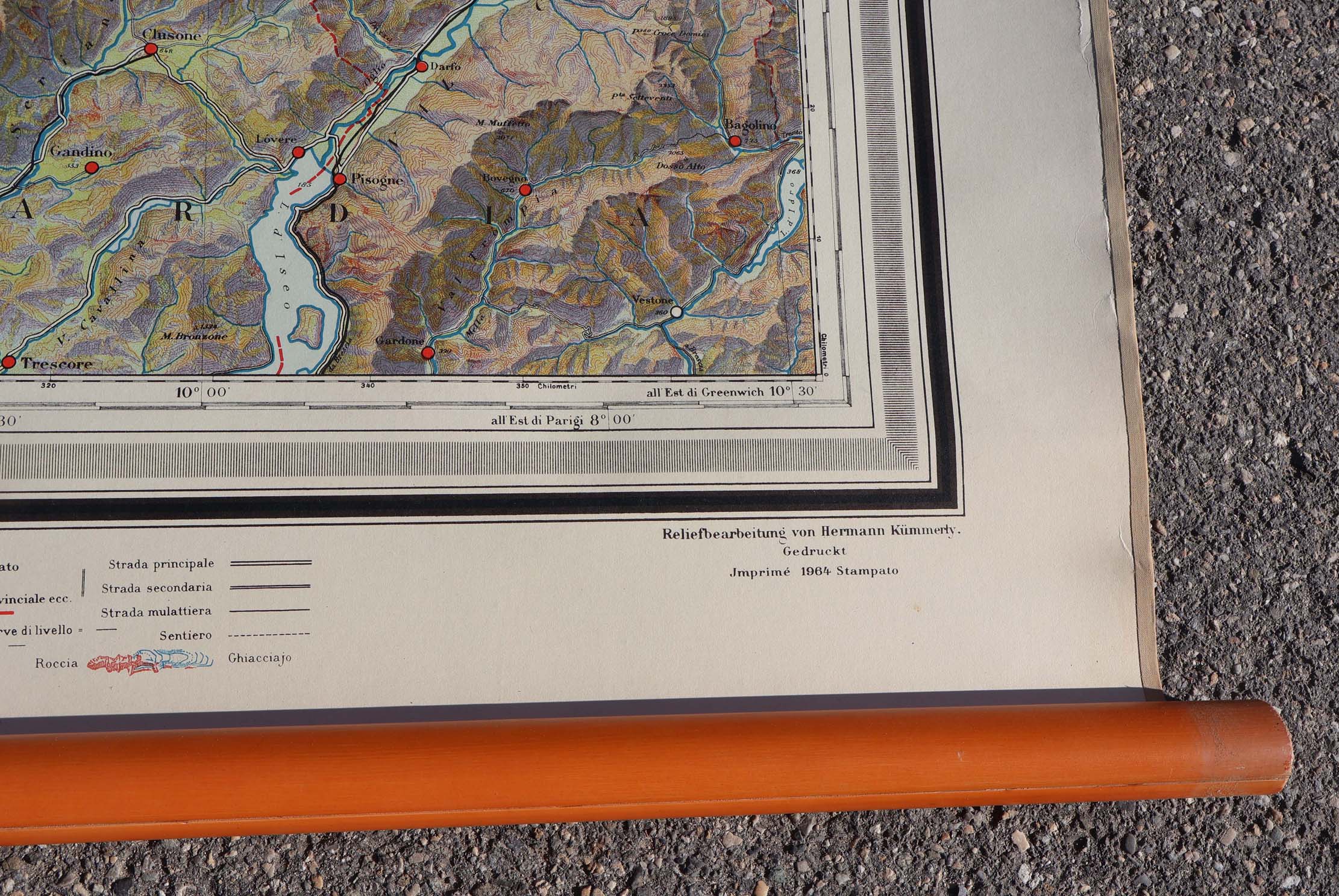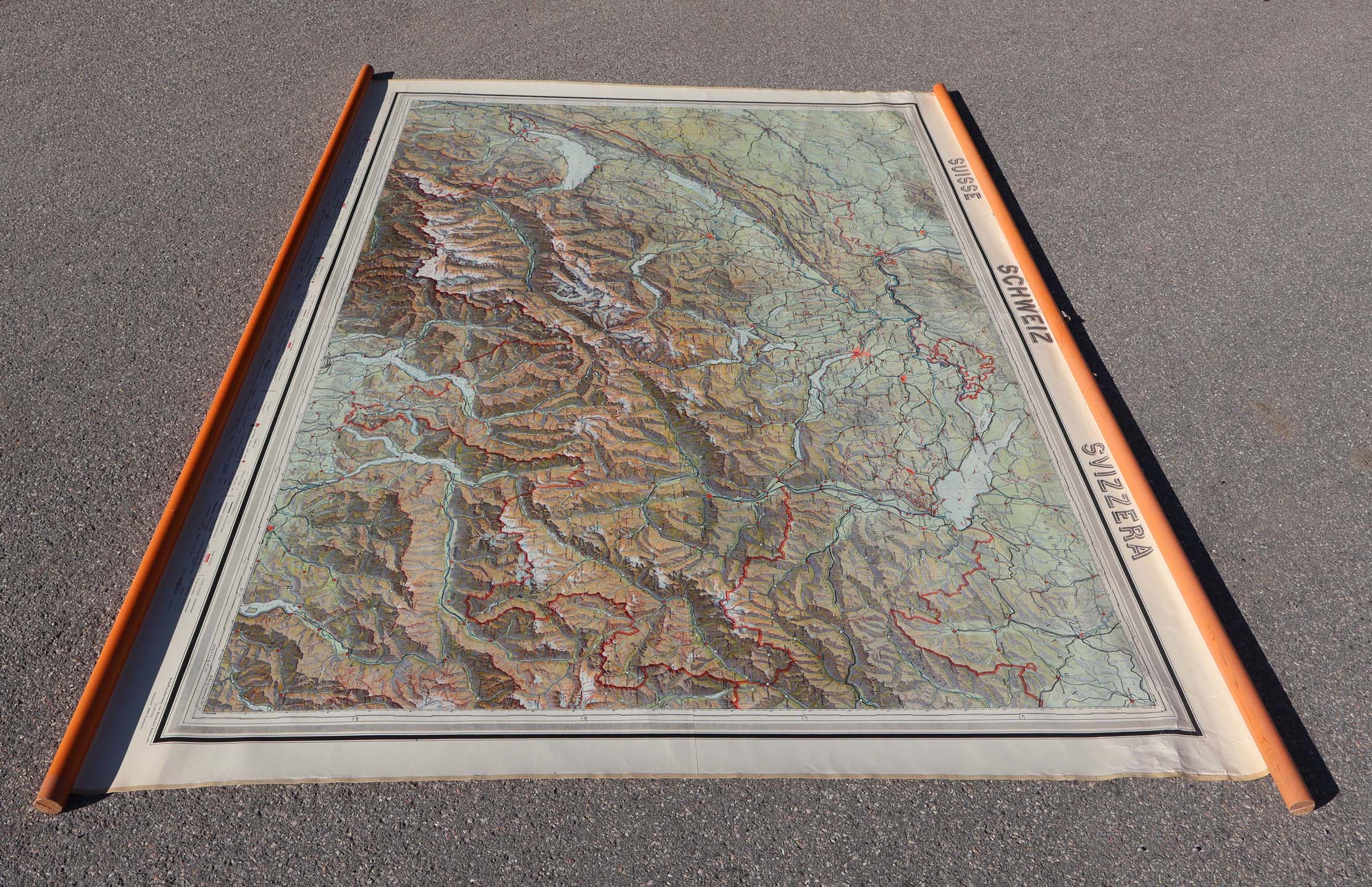 Datée de 1964, éditeur Hermann Kümmerly. Largeur de la toile 208cm longueur totale des lattes 213, et hauteur totale avec celles-ci = 148cm. Un peu froissée en haut des 2 côtés, et mini déchirures, mais sinon propre, pas jaunie, et belle présentation.