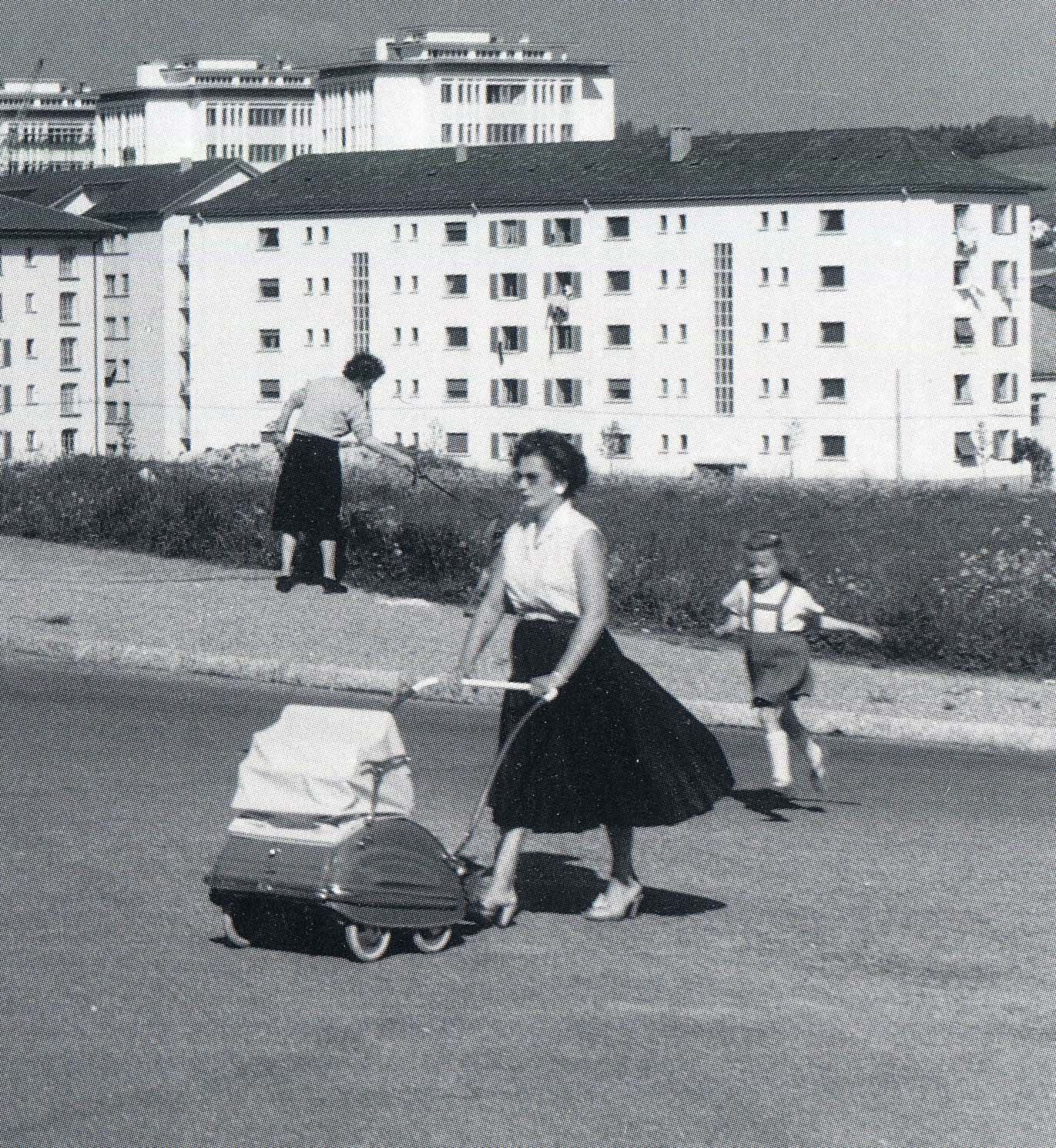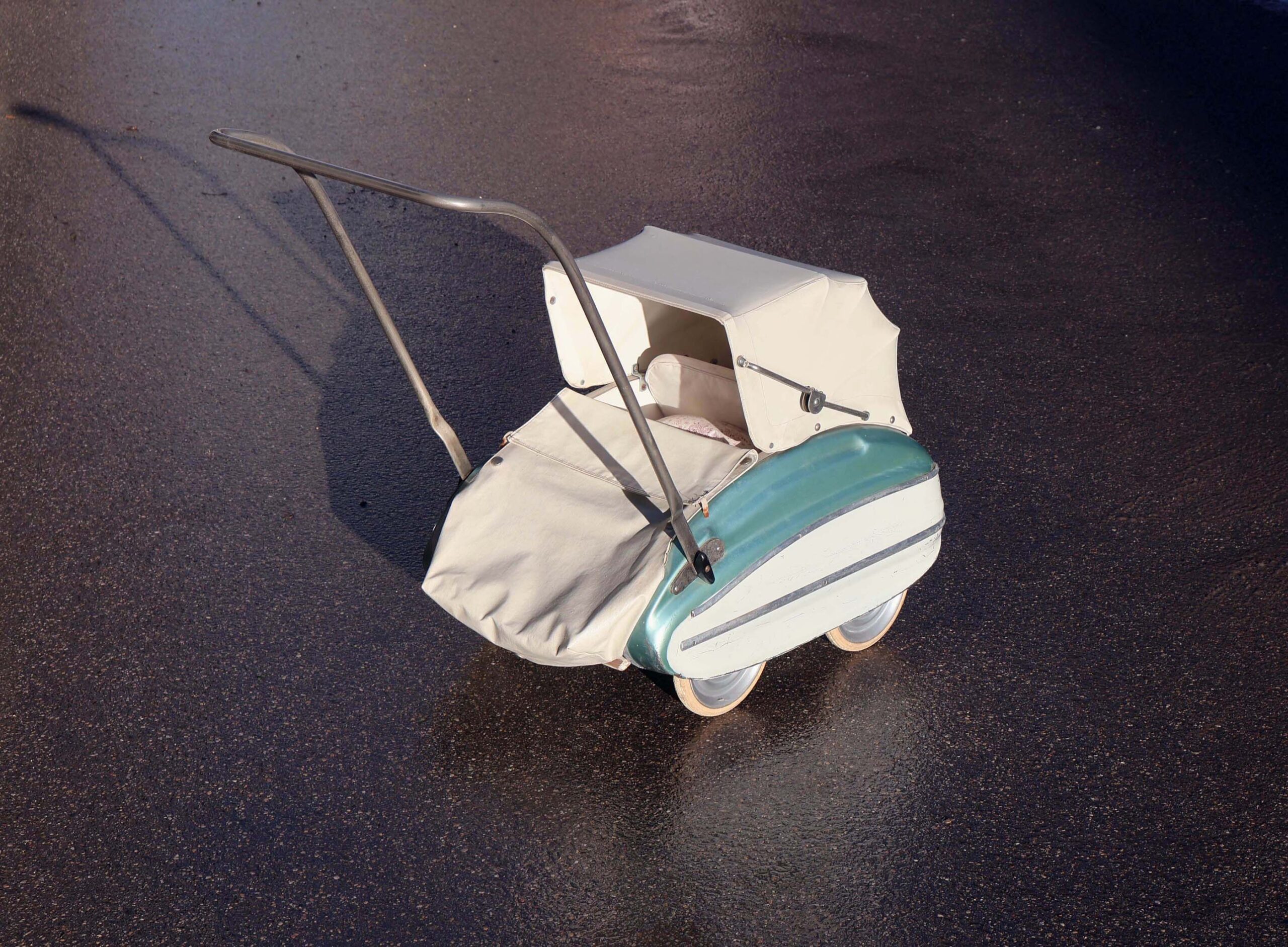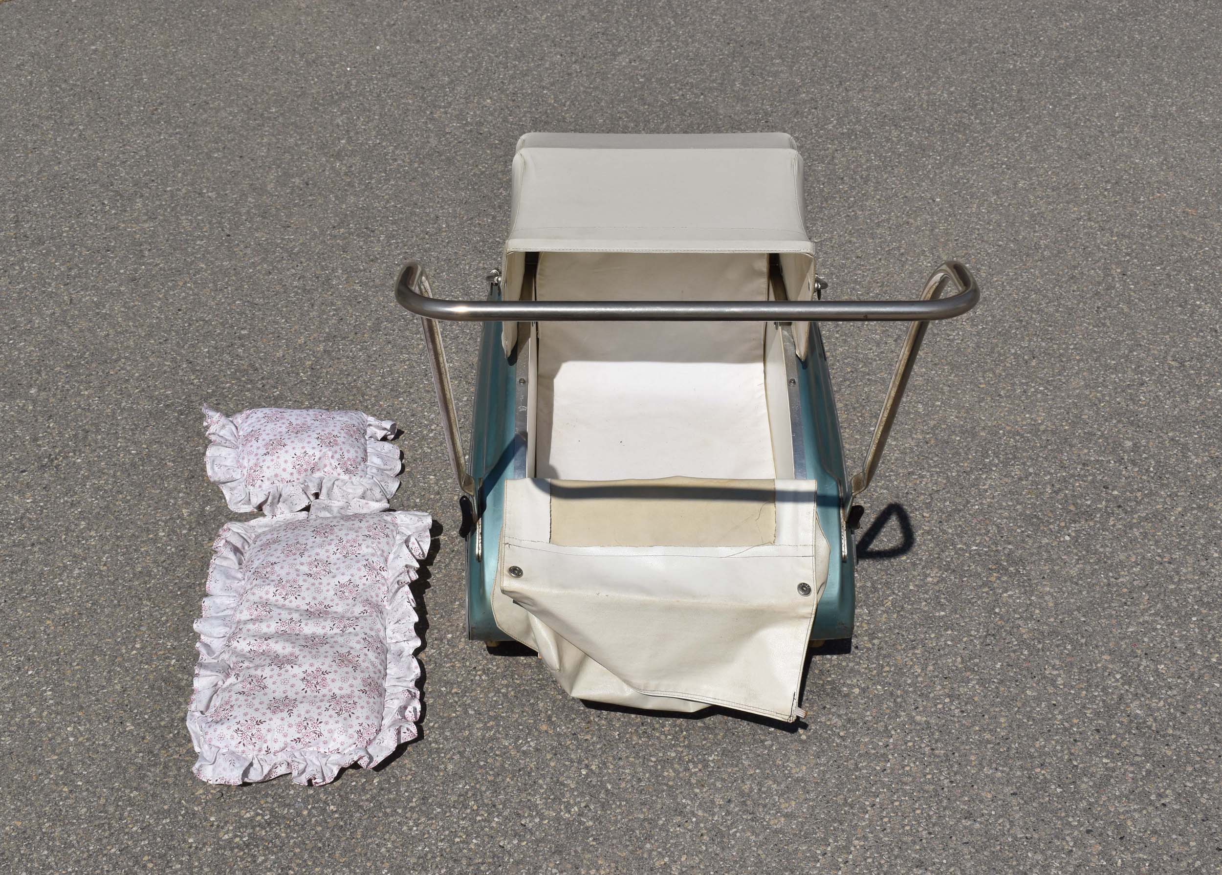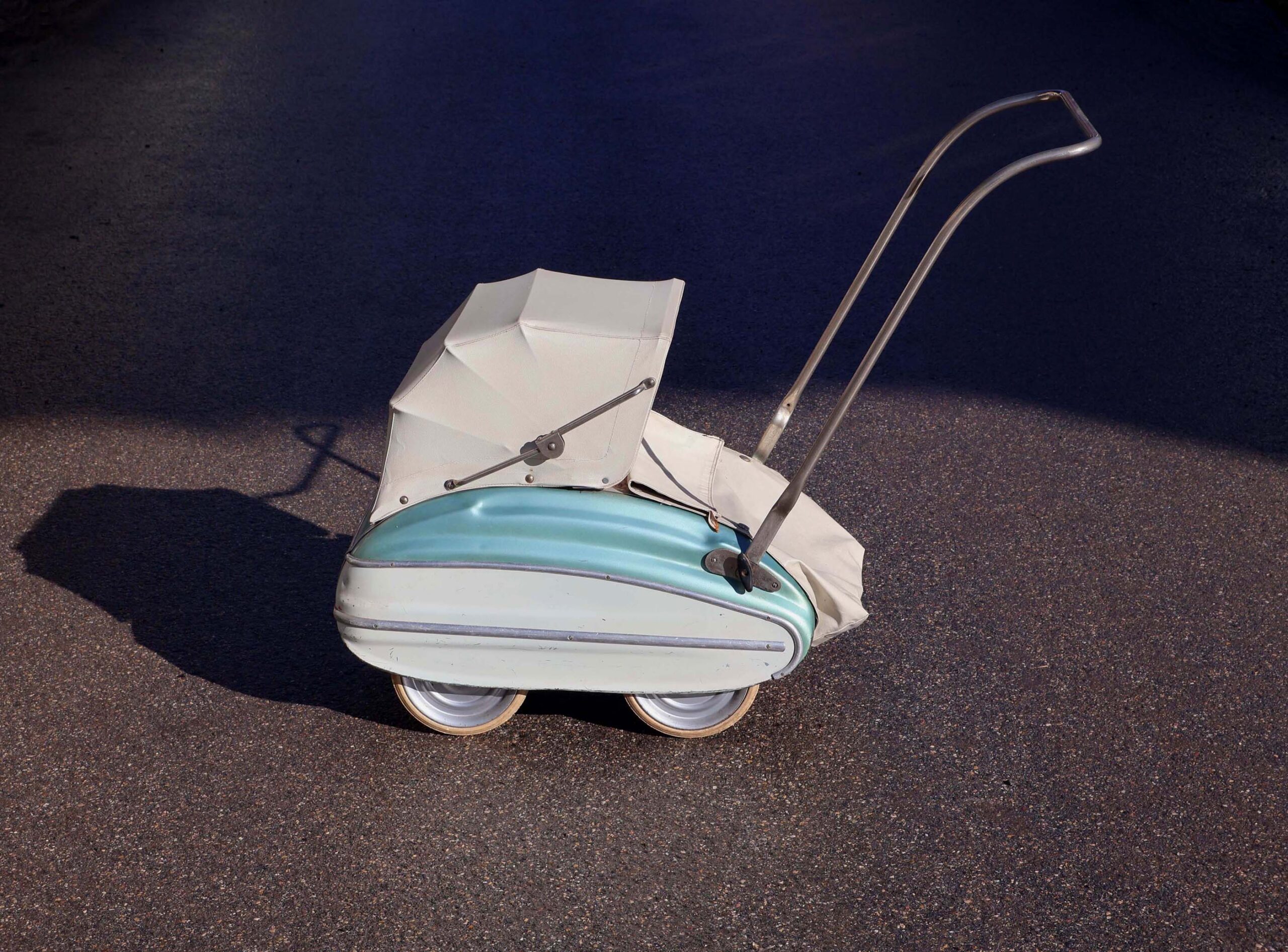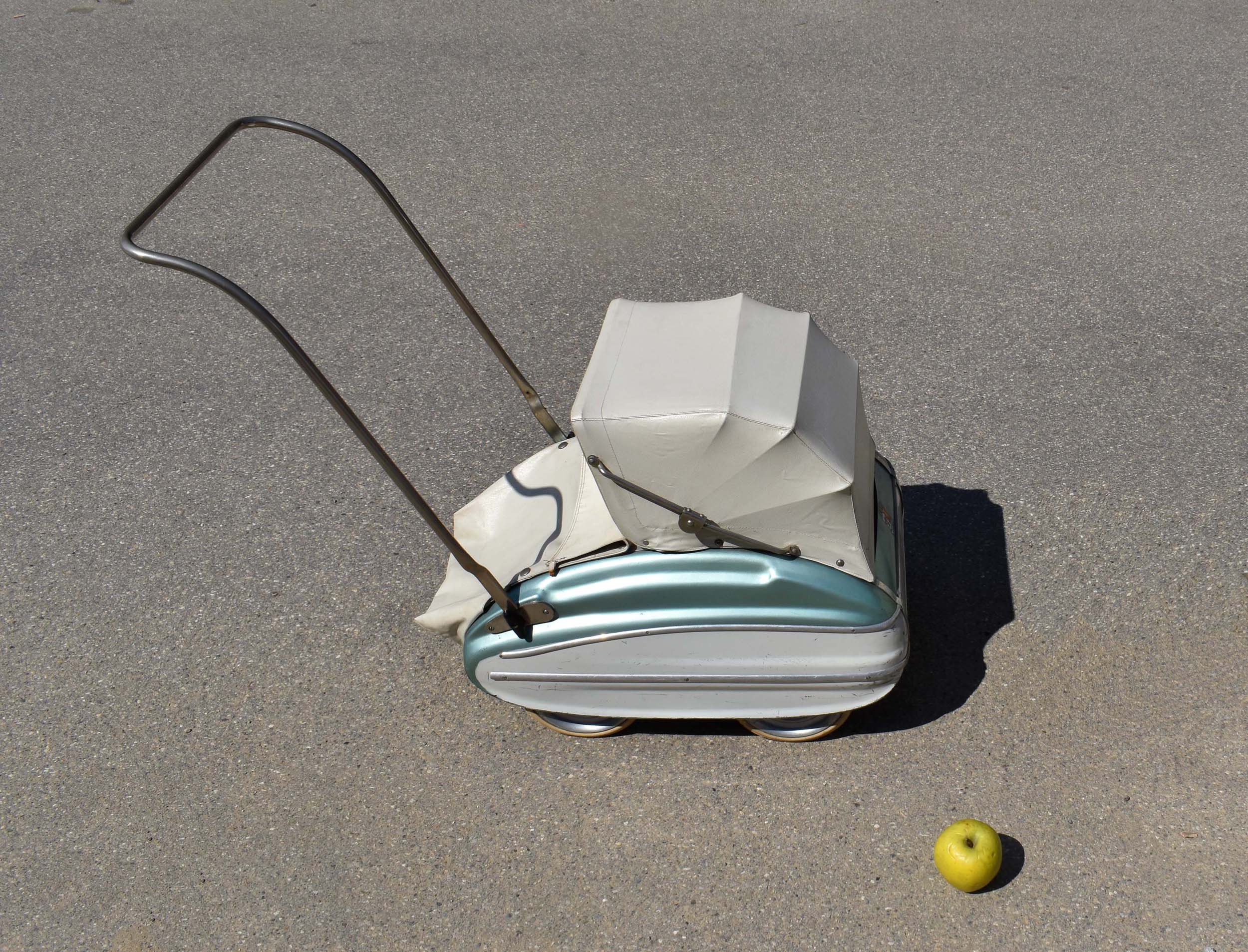 Ce n’est pas un modèle pour “vrai” bébé, car trop petite et poignée trop basse. Donc c’est un jouet pour fillette. Landau de poupée en tôle emboutie. Bicolore: Bleu métallisé et blanc, avec joncs en alu poli.