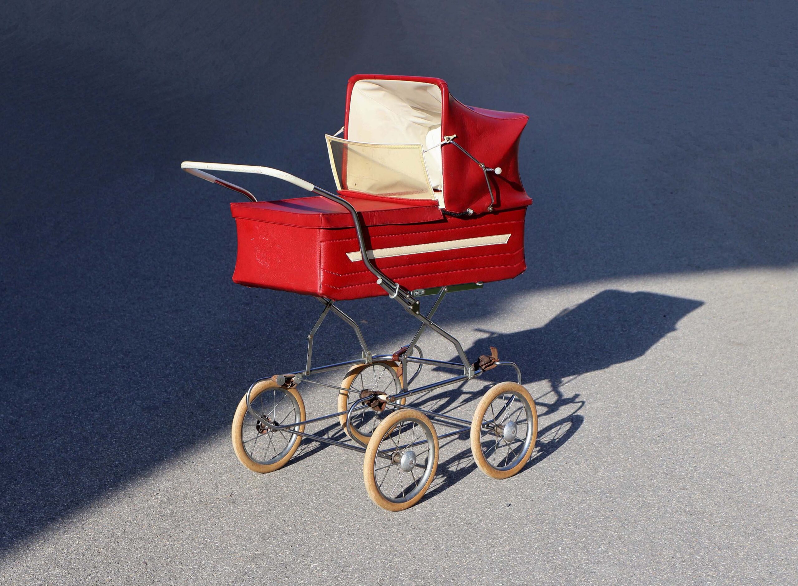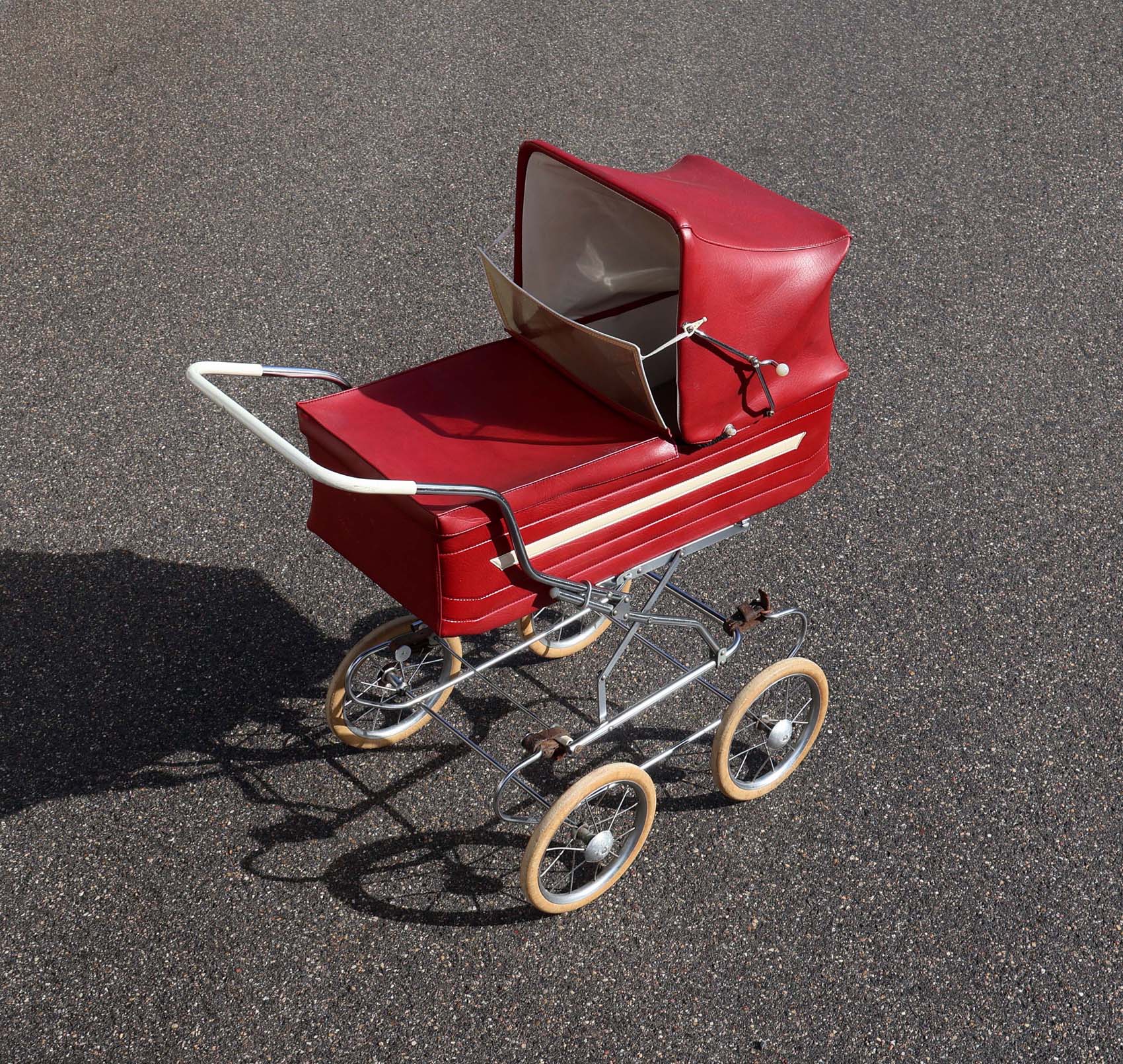 Poussette vintage 1960’s. C’est un petit landau pour bébé, de la fin des années 1960, début 1970. Modèle pliant, en vinyle rouge.