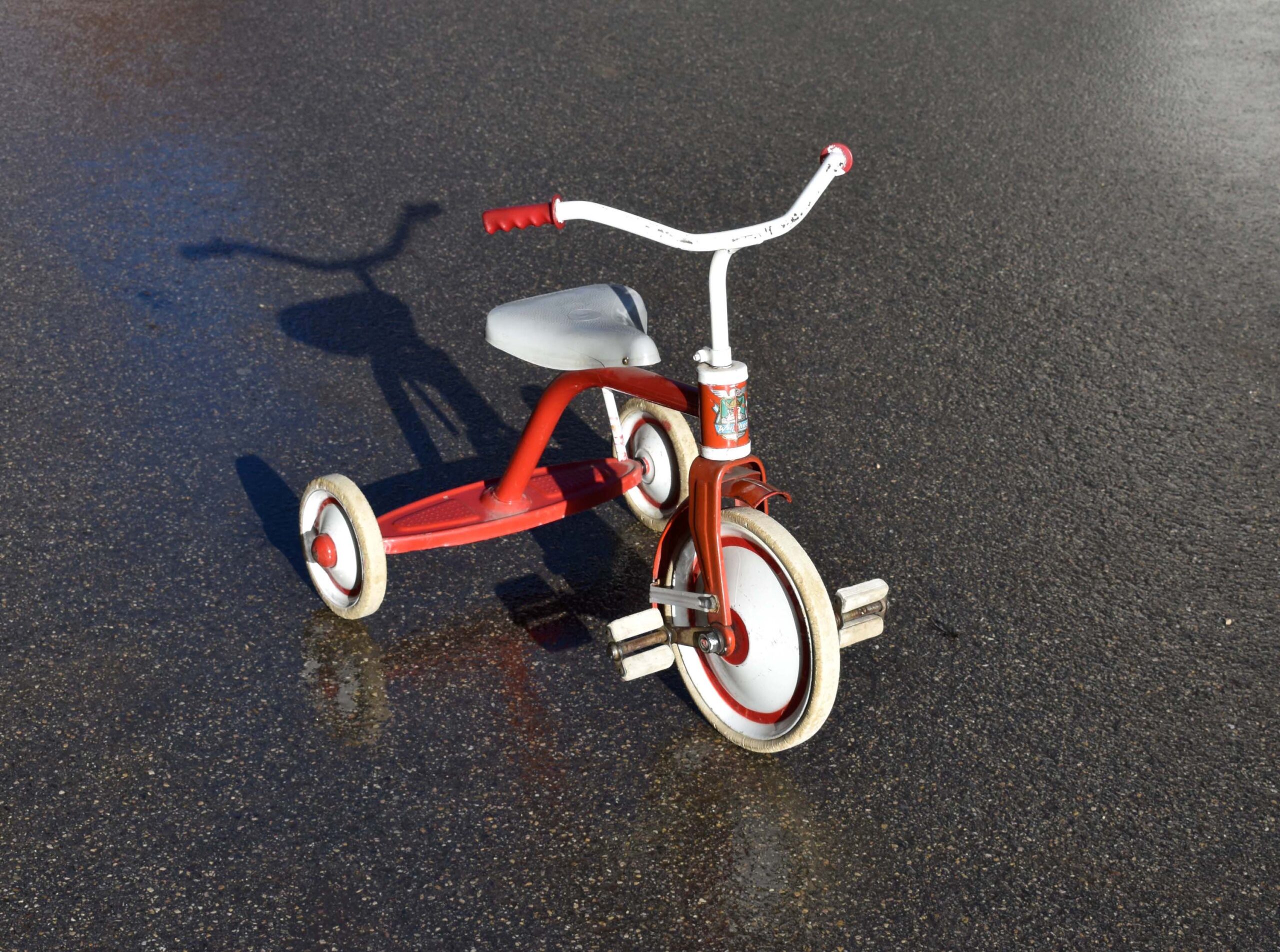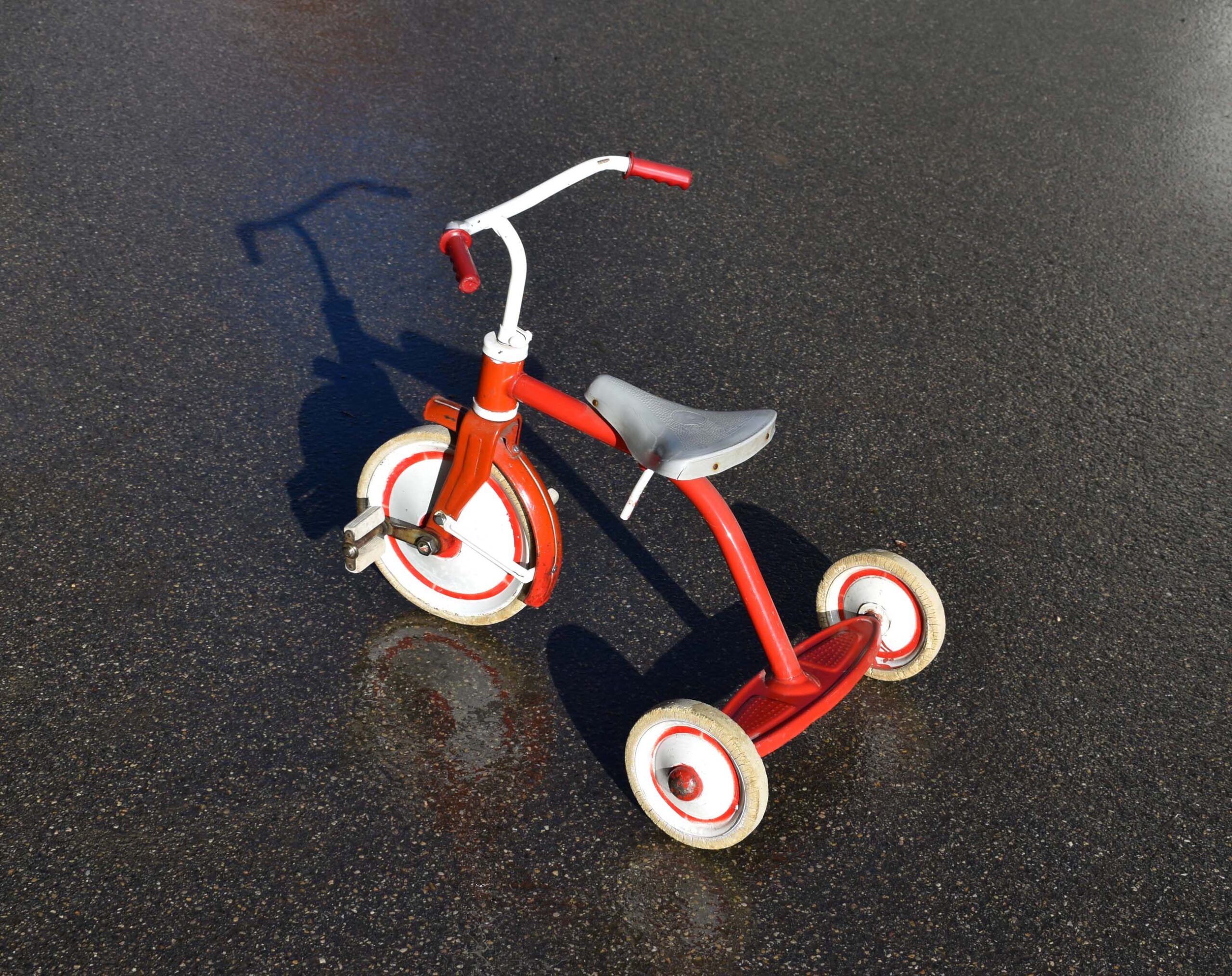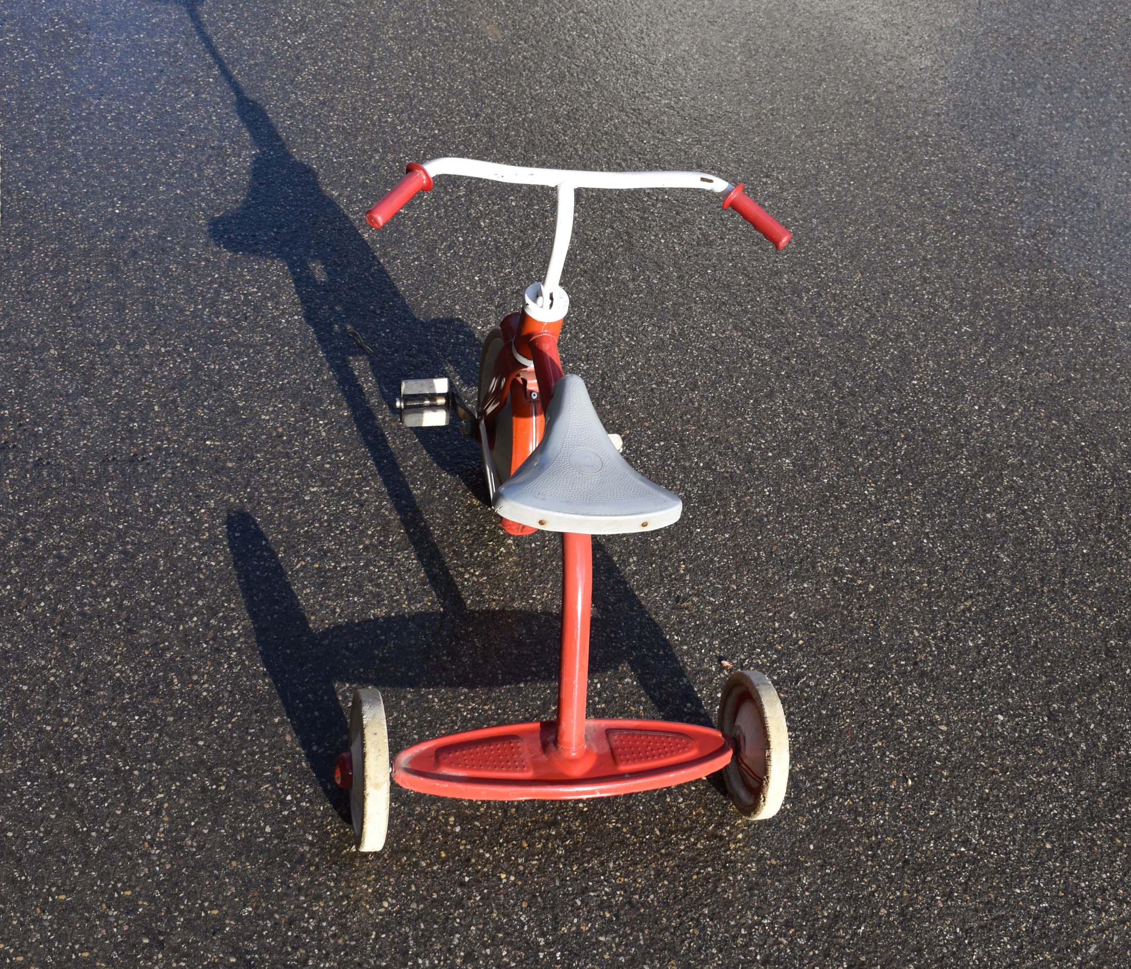 Tricycle Winther 1970s. C’est un petit tricycle pour enfants en bas âge, de la marque Danoise Winther. Avec le code couleur blanc et rouge, typique de l’époque.