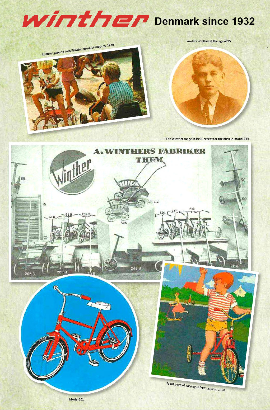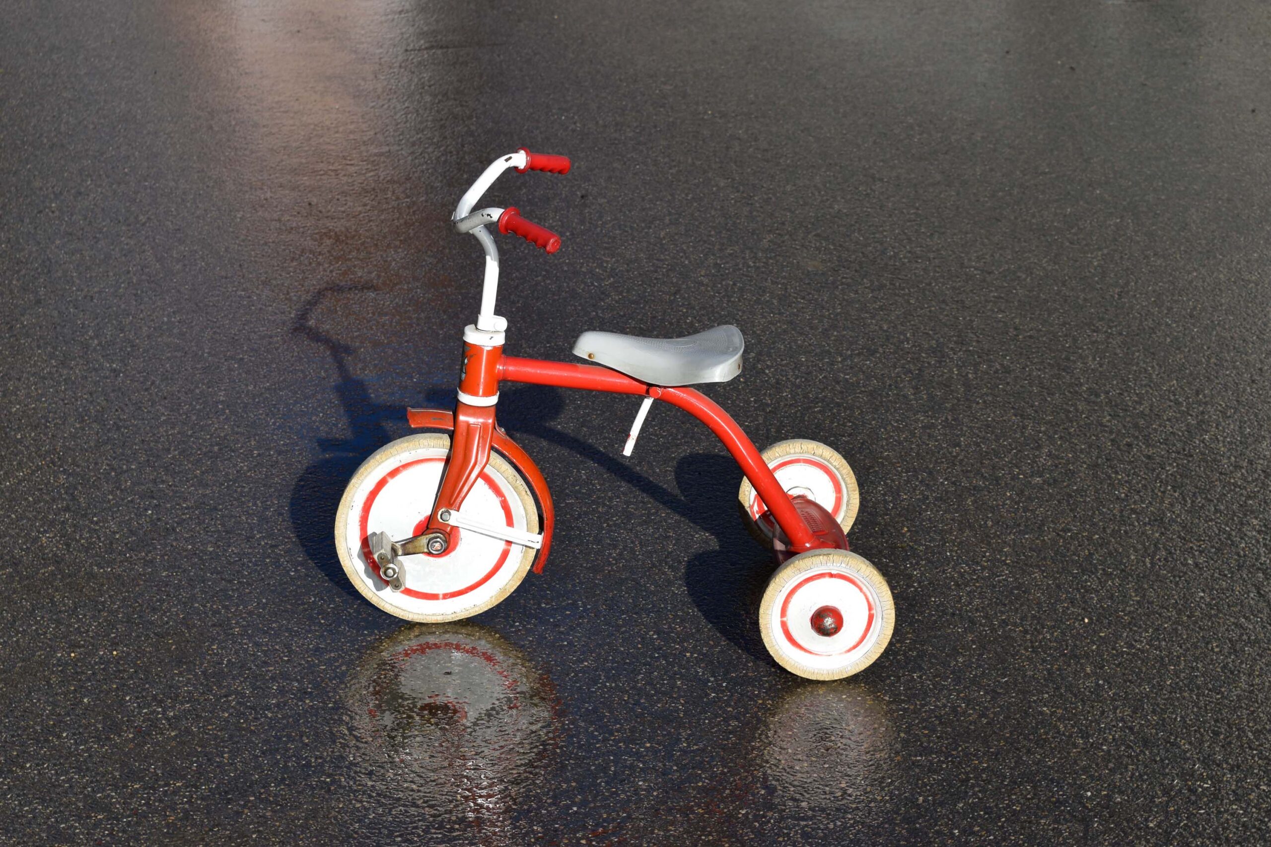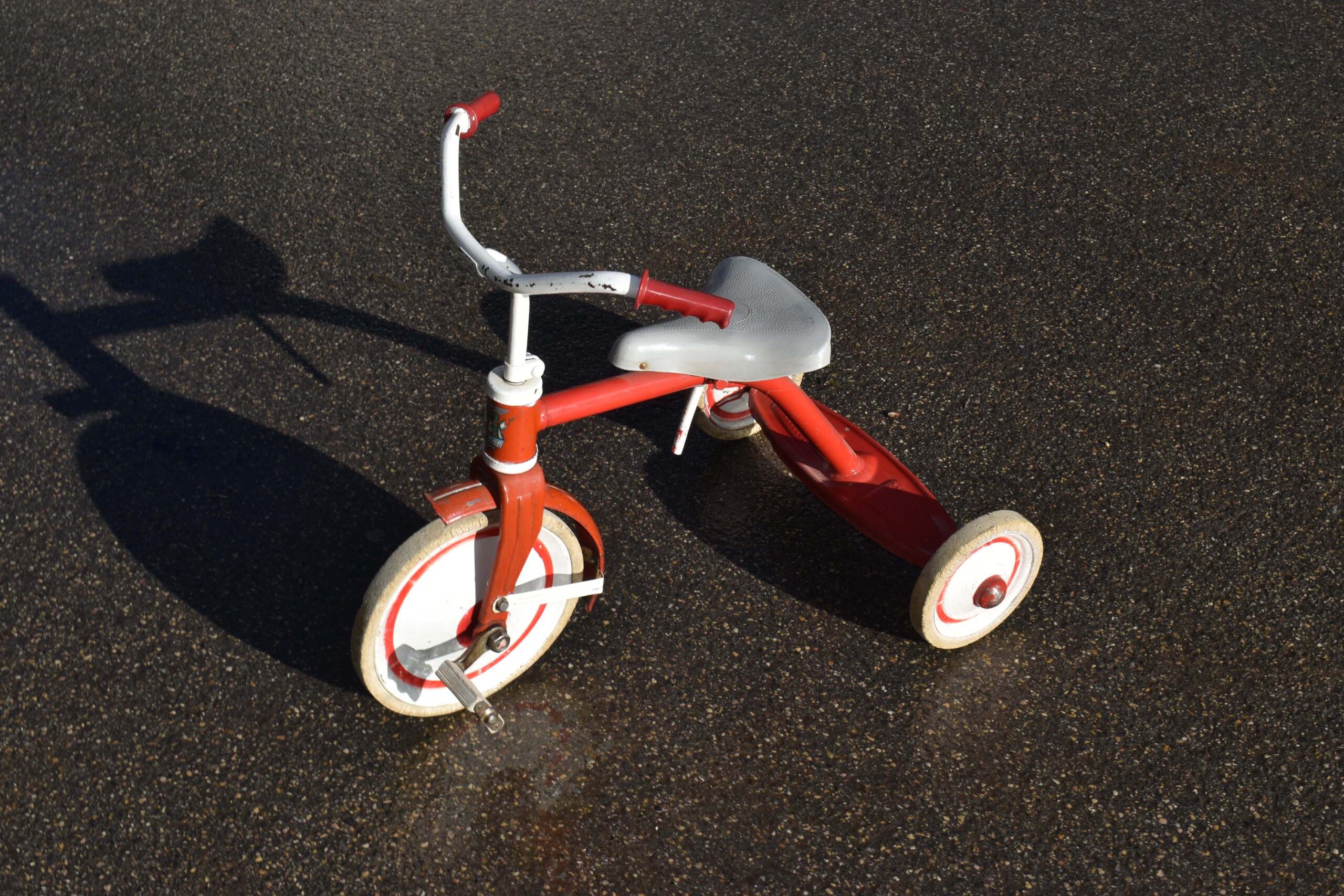 Tricycle Winther 1970s. C’est un petit tricycle pour enfants en bas âge, de la marque Danoise Winther. Avec le code couleur blanc et rouge, typique de l’époque.