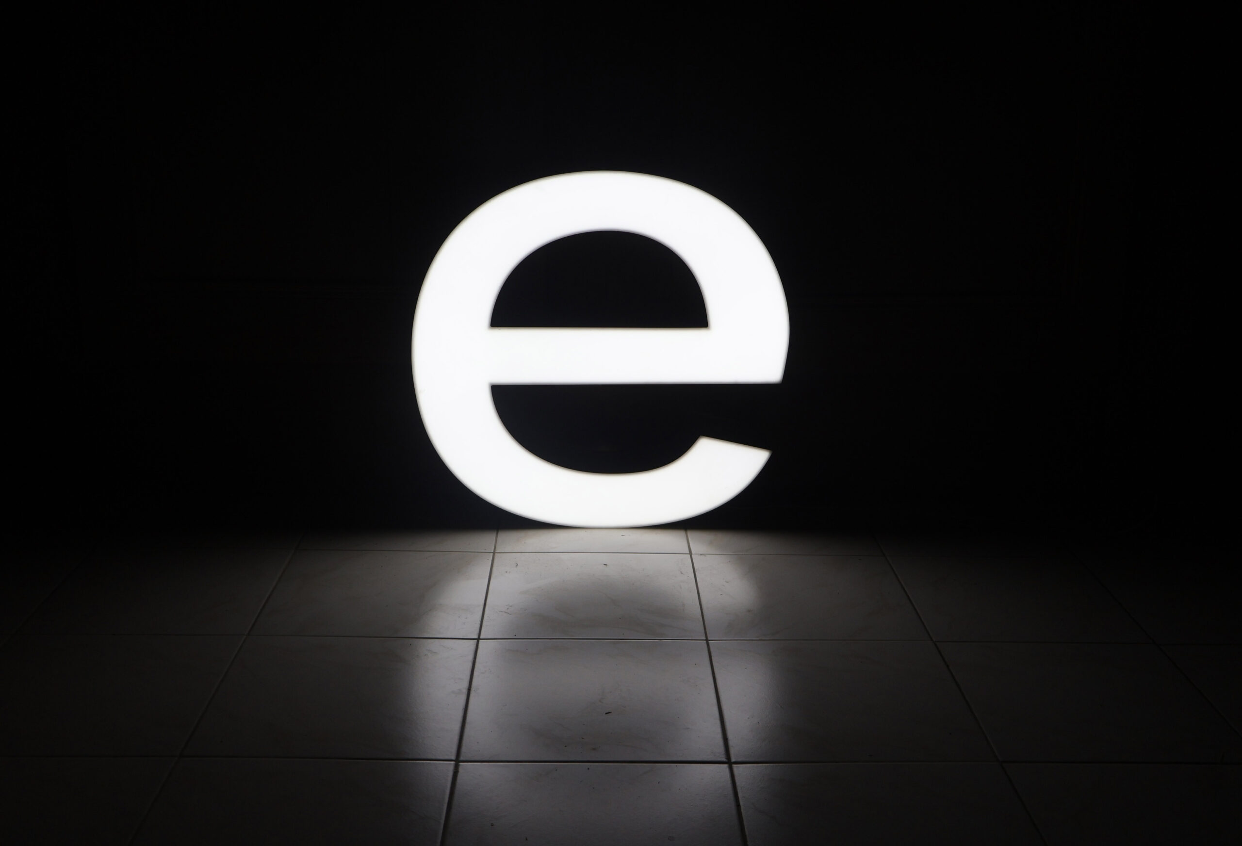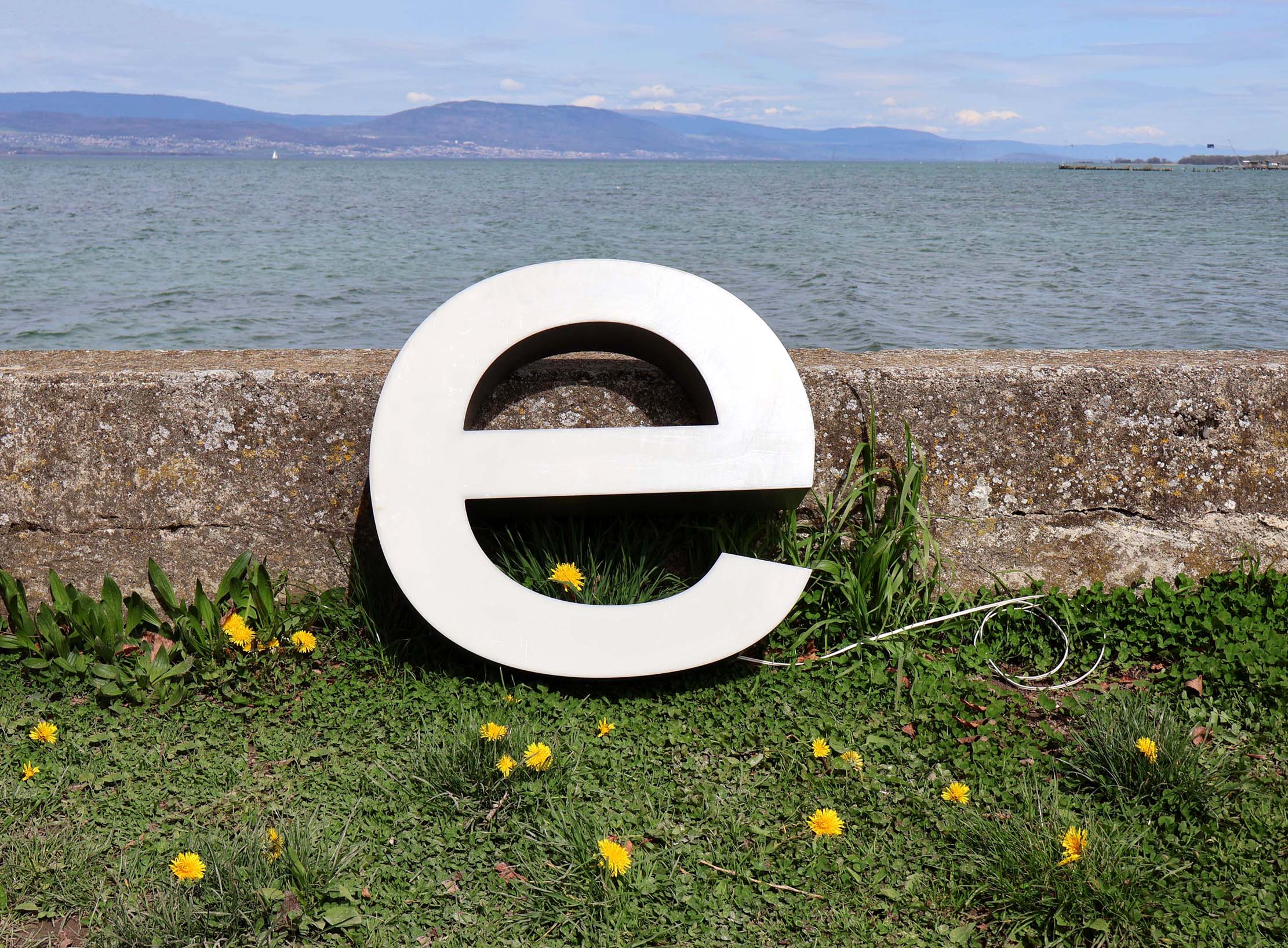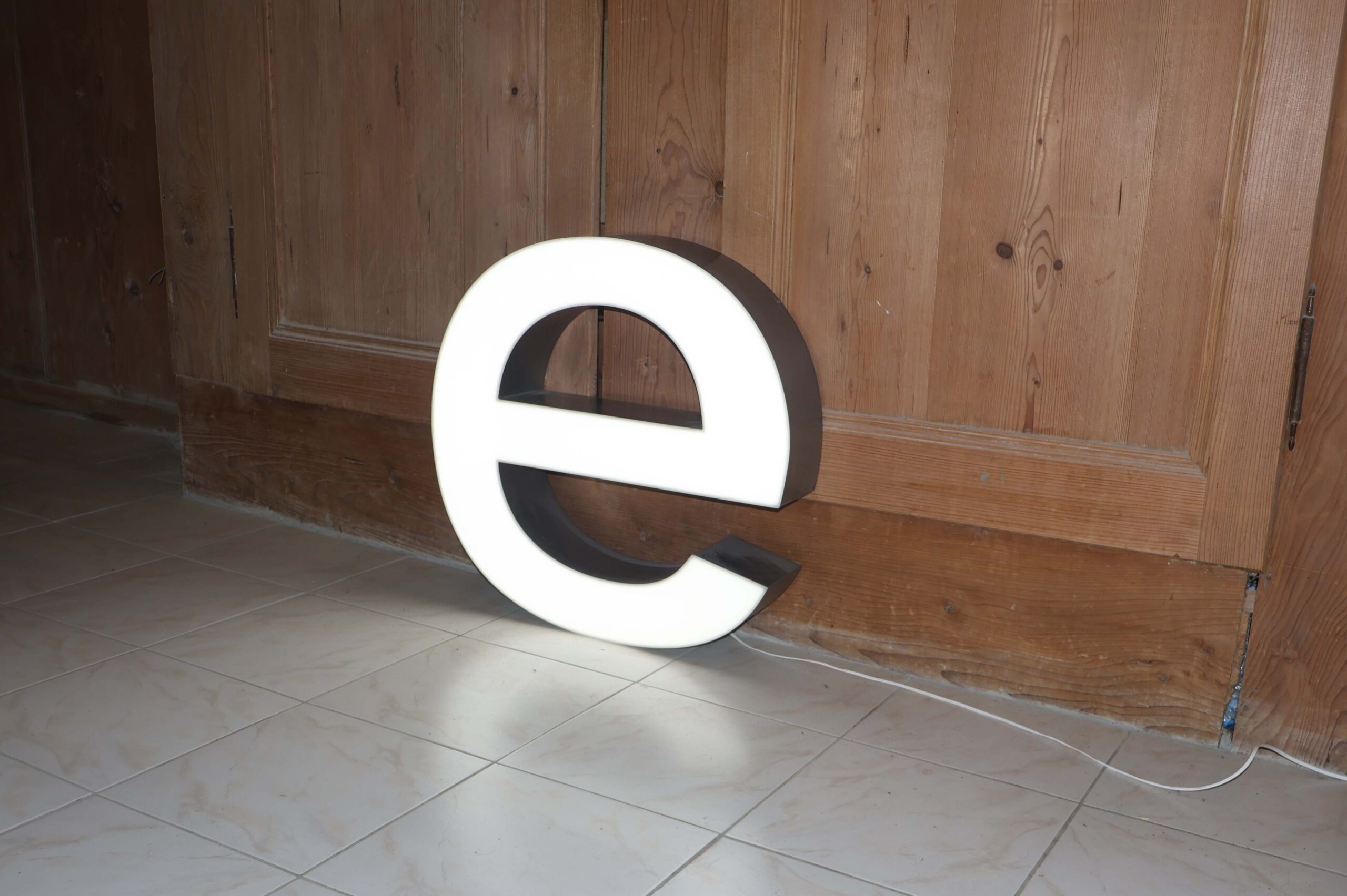 E lettre illuminée LED : C’est un grand e minuscule lumineux d’enseigne publicitaire. Provenant d’une enseigne qui était posée en Suisse, (historique connu).
