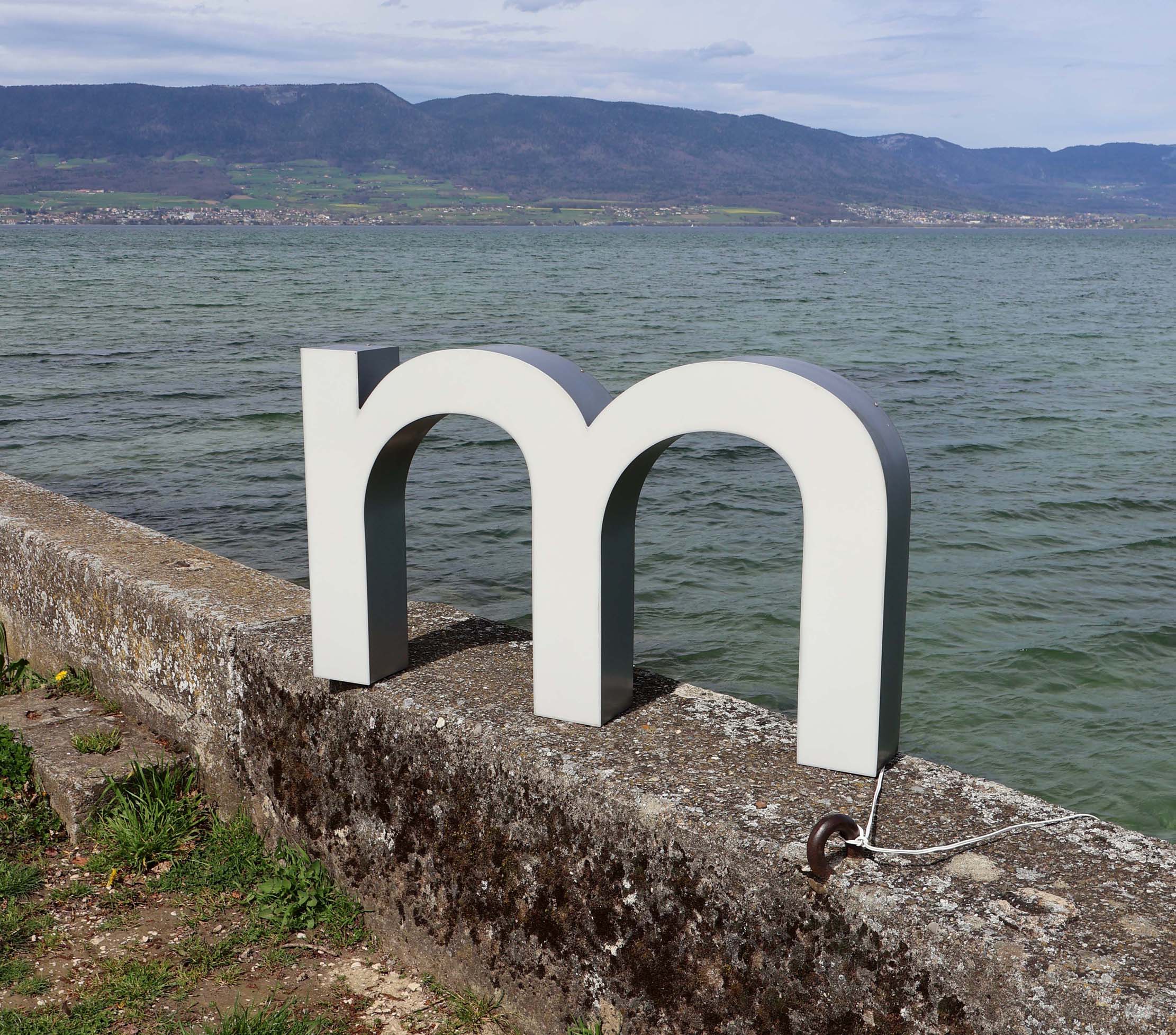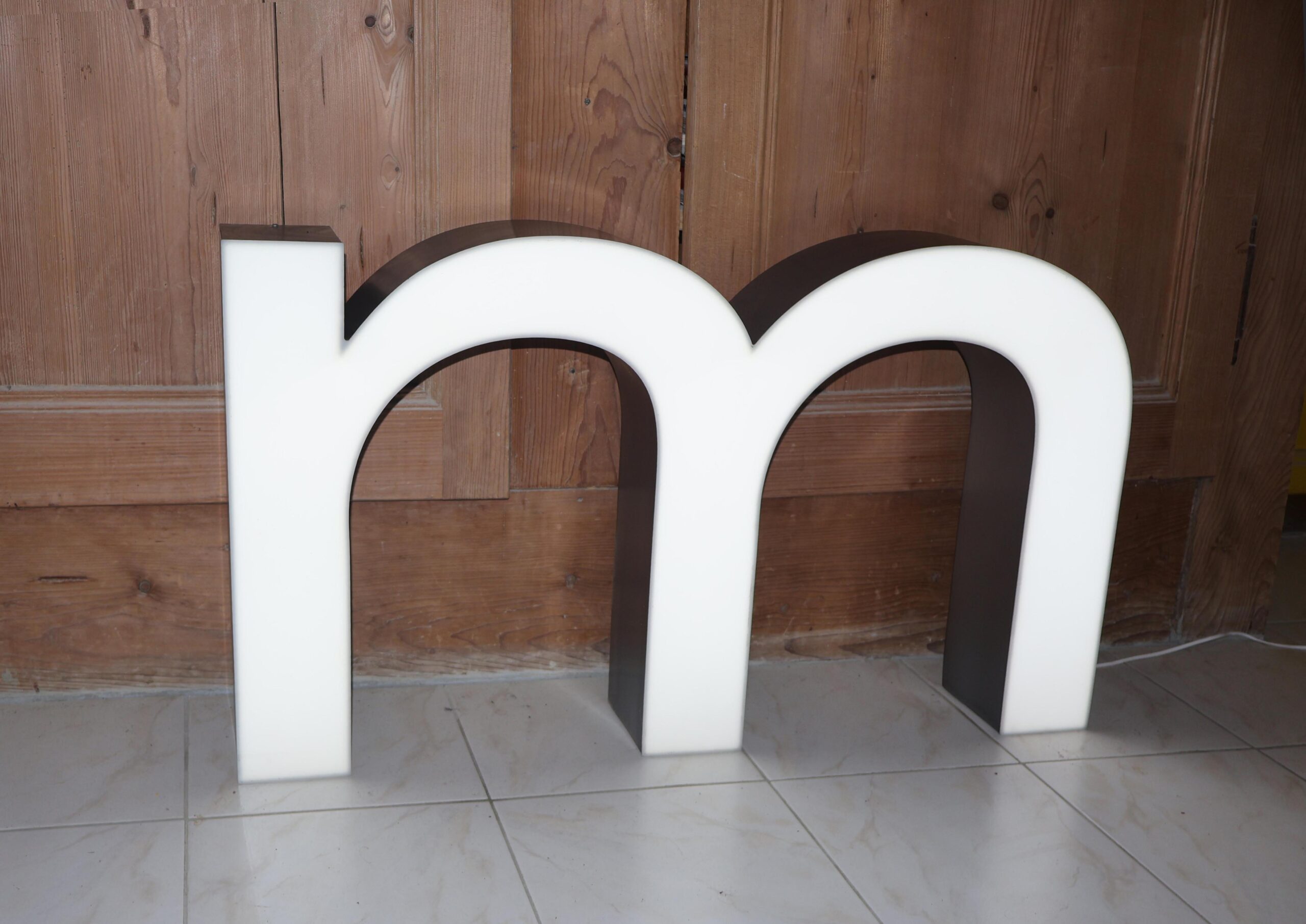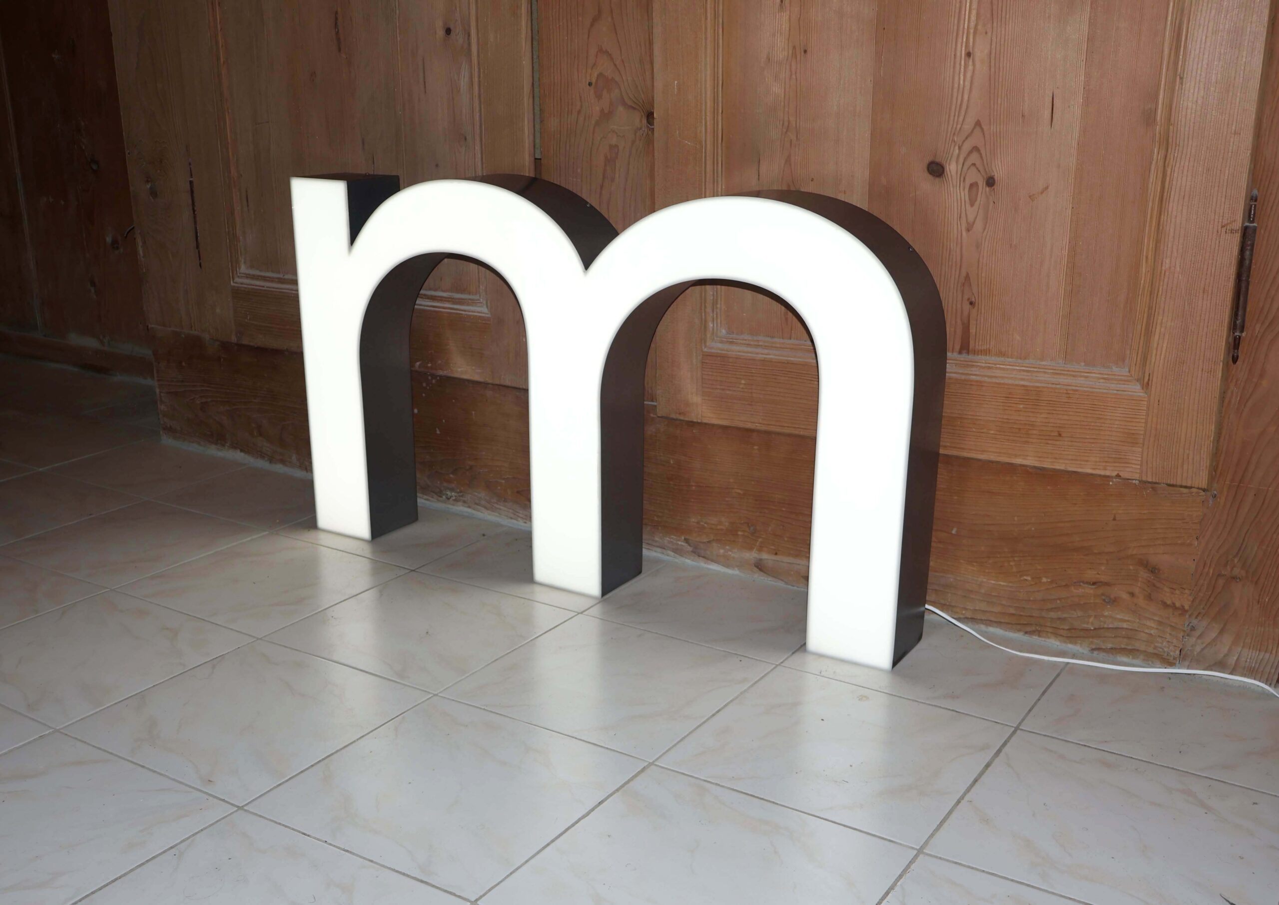 Grand M lumineux LED : Imposante lettre d’enseigne lumineuse, sous la forme d’un M minuscule. D’origine Suisse, historique connu, (communiqué lors de la vente).