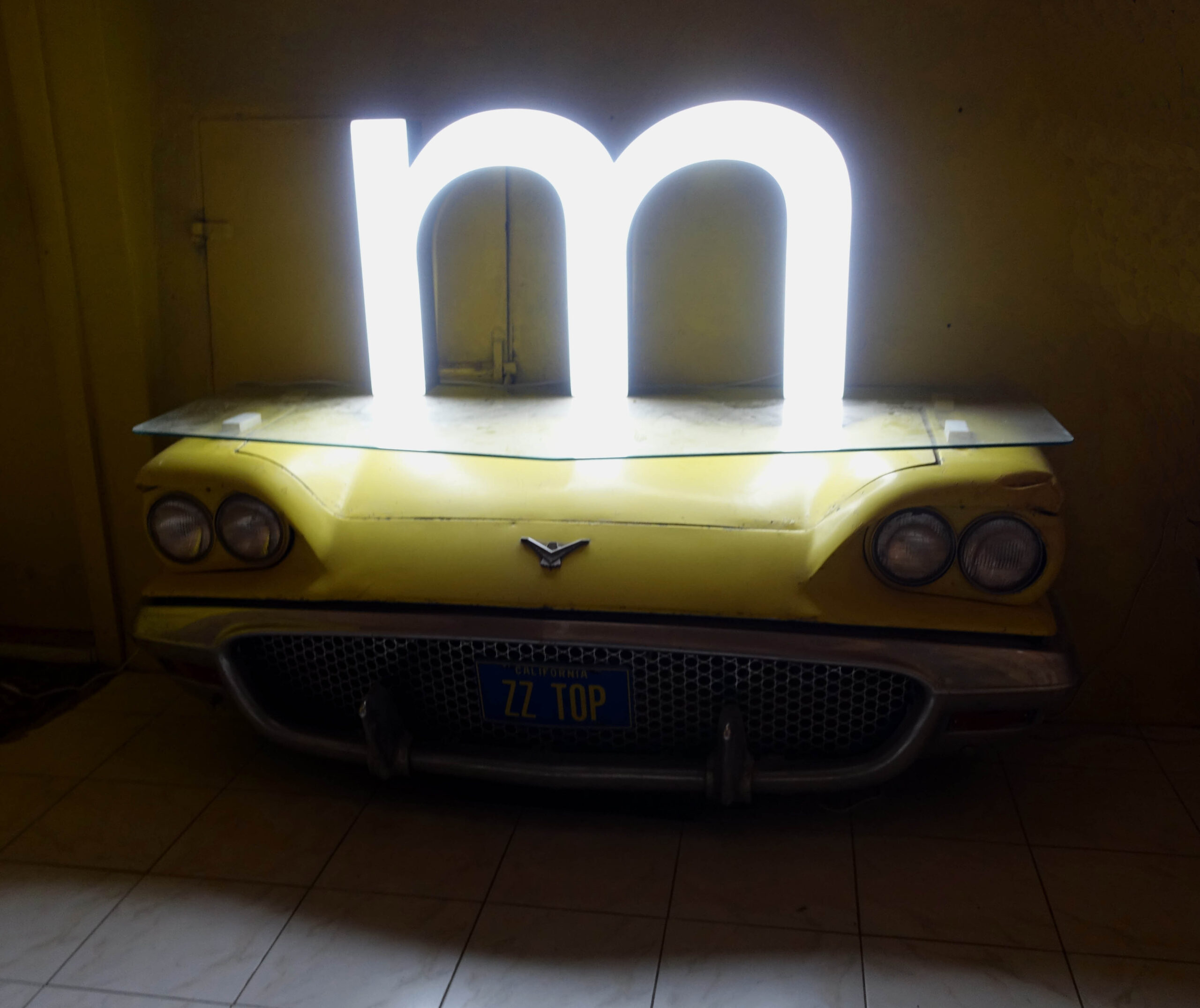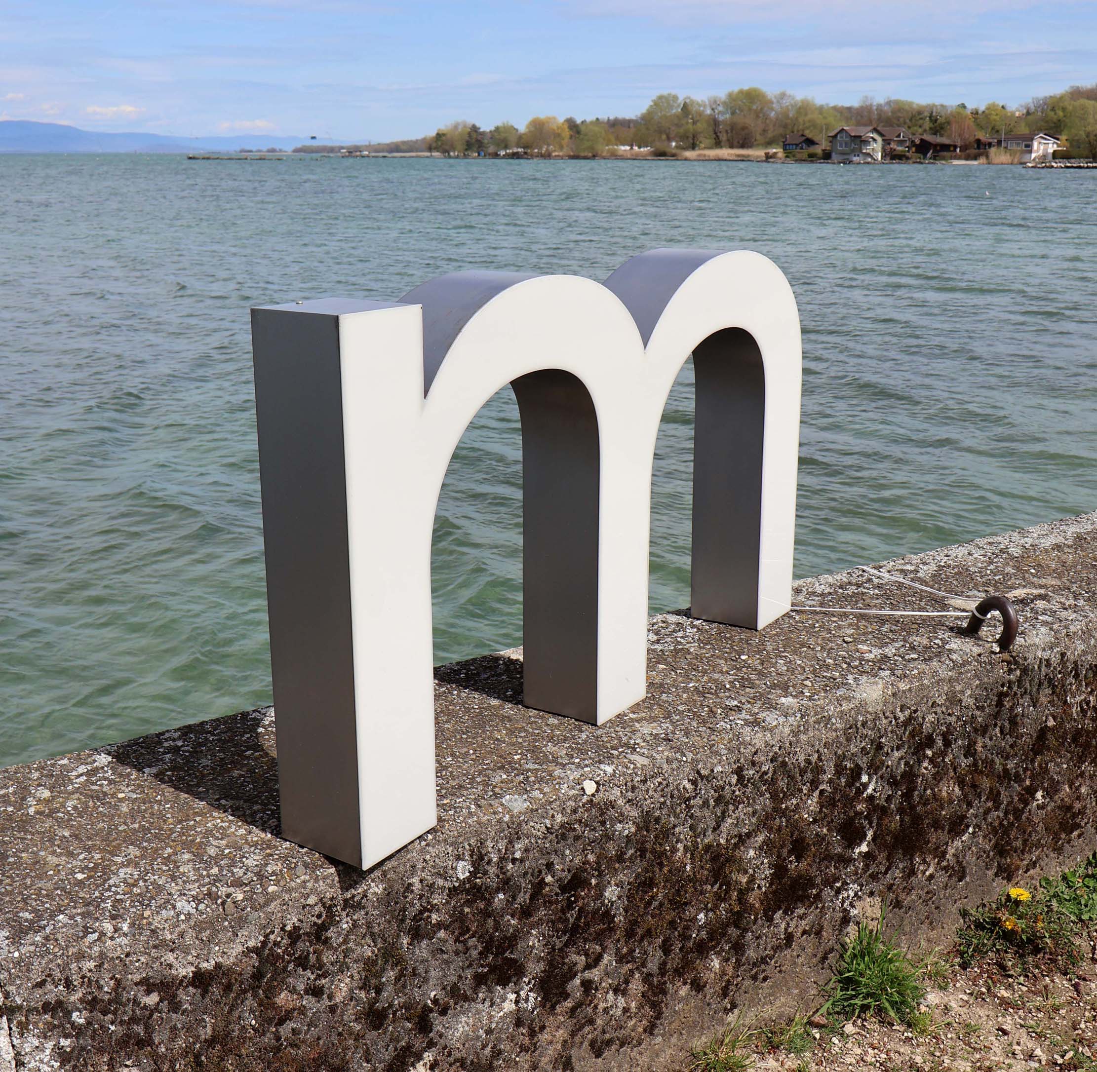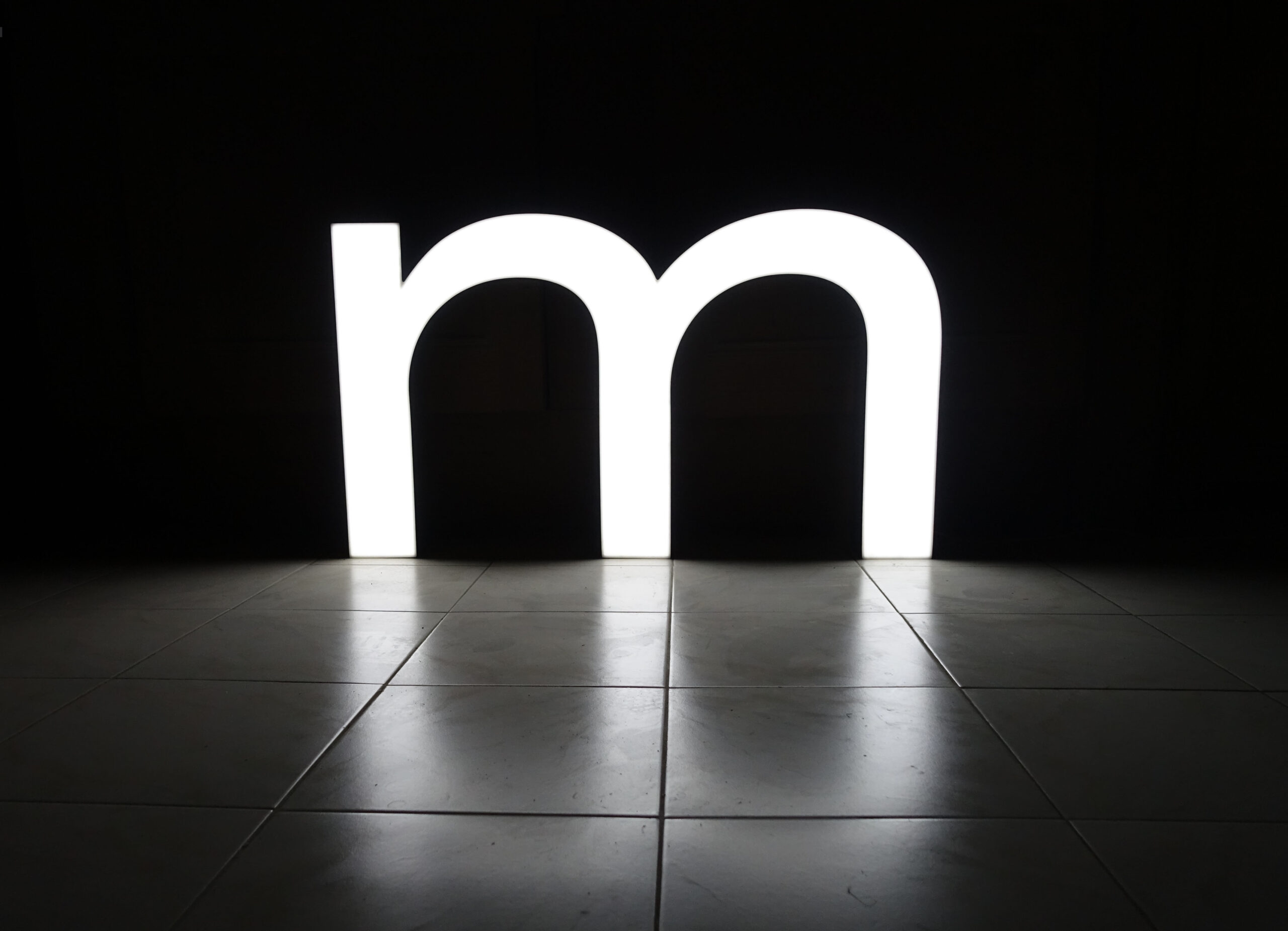 Grand M lumineux LED : Imposante lettre d’enseigne lumineuse, sous la forme d’un M minuscule. D’origine Suisse, historique connu, (communiqué lors de la vente).