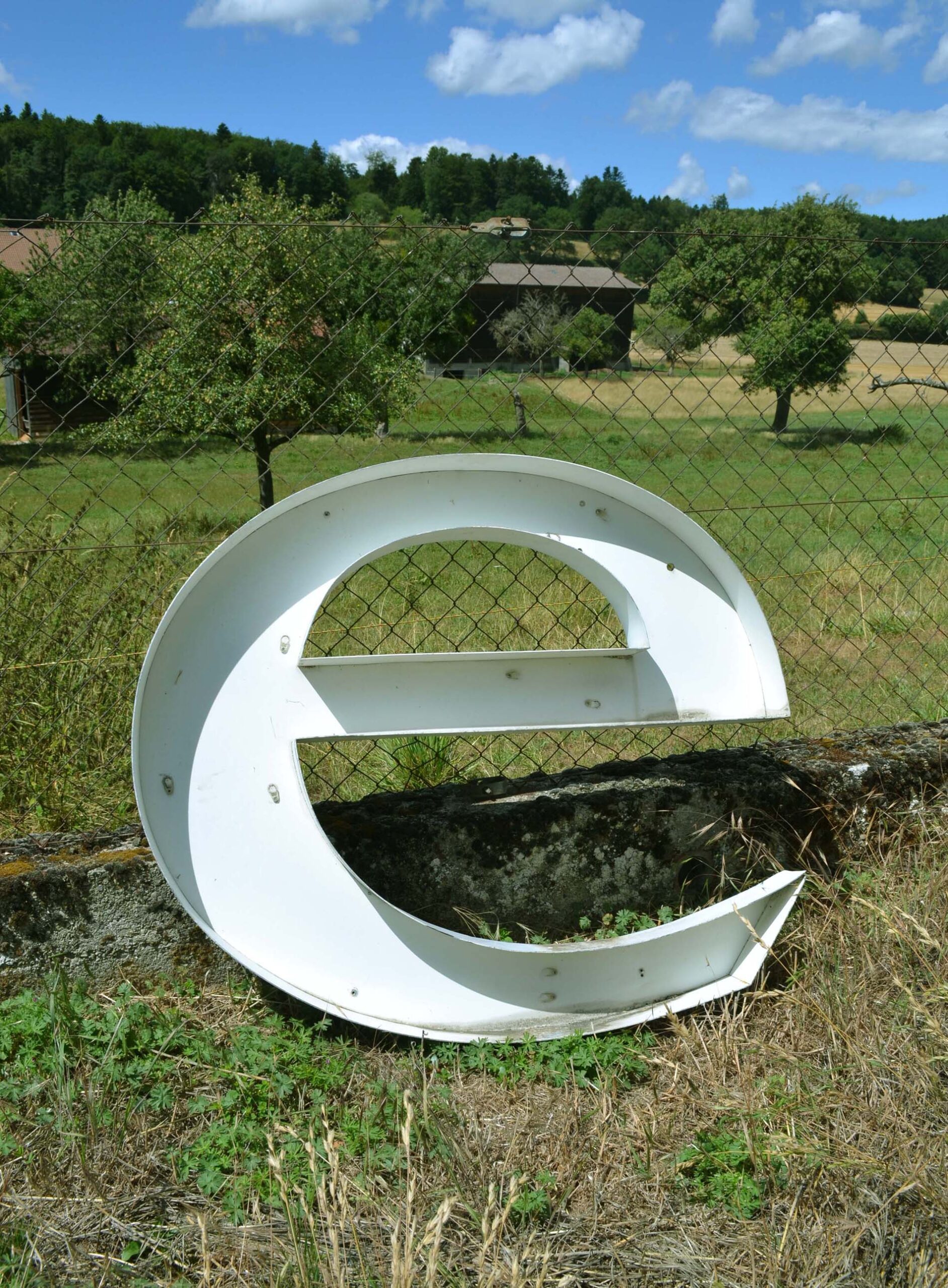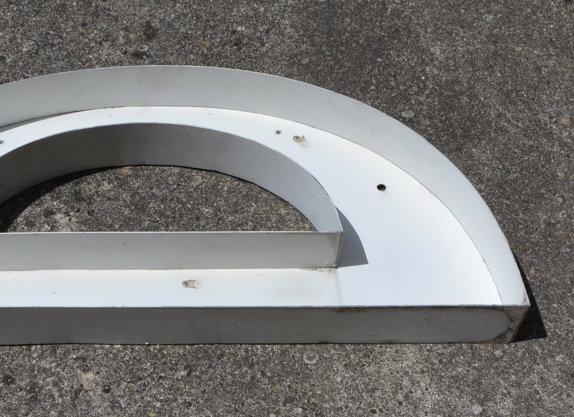 Grande lettre e minuscule d’enseigne publicitaire récup. A recycler en déco murale.
