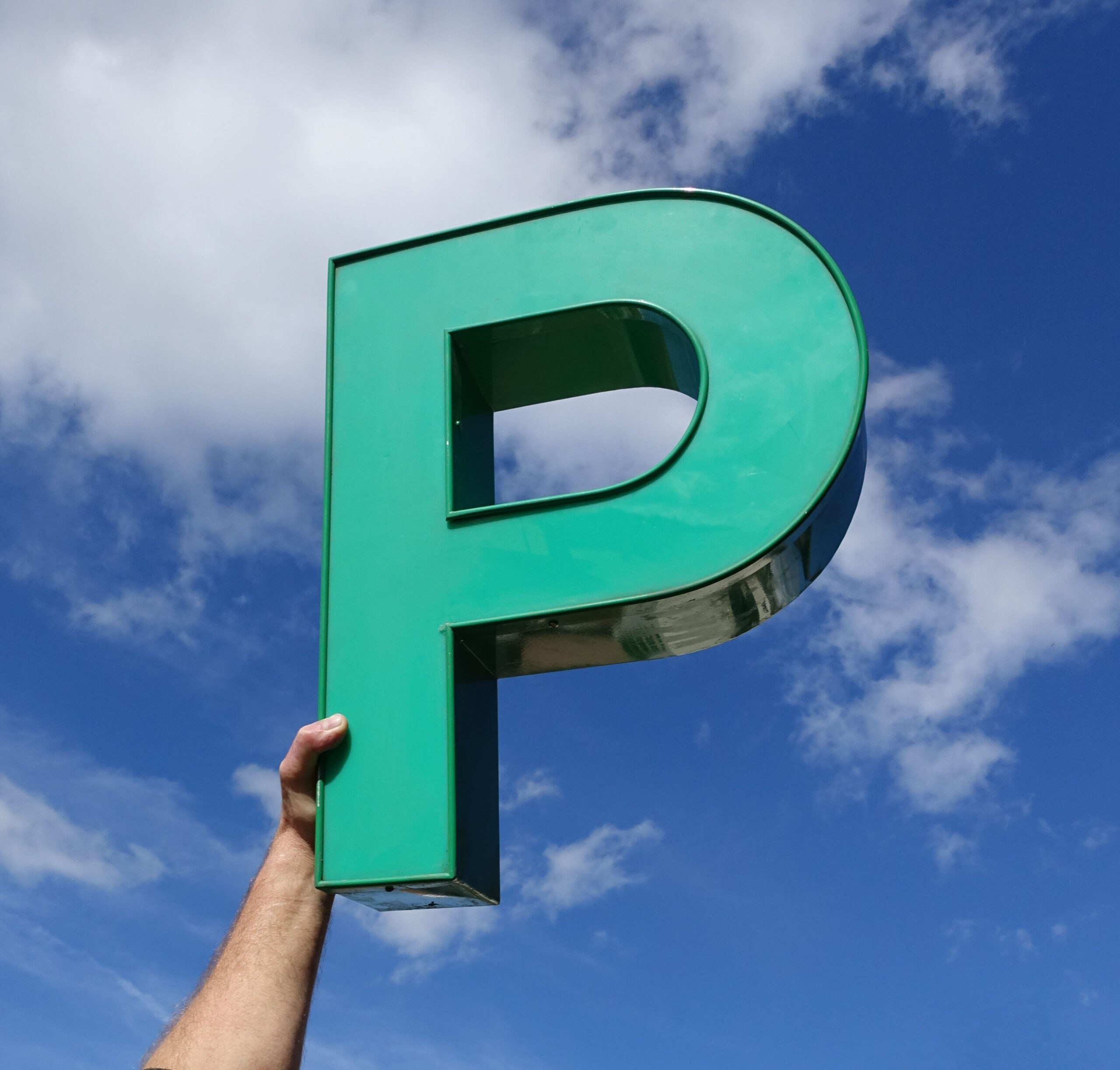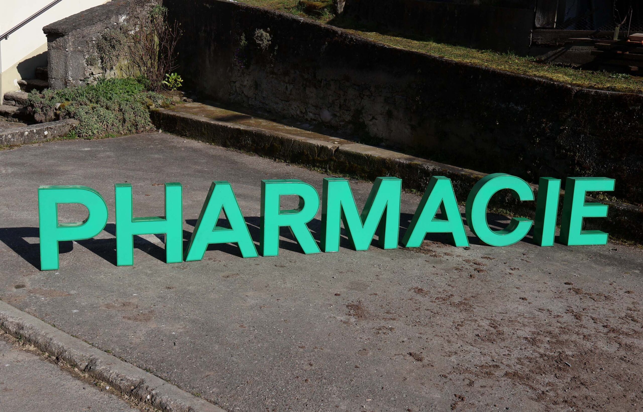 Elles formaient le mot “pharmacie”, (longueur totale environ 4 mètres). Hauteur 51cm, (pour le C = 54), épaisseur 11,5cm. Le P fait 40cm de large, le H 41, le A 49, R 41, M 55, C49, I10, E34, I vert foncé hauteur 55, largeur 10, profondeur 8,5m.