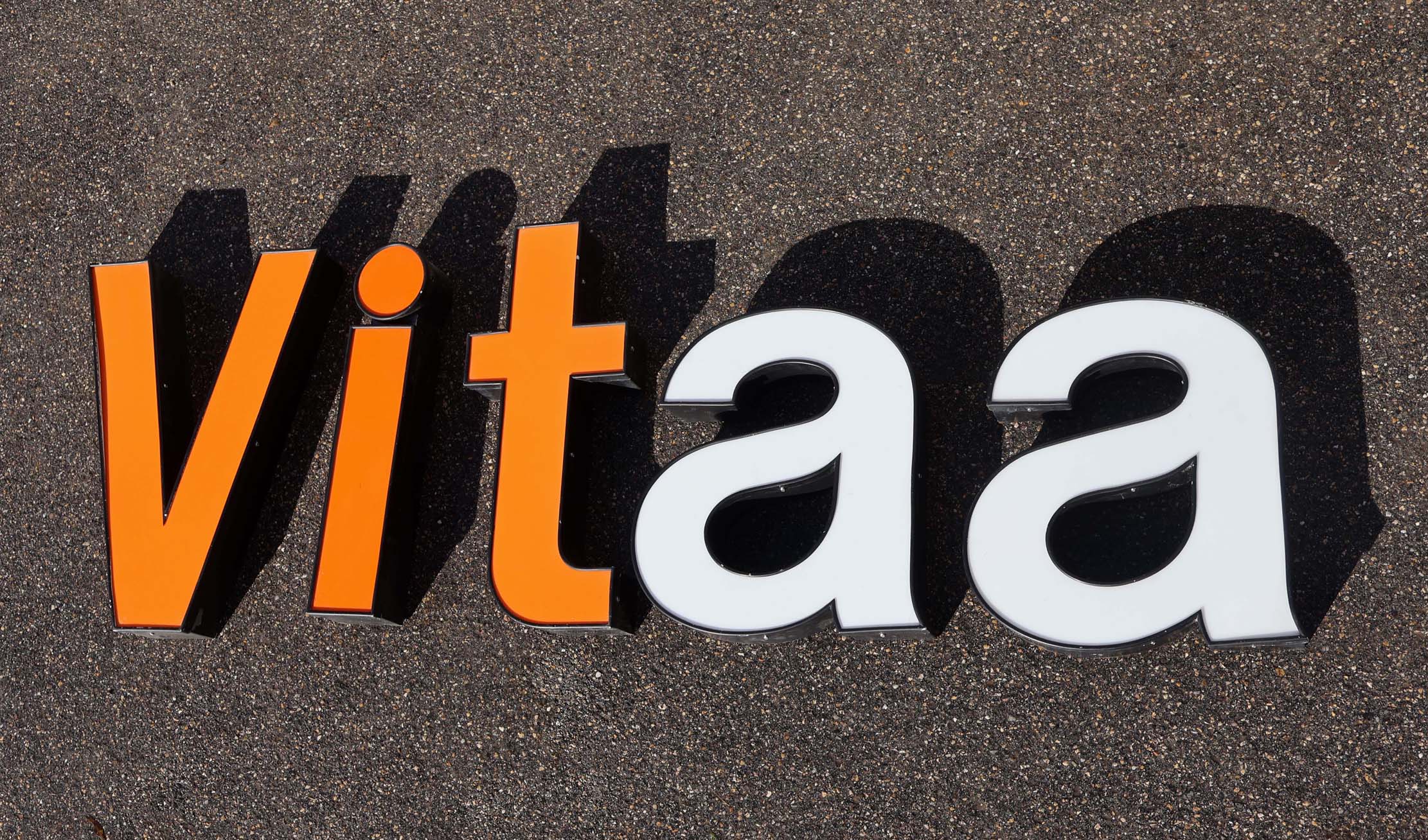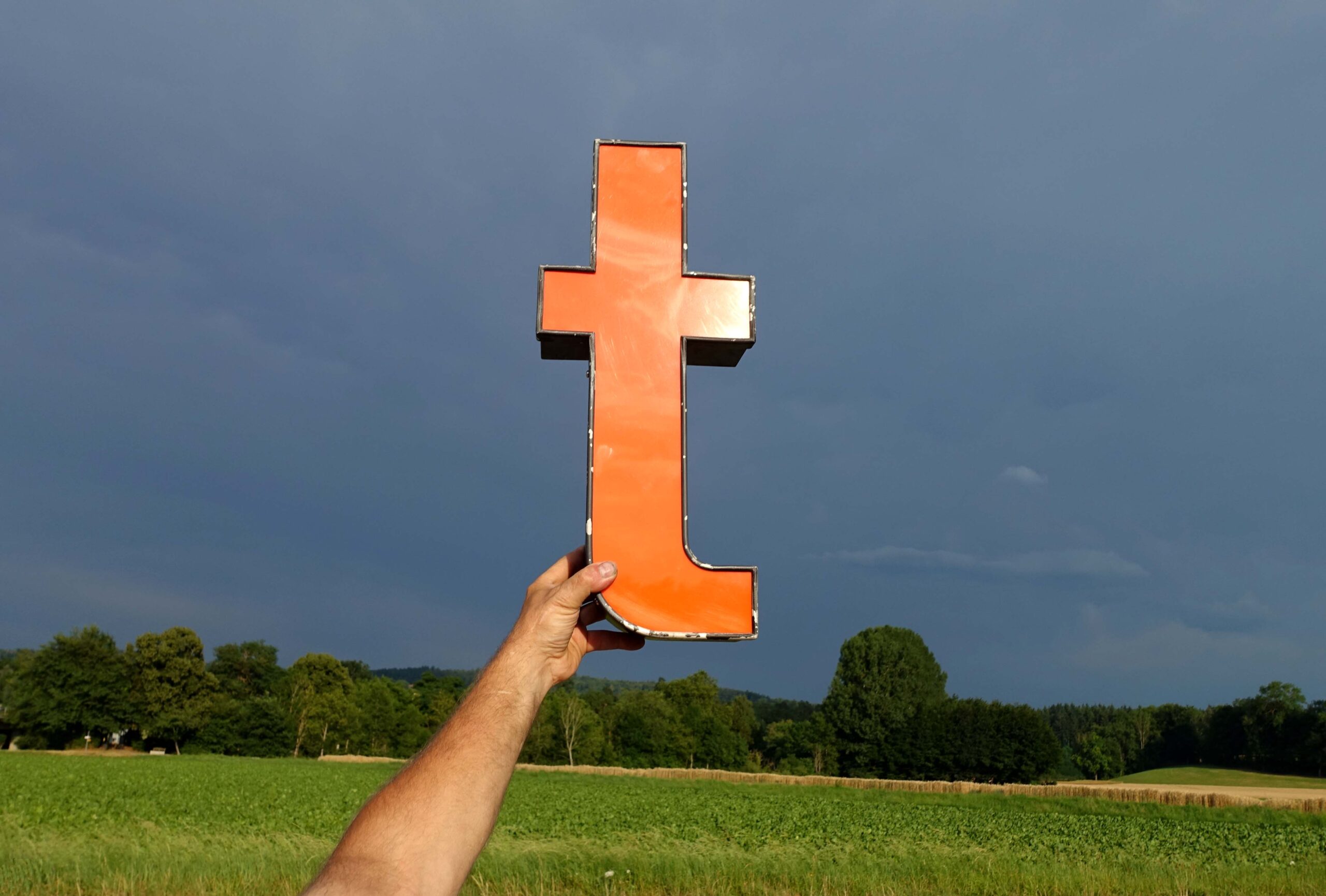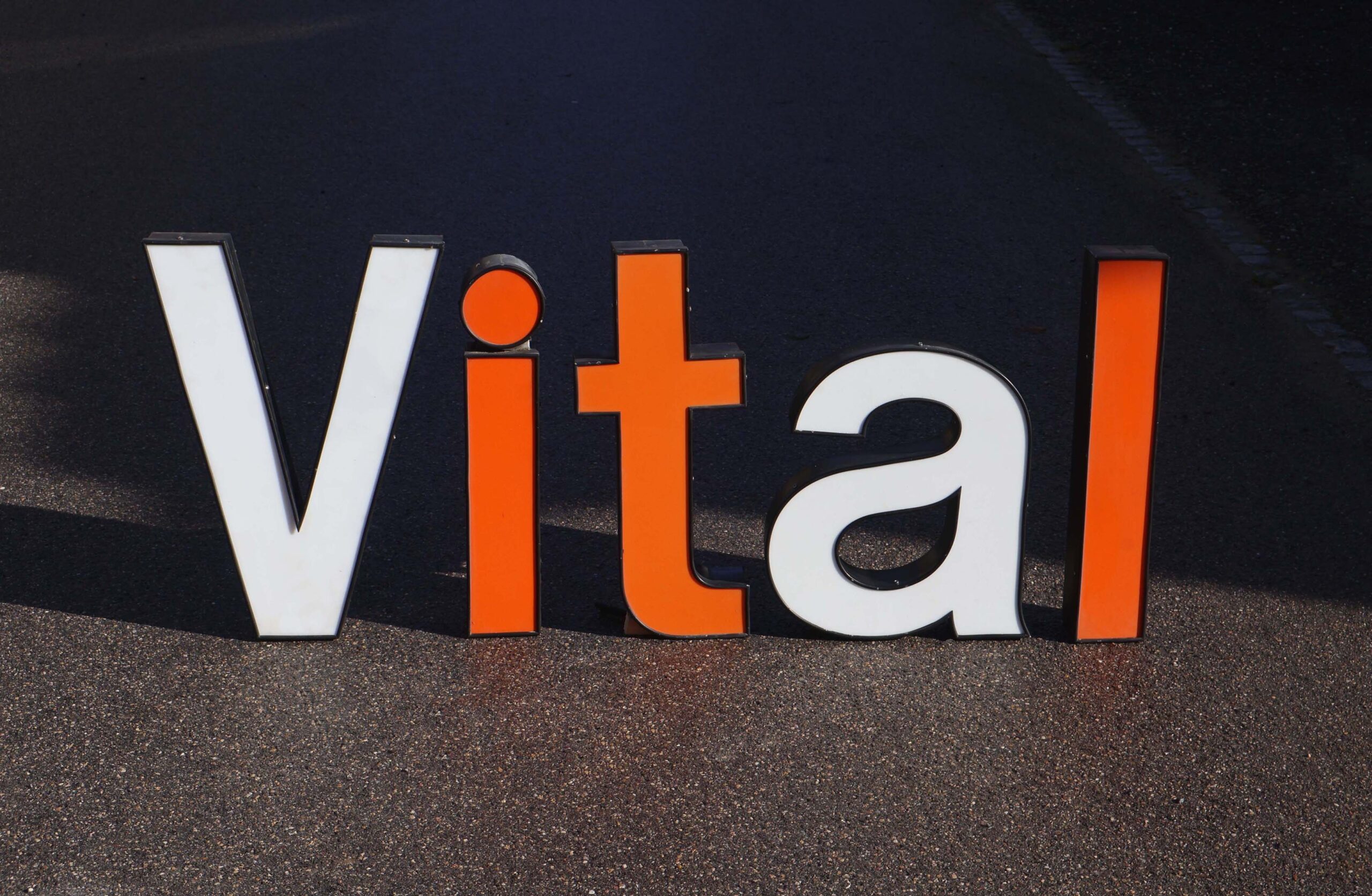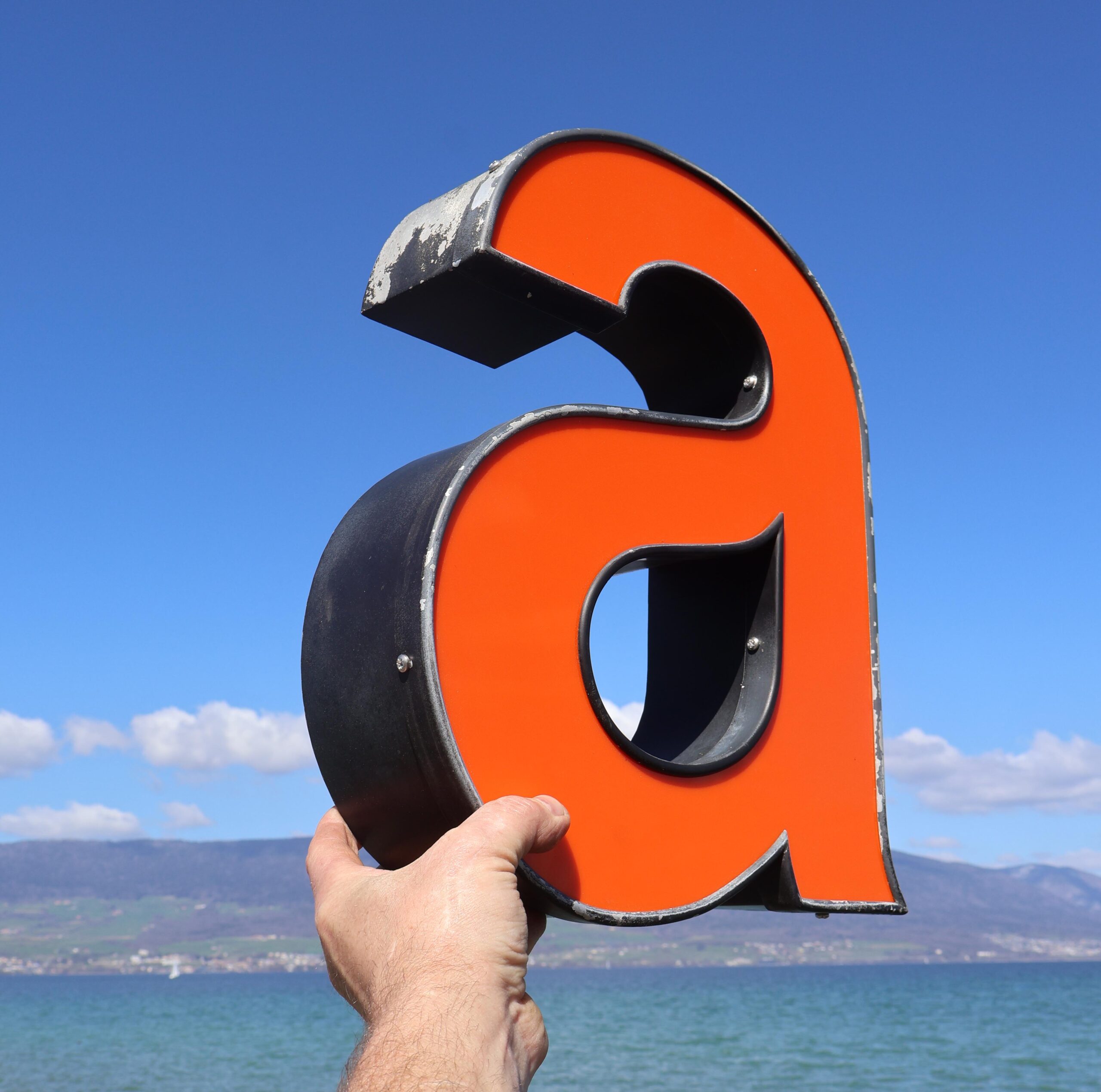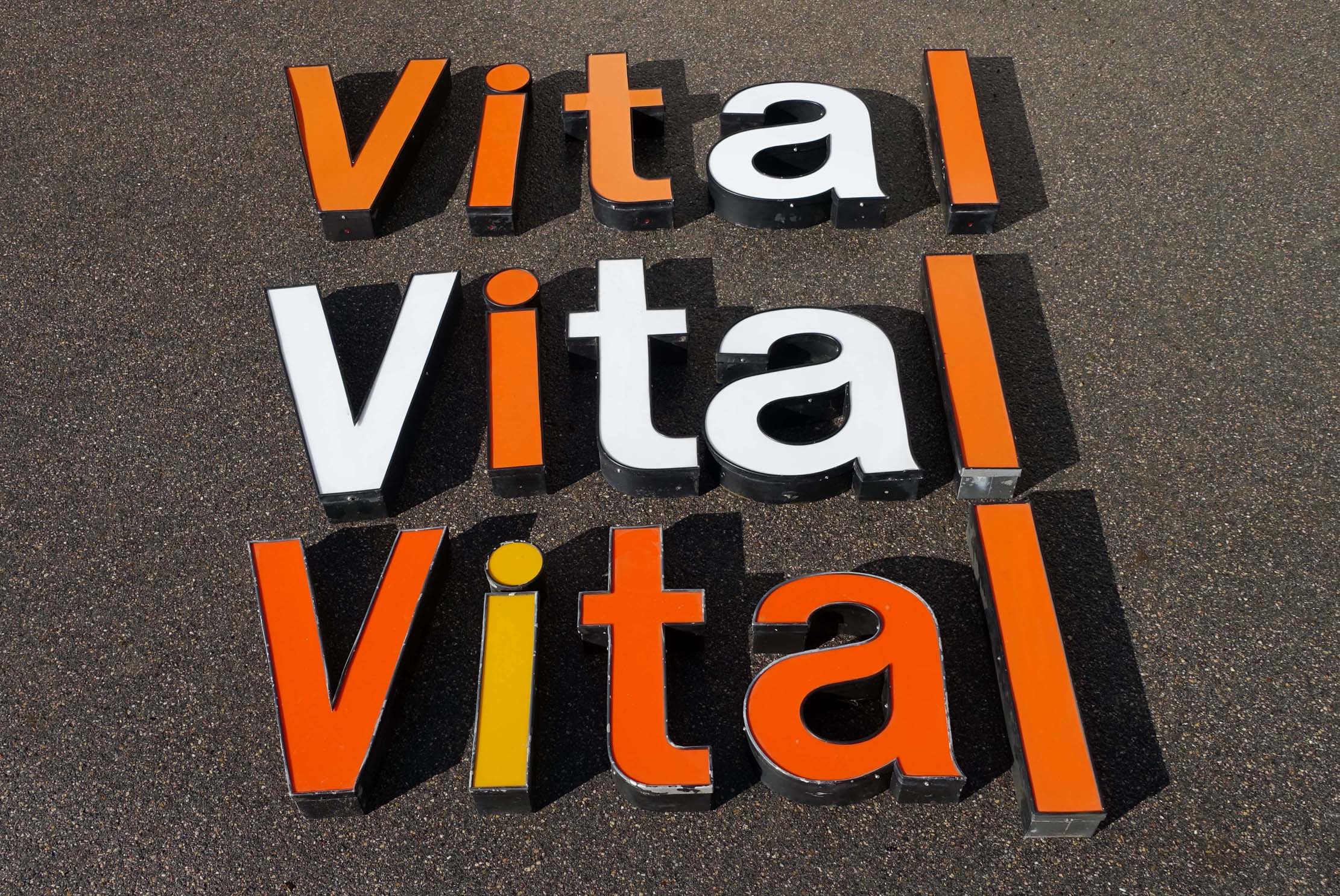 Lettres d’enseigne vital. D’origine Suisse, formant le mot / nom “Vital”. Je n’ai pas retrouvé l’historique de cette enseigne. Mais d’après le style, et la couleur orange, probablement des années 1970.
