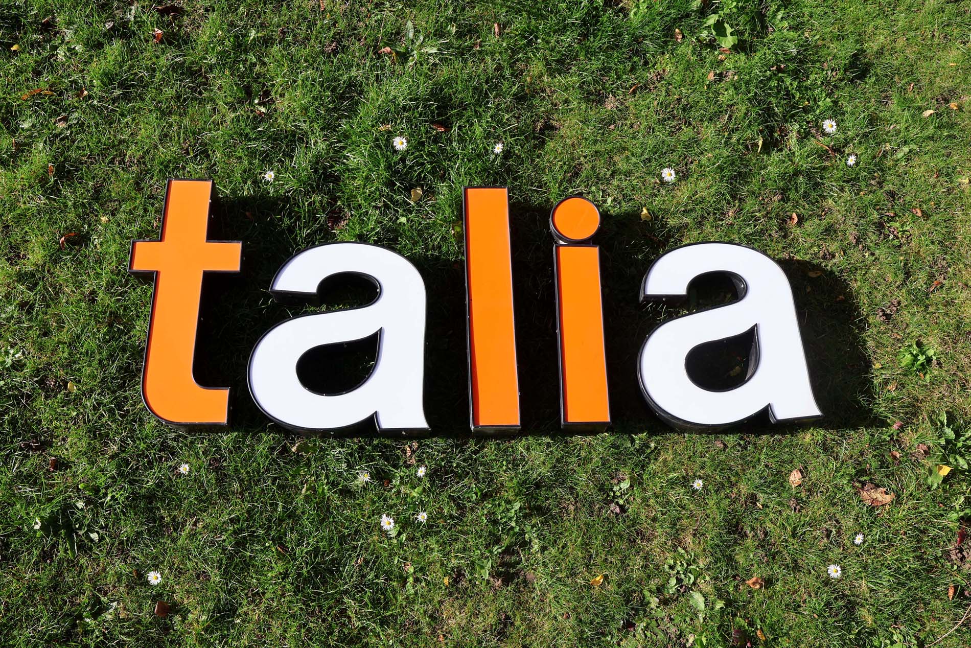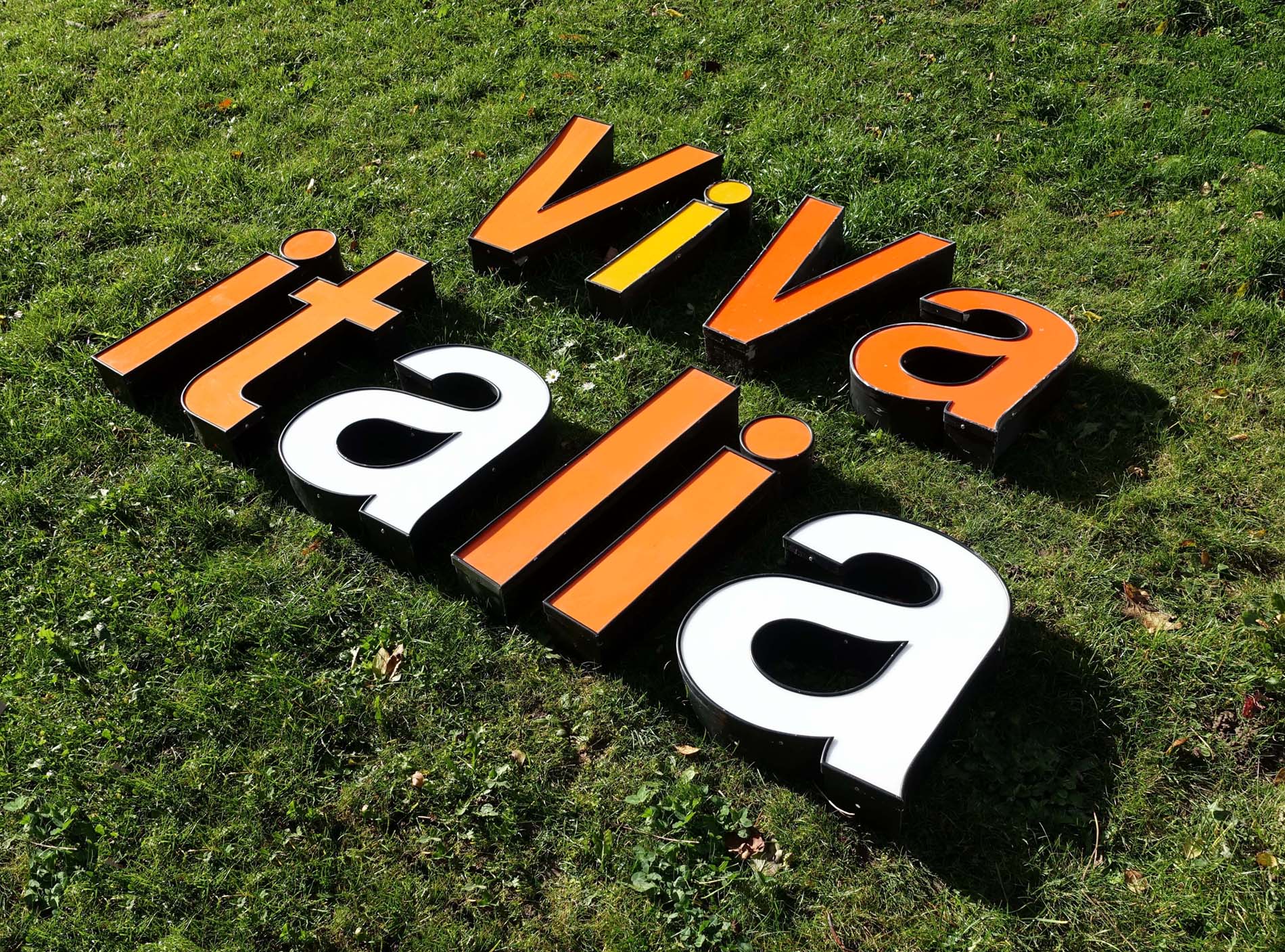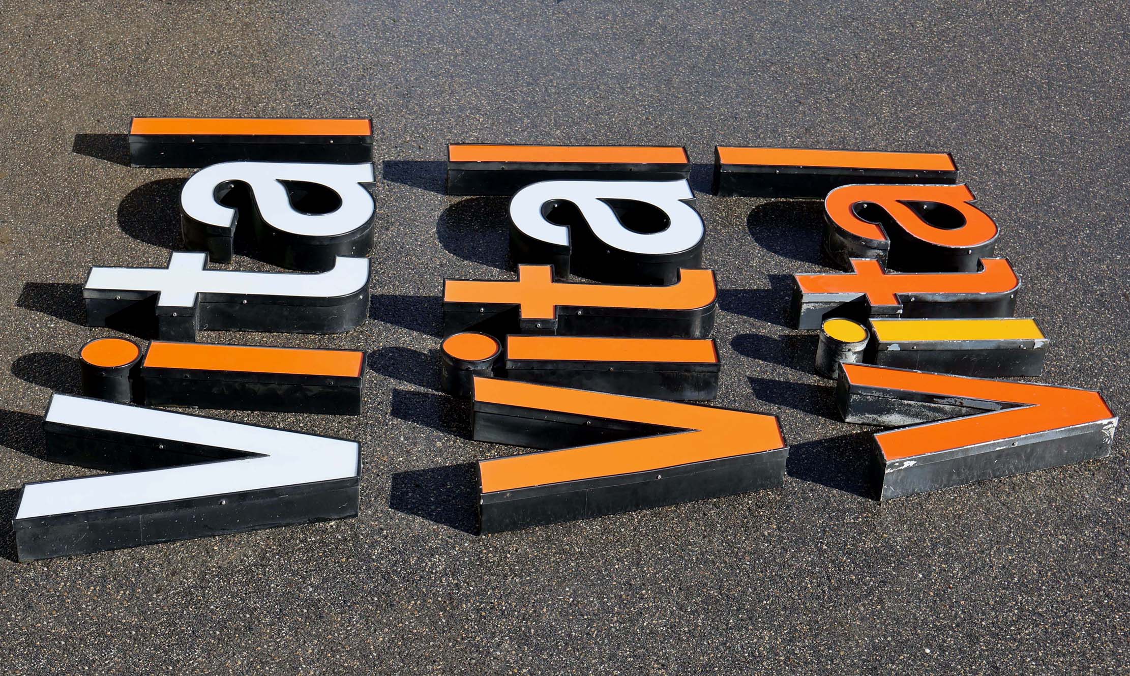 Ce sont des lettres “boitier” en alu. Vides, sans illumination, (les néons ont déjà été enlevés). Avec une typo Helvetica minuscule, (les V sont majuscule). Certains plexiglas était cassés, ou alors couleur trop défraichie. Je les ai donc retaillés en blanc, (et un i en jaune-orangé).