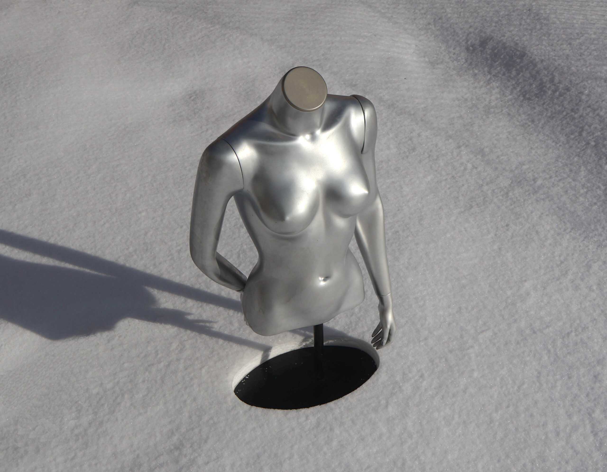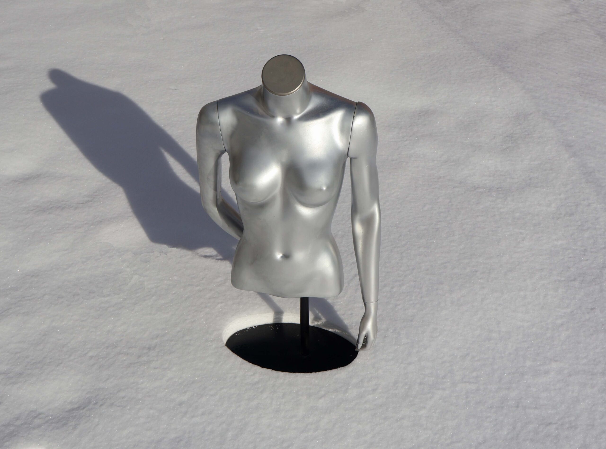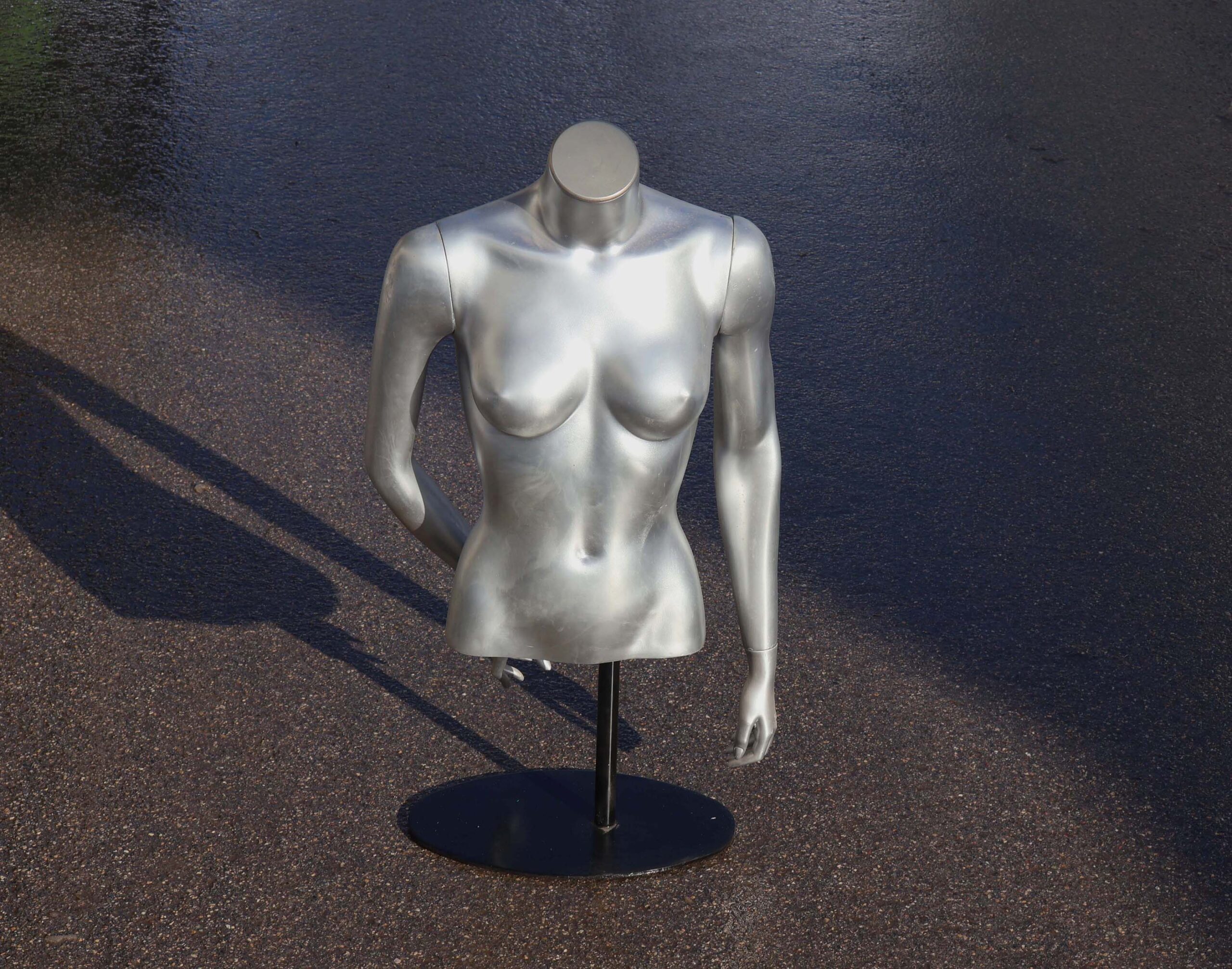 Buste de mannequin féminin peint en chrome. Sans tête, fixé sur un socle bas en acier. Avec 2 bras, et mains. Mannequin d’occasion femme, de boutique.